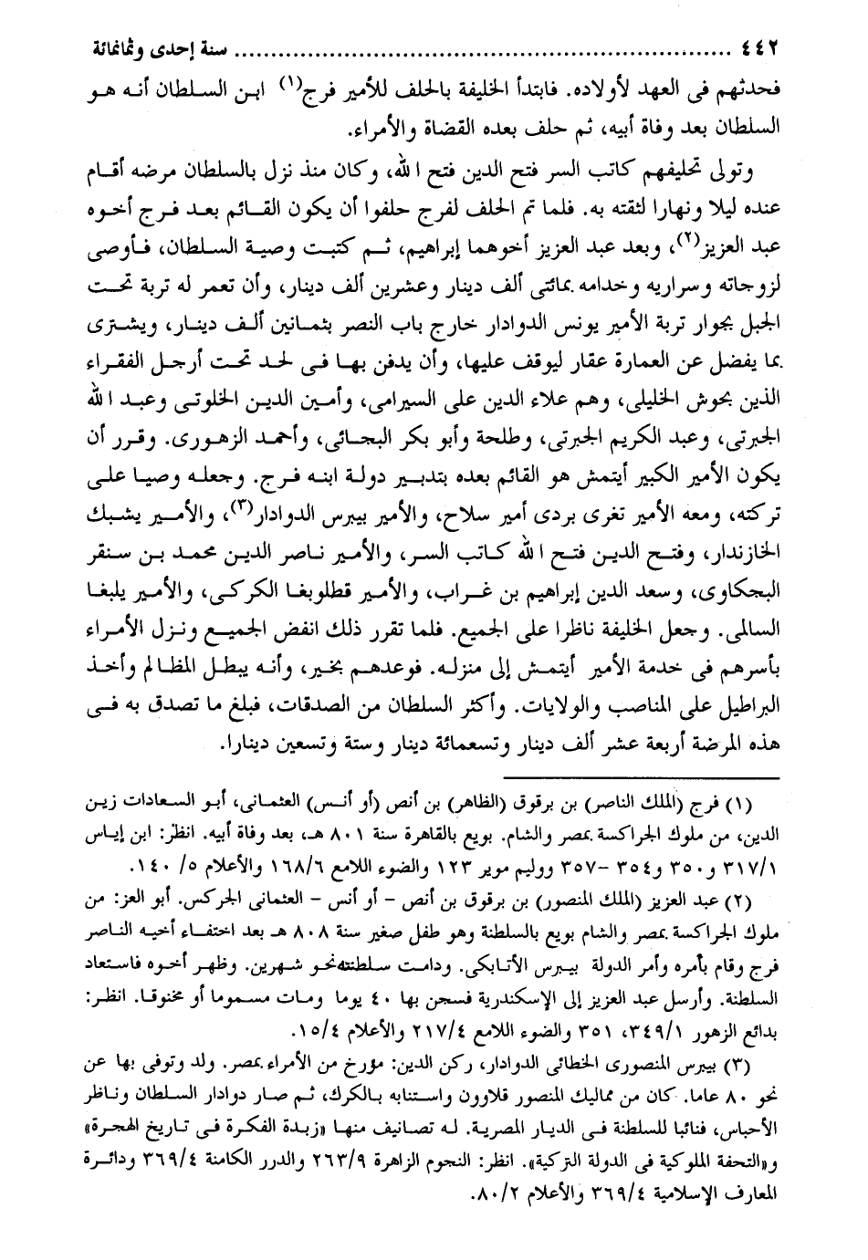 فَحَدثهُمْ فِي الْعَهْد لأولاده. فابتدأ الْخَلِيفَة بِالْحلف للأمير فرج ابْن السُّلْطَان أَنه هُوَ السُّلْطَان بعد وَفَاة أَبِيه ثمَّ حلف بعده الْقُضَاة والأمراء. وَتَوَلَّى تحليفهم كَاتب السِّرّ فتح الدّين فتح الله وَكَانَ مُنْذُ نزل بالسلطان مَرضه أَقَامَ عِنْده لَيْلًا وَنَهَارًا لِثِقَتِهِ بِهِ. فَلَمَّا تمّ الْحلف لفرج حلفوا أَن يكون الْقَائِم بعد فرج أَخُوهُ عبد الْعَزِيز وَبعد عبد الْعَزِيز أخوهما إِبْرَاهِيم ثمَّ كتبت وَصِيَّة السُّلْطَان فأوصى لزوجاته وسراريه وخدامه. بِمِائَتي ألف دِينَار وَعشْرين ألف دِينَار وَأَن تعمر لَهُ تربة تَحت الْجَبَل بجوار تربة الْأَمِير يُونُس الدوادار خَارج بَاب النَّصْر بِثَمَانِينَ ألف دِينَار ويشترى بِمَا يفضل عَن الْعِمَارَة عقار ليوقف عَلَيْهَا وَأَن يرفن بهَا فِي لحد تَحت أرجل الْفُقَرَاء الَّذين بحوش الخليلي وهم عَلَاء الدّين عَليّ السيرامي وَأمين الدّين الخلوتي وَعبد الله الجبرتي وَعبد الْكَرِيم الجبرتي وَطَلْحَة وَأَبُو بكر البجائي وَأحمد الزهوري. وَقرر أَن يكون الْأَمِير الْكَبِير أيتمش هُوَ الْقَائِم بعده بتدبير دولة ابْنه فرج. وَجعله وَصِيّا على تركته وَمَعَهُ الْأَمِير تغري بردي أَمِير سلَاح والأمير بيبرس الدوادار والأمير يشبك الخازندار وَفتح الدّين فتح الله كَاتب السِّرّ والأمير نَاصِر الدّين مُحَمَّد بن سنقر البجكاوي وَسعد الدّين إِبْرَاهِيم بن غراب والأمير قطلوبغا الكركي والأمير يلبغا السالمي. وَجعل الْخَلِيفَة نَاظرا على الْجَمِيع. فَلَمَّا تقرر ذَلِك انفض الْجَمِيع وَنزل الْأُمَرَاء بأسرهم فِي خدمَة الْأَمِير أيتمش إِلَى منزله. فَوَعَدَهُمْ بِخَير وَأَنه يبطل الْمَظَالِم وَأخذ البراطيل على المناصب والولايات. وَأكْثر السُّلْطَان من الصَّدقَات فَبلغ مَا تصدق بِهِ فِي هَذِه المرضة أَرْبَعَة عشر ألف دِينَار وَتِسْعمِائَة دِينَار وَسِتَّة وَتِسْعين دِينَارا.