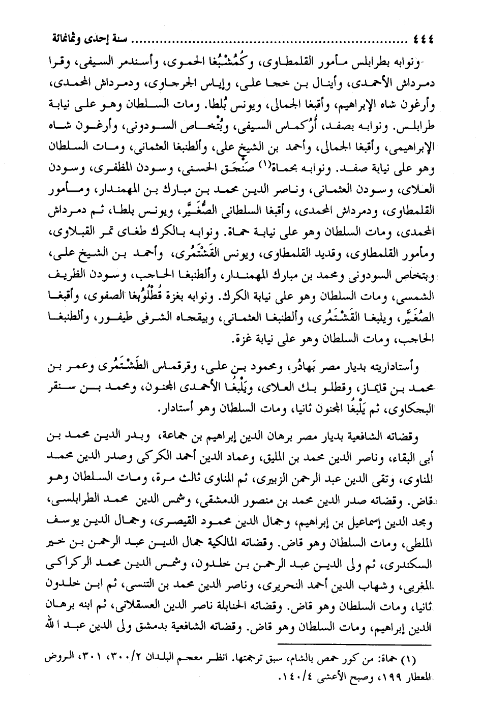 ونوابه بطرابلس مَأْمُور القلمطاوي وكُمُشبُغا الْحَمَوِيّ وأسندمر السيفي وقرا دمرداش الأحمدي وأينال بن خجا عَليّ وَإيَاس الجرجاوي ودمرداش المحمدي وأرغون شاه الإبراهيمي وأقبغا الجمالي وَيُونُس بُلطا. وَمَات السُّلْطَان وَهُوَ على نِيَابَة طرابلس. ونوابه بصفد أُرُكماس السيفي وبُتْخاص السودوني وأرغون شاه الإبراهيمي وأقبغا الجمالي وَأحمد بن الشَّيْخ عَليّ وألطنبغا العثماني وَمَات السُّلْطَان وَهُوَ على نِيَابَة صفد. ونوابه بحماة صَنجَق الحسني وسودن المظفري وسودن العلاي وسودن العثماني وناصر الدّين مُحَمَّد بن مبارك بن المهمندار ومأمور القلمطاوي ودمرداش المحمدي وأقبغا السلطاني الصُّغَيَّر وَيُونُس بلطا ثمَّ دمرداش المحمدي وَمَات السُّلْطَان وَهُوَ على نِيَابَة حماة. ونوابه بالكرك طغاي تمر القبلاوي ومأمور القلمطاوي وقديد القلمطاوي وَيُونُس القَشْتَمُري وَأحمد بن الشَّيْخ عَليّ وبتخاص السودوني وَمُحَمّد بن مبارك المهمندار وألطبغا الْحَاجِب وسودن الظريف الشمسي وَمَات السُّلْطَان وَهُوَ على نِيَابَة الكرك. ونوابه بغزة قُطْلُوُبغا الصفوي وأقبغا الصُغَيَّر ويلبغا القَشْتَمُري وألطنبغا العثماني وبيقجاه الشرفي طيفور وألطنبغا الْحَاجِب وَمَات السُّلْطَان وَهُوَ على نِيَابَة غَزَّة. وأستاداريته بديار مصر بَهادُر ومحمود بن علس وقرقماس الطشتمري وَعمر بن مُحَمَّد بن قايماز وقطلو بك العلاي ويَلْبغُا الأحمدي الْمَجْنُون وَمُحَمّد بن سنقر البجكاوي ثمَّ يَلْبغُا الْمَجْنُون ثَانِيًا وَمَات السُّلْطَان وَهُوَ أستادار. وقضاته الشَّافِعِيَّة بديار مصر برهَان الدّين إِبْرَاهِيم بن جمَاعَة وَبدر الدّين مُحَمَّد بن أبي الْبَقَاء وناصر الدّين مُحَمَّد بن المليق وعماد الدّين أَحْمد الكركي وَصدر الدّين مُحَمَّد الْمَنَاوِيّ وتقي الدّين عبد الرَّحْمَن الزبيرِي ثمَّ الْمَنَاوِيّ ثَالِث مرّة وَمَات السُّلْطَان وَهُوَ قَاض. وقضاته صدر الدّين مُحَمَّد بن مَنْصُور الدِّمَشْقِي وشمس الدّين مُحَمَّد الطرابلسي ومجد الدّين إِسْمَاعِيل بن إِبْرَاهِيم وجمال الدّين مَحْمُود القيصري وجمال الدّين يُوسُف الملص وَمَات السُّلْطَان وَهُوَ قَاض. وقضاته الْمَالِكِيَّة جمال الدّين عبد الرَّحْمَن بن خير السكندري ثمَّ ولي الدّين عبد الرَّحْمَن بن خلدون وشمس الدّين مُحَمَّد الركراكي المغربي وشهاب الدّين أَحْمد النحريري وناصر الدّين مُحَمَّد بن التنسي ثمَّ ابْن خلدون ثَانِيًا وَمَات السُّلْطَان وَهُوَ قَاض. وقضاته الْحَنَابِلَة نَاصِر الدّين الْعَسْقَلَانِي ثمَّ ابْنه برهَان الدّين إِبْرَاهِيم وَمَات السُّلْطَان وَهُوَ قَاض. وقضاته الشَّافِعِيَّة بِدِمَشْق ولي الدّين عبد الله