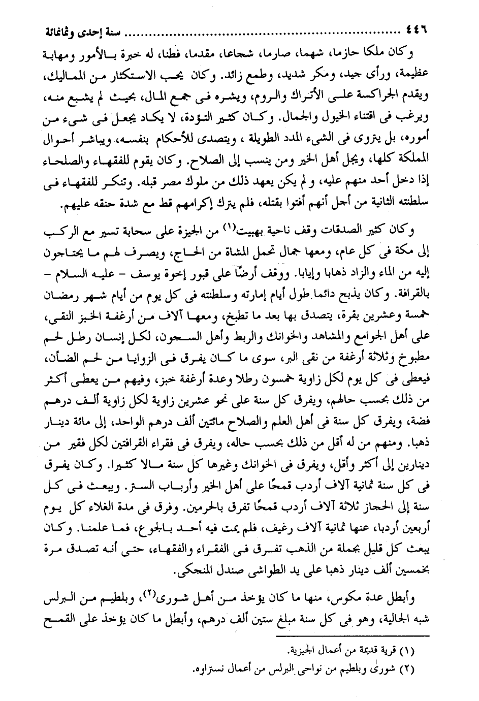 وَكَانَ ملكا حازماً شهماً صَارِمًا شجاعاً مقدما فطناً لَهُ خبْرَة بالأمور ومهابة عَظِيمَة ورأي جيد ومكر شَدِيد وطمع زَائِد. وَكَانَ يحب الاستكثار من المماليك وَيقدم الجراكسة على الأتراك وَالروم ويشره فِي جمع المَال بِحَيْثُ لم يشْبع مِنْهُ ويرغب فِي اقتناء الْخُيُول وَالْجمال وَكَانَ كثير التؤدة لَا يكَاد يَجْعَل فِي شَيْء من أُمُوره بل يتروى فِي الشَّيْء المدد الطَّوِيلَة ويتصدى للْأَحْكَام بِنَفسِهِ ويباشر أَحْوَال المملكة كلهَا ويجل أهل الْخَيْر وَمن ينْسب إِلَى الصّلاح. وَكَانَ يقوم للفقهاء والصلحاء إِذا دخل أحد مِنْهُم عَلَيْهِ وَلم يكن يعْهَد ذَلِك من مُلُوك مصر قبله. وتنكر للفقهاء فِي سلطنته الثَّانِيَة من أجل أَنهم أفتوا بقتْله فَلم يتْرك إكرامهم قطّ مَعَ شدَّة حنقه عَلَيْهِم. وَكَانَ كثير الصَّدقَات وقف نَاحيَة بهبيت من الجيزة على سَحَابَة تسير مَعَ الركب إِلَى مَكَّة فِي كل عَام وَمَعَهَا جمال تحمل المشاة من الْحَاج وَيصرف لَهُم مَا يَحْتَاجُونَ إِلَيْهِ من المَاء والزاد ذَهَابًا وإياباً. ووقف أَرضًا على قُبُور أخوة يُوسُف - عَلَيْهِ السَّلَام - بالقرافة. وَكَانَ يذبح دَائِما. طول أَيَّام إمارته وسلطنته فِي كل يَوْم من أَيَّام شهر رَمَضَان خَمْسَة وَعشْرين بقرة يتَصَدَّق بهَا بعد مَا تطبخ وَمَعَهَا آلَاف من أرغفة الْخبز النقي على أهل الْجَوَامِع والمشاهد والخوانك والربط وَأهل السجون لكل إِنْسَان رَطْل لحم مطبوخ وَثَلَاثَة أرغفة من نقي الْبر سوى مَا كَانَ يفرق فِي الزوايا من لحم الضَّأْن فَيعْطى فِي كل يَوْم لكل زَاوِيَة خَمْسُونَ رطلا وعدة أرغفة خبز وَفِيهِمْ من يعْطى أَكثر من ذَلِك بِحَسب حَالهم وَيفرق كل سنة على نَحْو عشْرين زَاوِيَة لكل زَاوِيَة ألف دِرْهَم فضَّة وَيفرق كل سنة فِي أهل الْعلم وَالصَّلَاح مِائَتَيْنِ ألف دِرْهَم الْوَاحِد إِلَى مائَة دِينَار ذَهَبا. وَمِنْهُم من لَهُ أقل من ذَلِك بِحَسب حَاله وَيفرق فِي فُقَرَاء القرافتين لكل فَقير من دينارين إِلَى أَكثر وَأَقل وَيفرق فِي الخوانك وَغَيرهَا كل سنة مَالا كثيرا. وَكَانَ يفرق فِي كل سنة ثَمَانِيَة آلَاف أردب قمحاً على أهل الْخَيْر وأرباب السّتْر. وَيبْعَث فِي كل سنة إِلَى الْحجاز ثَلَاثَة آلَاف أردب قمحاً تفرق بالحرمين. وَفرق فِي مُدَّة الغلاء كل يَوْم أَرْبَعِينَ أردباً مِنْهَا ثَمَانِيَة آلَاف رغيف فَلم يمت فِيهِ أحد بِالْجُوعِ فَمَا علمنَا. وَكَانَ يبْعَث كل قَلِيل بجملة من الذَّهَب تفرق فِي الْفُقَرَاء وَالْفُقَهَاء حَتَّى أَنه تصدق مرّة بِخَمْسِينَ ألف دِينَار ذَهَبا على يَد الطواشي صندل المنجكي. وأبطل عدَّة مكوس مِنْهَا مَا كَانَ يُؤْخَذ من أهل شُورَى وبلطيم من البرلس شبه الجمالية وَهُوَ فِي كل سنة مبلغ سِتِّينَ ألف دِرْهَم وأبطل مَا كَانَ يُؤْخَذ على الْقَمْح