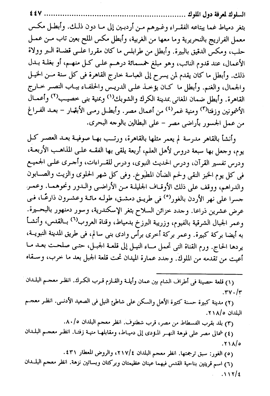 بثغر دمياط غماً يبتاعه الْفُقَرَاء وَغَيرهم من أردبين إِلَى مَا دون ذَلِك. وأبطل مكس معمل الفراريج بالنحريرية وَمَا مَعهَا من الغربية وأبطل مكس الْملح بِعَين تَابَ من عمل حلب ومكس الدَّقِيق بالبيرة. وأبطل من طرابلس مَا كَانَ مقرراً على قُضَاة الْبر وولاة الْأَعْمَال عِنْد قدوم النَّائِب وَهُوَ مبلغ خَمْسمِائَة دِرْهَم على كل مِنْهُم أَو بغلة بدل تِلْكَ. وأبطل مَا كَانَ يقدم لمن يسرح إِلَى العباسة خَارج الْقَاهِرَة فِي كل سنة من الْخَيل وَالْجمال وَالْغنم. وأبطل مَا كَانَ يُؤْخَذ على الدريس والحلفاء بِبَاب النَّصْر خَارج الْقَاهِرَة. وأبطل ضَمَان المغاني بِمَدِينَة الكرك والشوبك وبمدينة بني خصيب وأعمال الأشمونين وزفتا ومنية غمر من أَعمال مصر. وأبطل رمي الأبقار - بعد الْفَرَاغ من عمل الجسور بأراضي مصر - على البطالين بِالْوَجْهِ البحري. وَأَنْشَأَ بالقاهر مدرسة لم يعمر مثلهَا بِالْقَاهِرَةِ ورتب بهَا صوفية بعد الْعَصْر كل يَوْم وَجعل بهَا سَبْعَة دروس لأهل الْعلم أَرْبَعَة يلقى بهَا الْفِقْه على الْمذَاهب الْأَرْبَعَة ودرس تَفْسِير الْقُرْآن ودرس الحَدِيث النَّبَوِيّ ودرس للقراءات وأجرى على الْجَمِيع فِي كل يَوْم الْخبز النقي وَلحم الضَّأْن الْمَطْبُوخ. وَفِي كل شهر الْحَلْوَى وَالزَّيْت والصابون وَالدَّرَاهِم ووقف على ذَلِك الْأَوْقَاف الجليلة من الْأَرَاضِي والدور وَنَحْوهمَا. وَعمر جِسْرًا على نهر الْأُرْدُن بالغور فِي طَرِيق دمشق طوله مائَة وَعِشْرُونَ ذارعاً فِي عرض عشْرين ذِرَاعا. وجدد خَزَائِن السِّلَاح بثغر الْإسْكَنْدَريَّة وسرر دمنهور بالبحيرة. وَعمر الْجبَال الشرقية بالفيوم وزريبة البرزخ بدمياط وقناة العروب بالقدس وَأَنْشَأَ بِهِ أَيْضا بركَة كَبِيرَة. وَعمر بركَة أُخْرَى بِرَأْس وَادي بني سَالم فِي طَرِيق الْمَدِينَة النَّبَوِيَّة يردهَا الْحَاج. ورم الْقَنَاة الَّتِي تحمل مَاء النّيل إِلَى قلعة الْجَبَل حَتَّى صلحت بعد مَا أعيت من تقدمه من الْمُلُوك. وجدد عمَارَة الميدان تَحت قلعة الْجَبَل بعد مَا خرب وسقاه