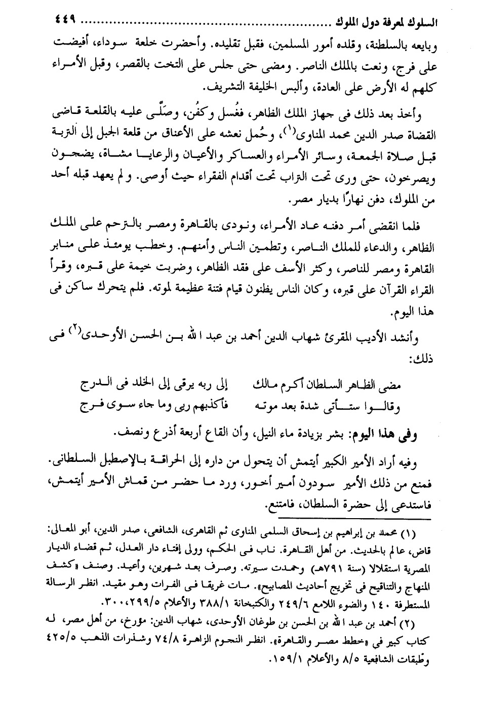 وَبَايَعَهُ بالسلطة وقلده أُمُور الْمُسلمين فَقبل تَقْلِيده. وأحضرت خلعة سَوْدَاء أفيضت على فرج ونعت بِالْملكِ النَّاصِر. وَمضى حَتَّى جلس على التخت بِالْقصرِ وَقبل الْأُمَرَاء كلهم لَهُ الأَرْض على الْعَادة وألبس الْخَلِيفَة التشريف. وَأخذ بعد ذَلِك فِي جهاز الْملك الظَّاهِر فغُسل وكفُن وصَفي عَلَيْهِ بالقلعة قَاضِي الْقُضَاة صدر الدّين مُحَمَّد الْمَنَاوِيّ وحُمل نعشه على الْأَعْنَاق من قلعة الْجَبَل إِلَى التربة قبل صَلَاة الْجُمُعَة وَسَائِر الْأُمَرَاء والعساكر والأعيان والرعايا مشَاة يضجون ويصرخون حَتَّى وري تَحت التُّرَاب تَحت أَقْدَام الْفُقَرَاء حَيْثُ أوصى. وَلم يعْهَد قبله أحد من الْمُلُوك دفن نَهَارا بديار مصر. فَلَمَّا انْقَضى أَمر دَفنه عَاد الْأُمَرَاء وَنُودِيَ بِالْقَاهِرَةِ ومصر بالترحم على الْملك الظَّاهِر وَالدُّعَاء للْملك النَّاصِر وتطمين النَّاس وأمنهم. وخطب يَوْمئِذٍ على مَنَابِر الْقَاهِرَة ومصر للناصر وَكثر الأسف على فقد الظَّاهِر وَضربت خيمة على قَبره وَقَرَأَ الْقُرَّاء الْقُرْآن على قَبره وَكَانَ النَّاس يظنون قيام فتْنَة عَظِيمَة لمَوْته. فَلم يَتَحَرَّك سَاكن فِي هَذَا الْيَوْم. وَأنْشد الأديب الْمُقْرِئ شهَاب الدّين أَحْمد بن عبد الله بن الْحسن الأوحدي فِي ذَلِك: وَقَالُوا ستأتي شدَّة بعد مَوته فأكذبهم رَبِّي وَمَا جَاءَ سوى فرج وَفِي هَذَا الْيَوْم. بشر بِزِيَادَة مَاء النّيل وَأَن القاع أَرْبَعَة أَذْرع وَنصف. وَفِيه أَرَادَ الْأَمِير الْكَبِير أيتمش أَن يتَحَوَّل من دَاره إِلَى الحراقة بالإصطبل السلطاني. فَمنع من ذَلِك الْأَمِير سودون أَمِير أخور ورد مَا حضر من قماش الْأَمِير أيتمش فاستدعى إِلَى حَضْرَة السُّلْطَان فَامْتنعَ.