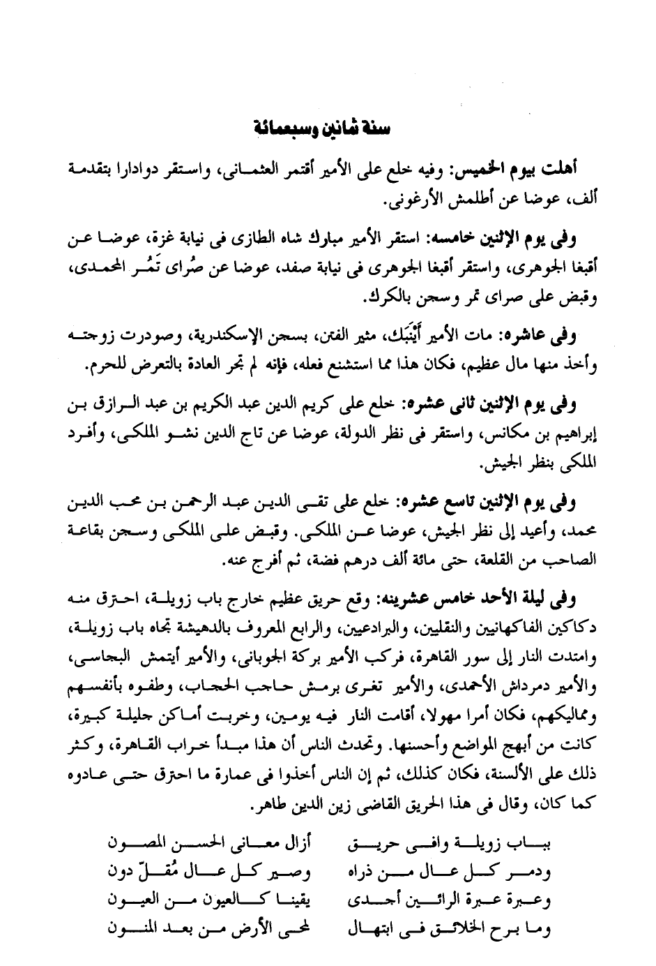 أهلت بِيَوْم الْخَمِيس: وَفِيه خلع على الْأَمِير أقتمر العثماني وَاسْتقر دوادارا بتقدمة ألف عوضا عَن أطلمش الأرغوني. وَفِي يَوْم الْإِثْنَيْنِ خامسه: اسْتَقر الْأَمِير مبارك شاه الطازي فِي نِيَابَة غَزَّة عوضا عَن أقبغا الْجَوْهَرِي وَاسْتقر أقبغا الْجَوْهَرِي فِي نِيَابَة صفد عوضا عَن صُراي تَمُر المحمدي وَقبض على صرا تمر وسجن بالكرك. وَفِي عاشره: مَاتَ الْأَمِير أينَبَك مثيرالفتن بسجن الْإسْكَنْدَريَّة وصودرت زَوجته وَأخذ مِنْهَا مَال عَظِيم فَكَانَ هَذَا مِمَّا استشنع فعله فَإِنَّهُ لم تجر الْعَادة بالتعرض للحرم. وَفِي يَوْم الْإِثْنَيْنِ ثَانِي عشره: خلع على كريم الدّين عبد الْكَرِيم بن عبد الرازق بن إِبْرَاهِيم بن مكانس وَاسْتقر فِي نظر الدولة عوضا عَن تَاج الدّين نشو الملكي وأفرد الملكي بِنَظَر الْجَيْش. وَفِي يَوْم الْإِثْنَيْنِ تَاسِع عشره: خلع على تَقِيّ الدّين عبد الرَّحْمَن بن محب الدّين مُحَمَّد وأعيد إِلَى نظر الْجَيْش عوضا عَن الملكي. وَقبض على الملكي وسجن بقاعة الصاحب من القلعة حَتَّى مائَة ألف دِرْهَم فضَّة ثمَّ أفرج عَنهُ. وَفِي لَيْلَة الْأَحَد خَامِس عشرينه: وَقع حريق عَظِيم خَارج بَاب زويلة احْتَرَقَ مِنْهُ دكاكين الفاكهانيين والنقليين والبرادعيين وَالرَّابِع الْمَعْرُوف بالدهيشة تجاه بَاب زويلة وامتدت النَّار إِلَى سور الْقَاهِرَة فَركب الْأَمِير بركَة الجوباني والأمير أيتمش البجاسي والأمير دمرداش الأحمدي والأمير تغرى برمش حَاجِب الْحجاب وطفوه بِأَنْفسِهِم ومماليكهم فَكَانَ أمرا مهولا أَقَامَت النَّار فِيهِ يَوْمَيْنِ وَخَربَتْ أَمَاكِن جليلة كَبِيرَة كَانَت من أبهج الْمَوَاضِع وأحسنها. وتحدث النَّاس أَن هَذَا مبدأ خراب الْقَاهِرَة وَكثر ذَلِك على الْأَلْسِنَة فَكَانَ كَذَلِك ثمَّ إِن النَّاس أخذُوا فِي عمَارَة مَا احْتَرَقَ حَتَّى عادوه كَمَا كَانَ وَقَالَ فِي هَذَا الْحَرِيق القَاضِي زين الدّين طَاهِر. بِبَاب زويلة وافي حريق أَزَال مَعَاني الْحسن المصون. وَدَمرَ كل عَال من ذراه وصير كل عَال مُقلّ دون. وَمَا برح الْخَلَائق فِي ابتهال لمحى الأَرْض من بعد الْمنون.