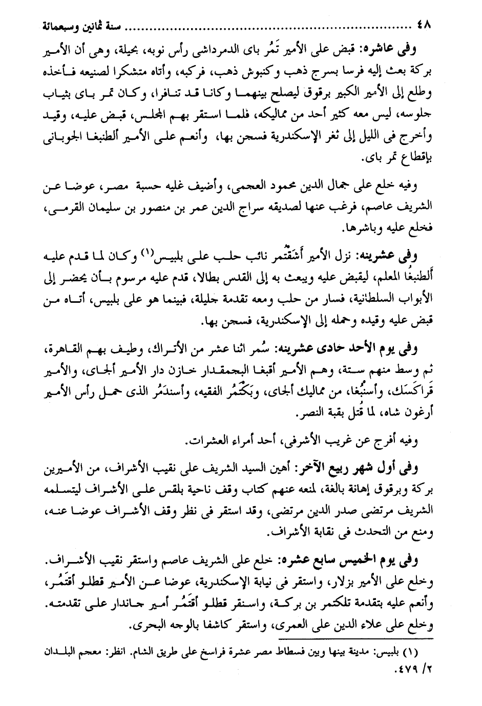 وَفِي عاشره: قبض على الْأَمِير تَمُر باى الدمرداشي رَأس نوبه بحيلة وَهِي أَن الْأَمِير بركَة بعث إِلَيْهِ فرسا بسرج ذهب وكنبوش ذهب فَرَكبهُ وأ تَاه متشكرا لصنيعه فَأَخذه وطلع إِلَى الْأَمِير الْكَبِير برقوق ليصلح بَينهمَا وَكَانَا قد تنافرا وَكَانَ تمر باى بِثِيَاب جُلُوسه لَيْسَ مَعَه كثير أحد من مماليكه فَلَمَّا اسْتَقر بهم الْمجْلس قبض عَلَيْهِ وَقيد وَأخرج فِي اللَّيْل إِلَى ثغر الْإسْكَنْدَريَّة فسجن بهَا وأنعم على الْأَمِير ألطنبغا الجوباني بإقطاع تمر باى. وَفِيه خلع على جال الدّين مَحْمُود العجمي وأضيف غليه حسبَة مصر عوضا عَن الشريف عَاصِم فَرغب عَنْهَا لصديقه سراج الدّين عمر بن مَنْصُور بن سُلَيْمَان القرمي فَخلع عَلَيْهِ وباشرها. وَفِي عشرينه: نزل الْأَمِير أَشَقتمر نَائِب حلب على بلبيس وَكَانَ لما قدم عَلَيْهِ أَلطنبغُا الْمعلم ليقْبض عَلَيْهِ وَيبْعَث بِهِ إِلَى الْقُدس بطالا قدم عَلَيْهِ مرسوم بِأَن يحضر إِلَى الْأَبْوَاب السُّلْطَانِيَّة فَسَار من حلب وَمَعَهُ تقدمة جليلة فَبَيْنَمَا هُوَ على بلبيس أَتَاهُ من قبض عَلَيْهِ وَقَيده وَحمله إِلَى الْإسْكَنْدَريَّة فسجن بهَا. وَفِي يَوْم الْأَحَد حادي عشرينه: سُمر اثْنَا عشر من الأتراك وطيف بهم الْقَاهِرَة ثمَّ وسط مِنْهُم سِتَّة وهم الْأَمِير أقبغا البجمقدار خَازِن دَار الْأَمِير ألجاي والأمير قَراكَسَك وأسنْبُغا من وَفِيه أفرج عَن غَرِيب الأشرفي أحد أُمَرَاء العشرات. وَفِي أول شهر ربيع الآخر: أهين السَّيِّد الشريف عَليّ نقيب الْأَشْرَاف من الأميرين بركَة وبرقوق إهانة بَالِغَة لمَنعه عَنْهُم كتاب وقف نَاحيَة بلقس على الْأَشْرَاف ليتسلمه الشريف مرتضى صدر الدّين مرتضى وَقد اسْتَقر فِي نظر وقف الْأَشْرَاف عوضا عَنهُ وَمنع من التحدث فِي نقابة الْأَشْرَاف. وَفِي يَوْم الْخَمِيس سَابِع عشره: خلع على الشريف عَاصِم وَاسْتقر نقيب الْأَشْرَاف. وخلع على الْأَمِير بزلار وَاسْتقر فِي نِيَابَة الْإسْكَنْدَريَّة عوضا عَن الْأَمِير قطلو أقتَمُر وأنعم عَلَيْهِ بتقدمة تلكتمر بن بركَة واسنقر قطلو أقتَمُر أَمِير جاندار على تقدمته. وخلع على عَلَاء الدّين على الْعمريّ وَاسْتقر كاشفا بِالْوَجْهِ البحري.