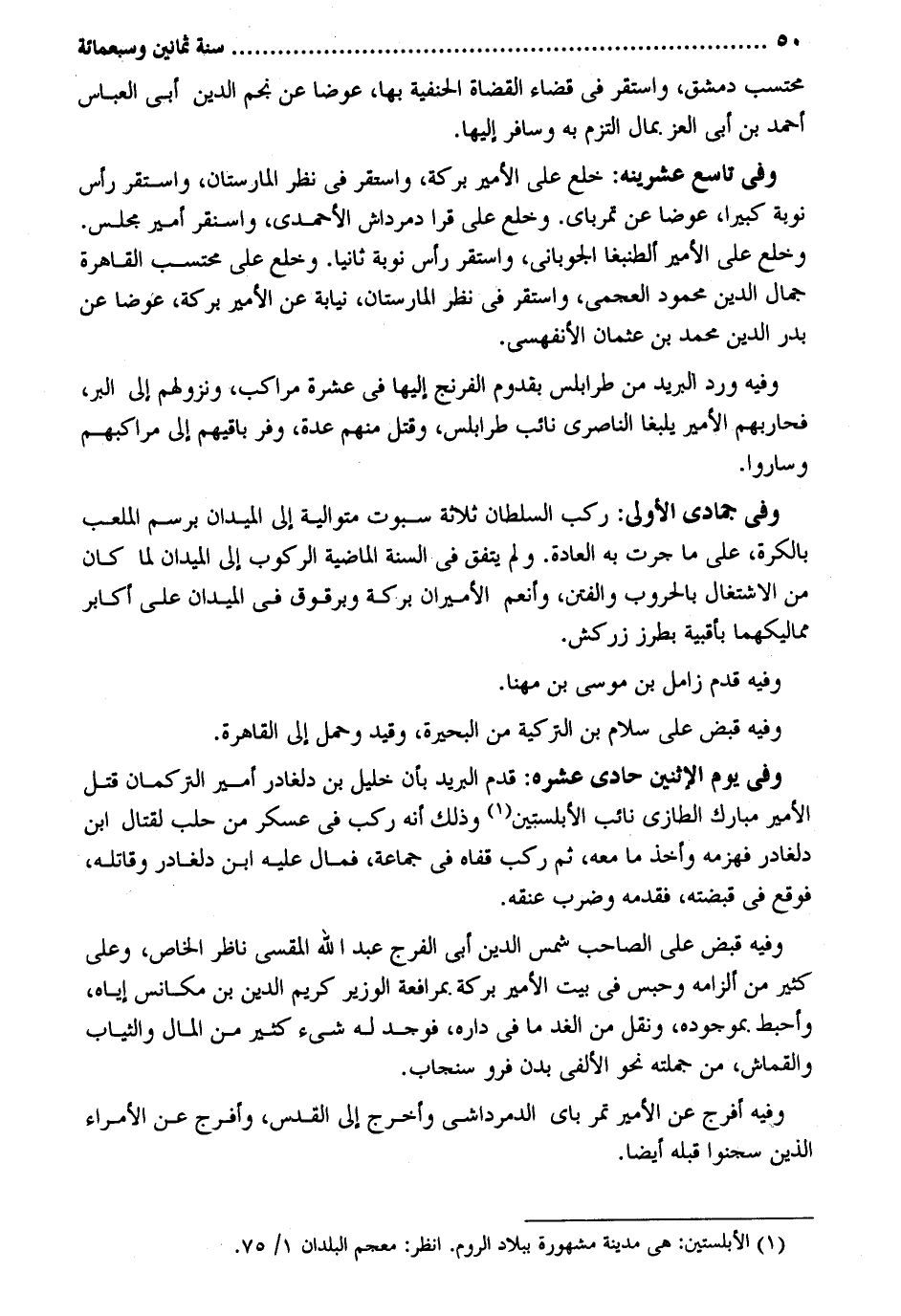 محتسب دمشق وَاسْتقر فِي قَضَاء الْقُضَاة الْحَنَفِيَّة بهَا عوضا عَن نجم الدّين أبي الْعَبَّاس أَحْمد بن أبي الْعِزّ. بِمَال الْتزم بِهِ وسافر إِلَيْهَا. وَفِي تَاسِع عشرينه: خلع على الْأَمِير بركَة واسثقر فِي نظر المارستان وَاسْتقر رَأس نوبَة كَبِيرا عوضا عَن تمرباي. وخلع على قرا دمرداش الأحمدي واسنقر أَمِير مجْلِس. وخلع على الْأَمِير ألطنبغا الجوباني وَاسْتقر رَأس نوبَة ثَانِيًا. وخلع على محتسب الْقَاهِرَة جمال الدّين مَحْمُود العجمي وَاسْتقر فِي نظر المارستان نِيَابَة عَن الْأَمِير بركَة عوَضا عَن بدر الدّين مُحَمَّد بن عُثْمَان الأنفهسى. وَفِيه ورد الْبَرِيد من طرابلس بقدوم الفرنج إِلَيْهَا فِي عشرَة مراكب ونزولهم إِلَى الْبر فحاربهم الْأَمِير يلبغا الناصري نَائِب طرابلس وَقتل مِنْهُم عدَّة وَفِي باقيهم إِلَى مراكبهم وَسَارُوا. وَفِي جُمَادَى الأولى: ركب السُّلْطَان ثَلَاثَة سبوت مُتَوَالِيَة إِلَى الميدان برسم الملعب بالكرة على مَا جرت بِهِ الْعَادة. وَلم يتَّفق فِي السّنة الْمَاضِيَة الرّكُوب إِلَى الميدان لما كَانَ من الإشتغال بالحروب والفتن وأنعم الأميران بركَة وبرقوق فِي الميدان على أكَابِر مماليكهما بأقبية بطرز زركش. وَفِيه قدم زامل بن مُوسَى بن مهنا. وَفِيه قبض على سَلام بن التركية من الْبحيرَة وَقيد وَحمل إِلَى الْقَاهِرَة. وَفِي يَوْم الْإِثْنَيْنِ حادي عشره: قدم الْبَرِيد بِأَن خَلِيل بن دلغادر أَمِير التركمان قتل الْأَمِير مبارك الطازي نَائِب الأبلستين وَذَلِكَ أَنه ركب فِي عَسْكَر من حلب لقِتَال ابْن دلغادر فَهَزَمَهُ وَأخذ مَا مَعَه ثمَّ ركب قَفاهُ فِي جمَاعَة فَمَال عَلَيْهِ ابْن دلغادر وقاتله فَوَقع فِي قَبضته فقدمه وَضرب عُنُقه. وَفِيه قبض على الصاحب شمس الدّين أبي الْفرج عبد الله المقسي نَاظر الْخَاص وعَلى كثير من ألزامه وَحبس فِي بَيت الْأَمِير بركَة. بمرافعة الْوَزير كريم الدّين بن مكانس إِيَّاه وأحبط. بموجوده وَنقل من الْغَد مَا فِي دَاره فَوجدَ لَهُ شَيْء كثير من المَال وَالثيَاب والقماش من جملَته نَحْو الألفي بدن فرو سنجاب. وَفِيه أفرج عَن الْأَمِير تمر باي الدمرداشي وَأخرج إِلَى الْقُدس وَأَفْرج عَن الْأُمَرَاء الَّذين سجنوا قبله أَيْضا.