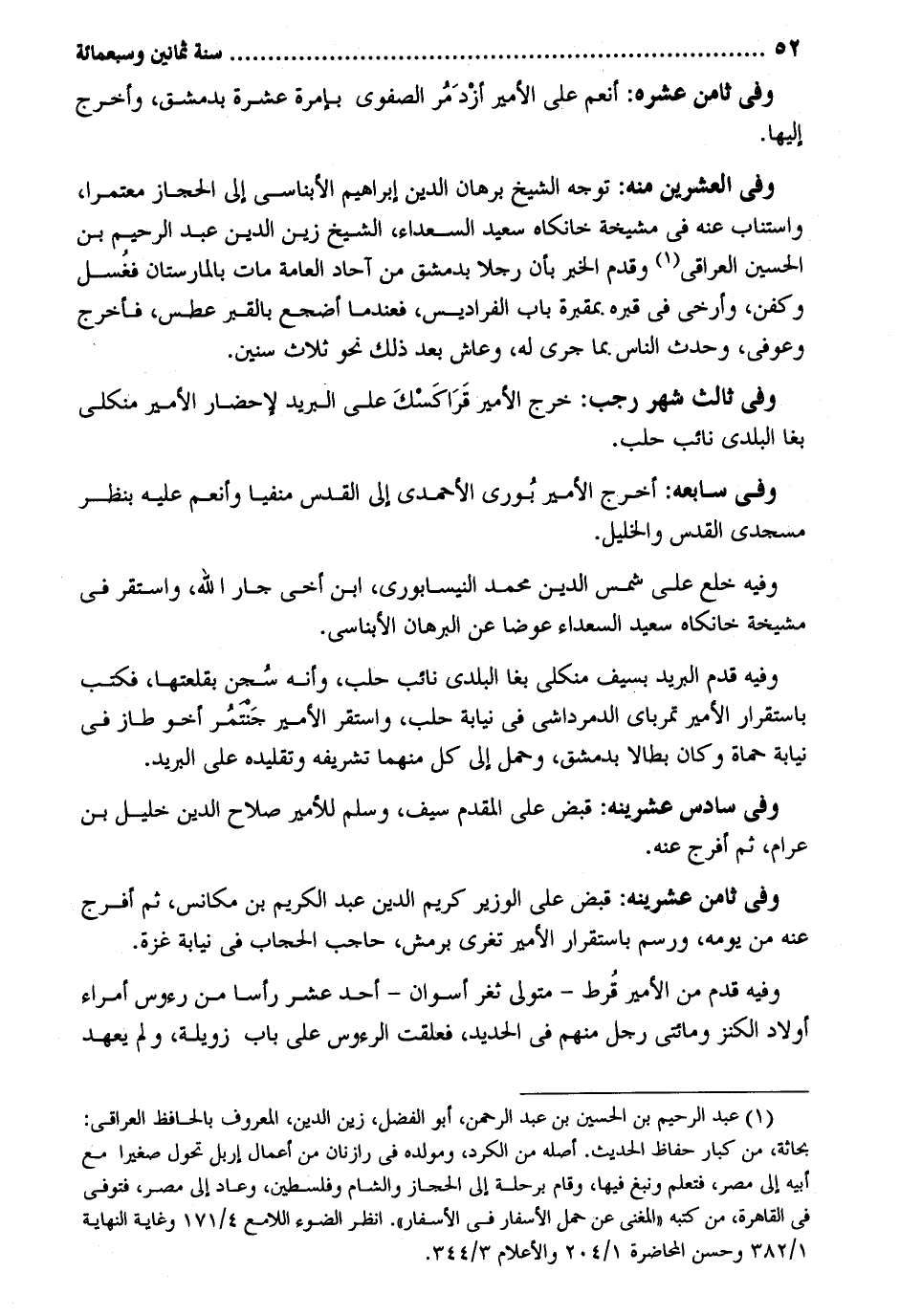 وَفِي ثامن عشره: أنعم على الْأَمِير أزدمر الصفوي بإمرة عشرَة بِدِمَشْق وَأخرج إِلَيْهَا. وَفِي الْعشْرين مِنْهُ: توجه الشَّيْخ برهَان الدّين إِبْرَاهِيم الأبناسي إِلَى الْحجاز مُعْتَمِرًا واستناب عَنهُ فِي مشيخة خانكاه سعيد السُّعَدَاء الشَّيْخ زين الدّين عبد الرَّحِيم بن الْحُسَيْن الْعِرَاقِيّ وَقدم الْخَبَر بِأَن رجلا بِدِمَشْق من آحَاد الْعَامَّة مَاتَ بالمارستان فغُسل وكفن وأرخى فِي قَبره. بمقبرة بَاب الفراديس فعندما أضجع بالقبر عطس فَأخْرج وعوفي وَحدث النَّاس. بِمَا جرى لَهُ وعاش بعد ذَلِك نَحْو ثَلَاث سِنِين. وَفِي ثَالِث شهر رَجَب: خرج الْأَمِير قَراكَسكَ على الْبَرِيد لإحضار الْأَمِير منكلي بغا الْبَلَدِي نَائِب حلب. وَفِي سابعه: أخرج الْأَمِير بُورى الأحمدي إِلَى الْقُدس منفيا وأنعم عَلَيْهِ بِنَظَر مَسْجِدي الْقُدس والخليل. وَفِيه خلع على شمس الدّين مُحَمَّد النَّيْسَابُورِي ابْن أخي جَار الله وَاسْتقر فِي مشيخة خانكاه سعيد السُّعَدَاء عوضا عَن الْبُرْهَان الأبناسي. وَفِيه قدم الْبَرِيد بِسيف منكلي بغا الْبَلَدِي نَائِب حلب وَأَنه سجن بقلعتها فَكتب باستقرار الْأَمِير تمرباي الدمرداشي فِي نِيَابَة حلب وَاسْتقر الْأَمِير جَنتمُر أَخُو طاز فِي نِيَابَة حماة وَكَانَ بطالا بِدِمَشْق وَحمل إِلَى كل مِنْهُمَا تشريفه وتقليده على الْبَرِيد. وَفِي سادس عشرينه: قبض على الْمُقدم سيف وَسلم للأمير صَلَاح الدّين خَلِيل بن عرام ثمَّ أفرج عَنهُ. وَفِي ثامن عشرينه: قبض على الْوَزير كريم الدّين عبد الْكَرِيم بن مكانس ثمَّ أفرج عَنهُ من يَوْمه ورسم باستقرار الْأَمِير تغرى برمش حَاجِب الْحجاب فِي نِيَابَة غَزَّة. وَفِيه قدم من الْأَمِير قُرط - مُتَوَلِّي ثغر أسوان - أحد عشر رَأْسا من رُؤُوس أُمَرَاء أَوْلَاد الْكَنْز ومائتي رجل مِنْهُم فِي الْحَدِيد فعلقت الرؤوس على بَاب زويلة وَلم يعْهَد