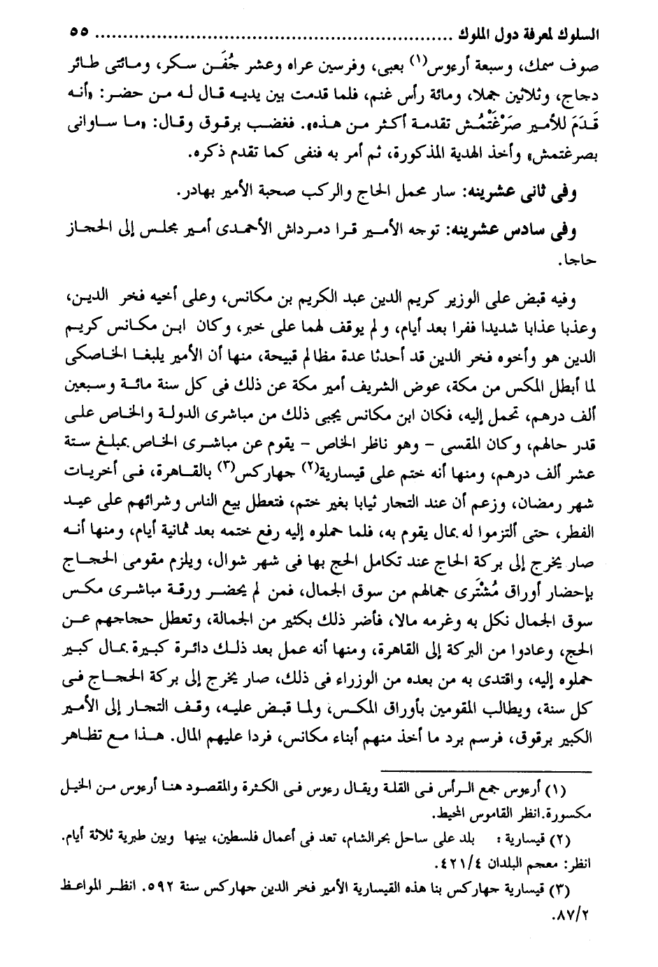 صوف سمك وَسَبْعَة أرءوس بعبي وفرسين عراه وَعشر جُفَن سكر ومائتي طَائِر دَجَاج وَثَلَاثِينَ جملا وَمِائَة رَأس غنم فَلَمَّا قدمت بَين يَدَيْهِ قَالَ لَهُ من حضر: أَنه قَدَمَ للأمير صرغَتُمش تقدمة أَكثر من هَذِه. فَغَضب برقوق وَقَالَ: مَا ساواني بصرغتمش وَأخذ الْهَدِيَّة الْمَذْكُورَة ثمَّ أَمر بِهِ فنفي كَمَا تَقدم ذكره. وَفِي سادس عشرينه: توجه الْأَمِير قرا دمرداش الأحمدي أَمِير مجْلِس إِلَى الْحجاز حَاجا. وَفِيه قبض على الْوَزير كريم الدّين عبد الْكَرِيم بن مكانس وعَلى أَخِيه فَخر الدّين وعذبا عذَابا شَدِيدا ففرا بعد أَيَّام وَلم يُوقف لَهما على خبر وَكَانَ ابْن مكانس كريم الدّين هُوَ وَأَخُوهُ فَخر الدّين قد أحدثا عدَّة مظالم قبيحة مِنْهَا أَن الْأَمِير يلبغا الخاصكي لما أبطل المكس من مَكَّة عوض الشريف أَمِير مَكَّة عَن ذَلِك فِي كل سنة مائَة وَسبعين ألف دِرْهَم تحمل إِلَيْهِ فَكَانَ ابْن مكانس يجبي ذَلِك من مباشري الدولة وَالْخَاص على قدر حَالهم وَكَانَ المقسي - وَهُوَ نَاظر الْخَاص - يقوم عَن مباشري الْخَاص. بمبلغ سِتَّة عشر ألف دِرْهَم وَمِنْهَا أَنه ختم على قيسارية جهاركس بِالْقَاهِرَةِ فِي أخريات شهر رَمَضَان وَزعم أَن عِنْد التُّجَّار ثيابًا بِغَيْر ختم فتعطل بيع النَّاس وشرائهم على عيد الْفطر حَتَّى ألتزموا لَهُ. بِمَال يقوم بِهِ فَلَمَّا حملوه إِلَيْهِ رفع خَتمه بعد ثَمَانِيَة أَيَّام وَمِنْهَا أَنه صَار يخرج إِلَى بركَة الْحَاج عِنْد تَكَامل الْحَج بهَا فِي شهر شَوَّال وَيلْزم مقومي الْحجَّاج بإحضار أوراق مُشتَرى جمَالهمْ من سوق الْجمال فَمن لم يحضر ورقة مباشري مكسي سوق الْجمال نكل بِهِ وغرمه مَالا فأضر ذَلِك بكثر من الجمالة وتعطل حجاجهم عَن الْحَج وعادوا من الْبركَة إِلَى الْقَاهِرَة وَمِنْهَا أَنه عمل بعد ذَلِك دَائِرَة كَبِيرَة. بِمَال كَبِير حملوه إِلَيْهِ واقتدى بِهِ من بعده من الوزراء فِي ذَلِك صَار يخرج إِلَى بركَة الْحجَّاج فِي كل سنة وَيُطَالب المقومين بأوراق المكس وَلما قبض عَلَيْهِ وقف التُّجَّار إِلَى الْأَمِير الْكَبِير برقوق فرسم برد مَا أَخذ مِنْهُم أَبنَاء مكانس فَردا عَلَيْهِم المَال. هَذَا مَعَ تظاهر