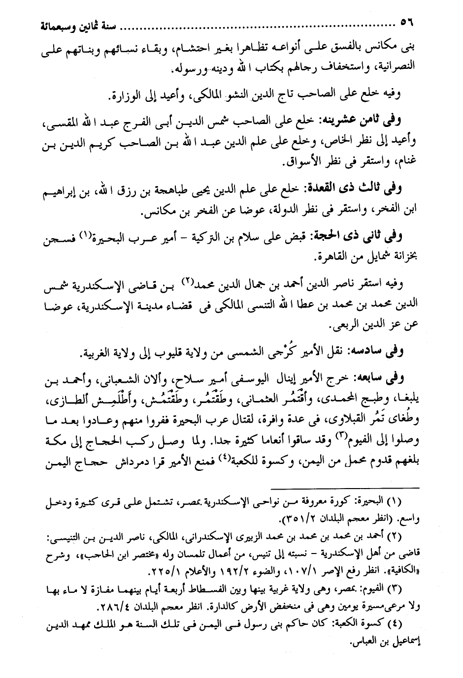 بنى مكانس بِالْفِسْقِ على أَنْوَاعه تظاهراً بِغَيْر احتشام وَبَقَاء نِسَائِهِم وبناتهم على النَّصْرَانِيَّة واستخفاف رِجَالهمْ بِكِتَاب الله وَدينه وَرَسُوله. وَفِيه خلع على الصاحب تَاج الدّين النشو الْمَالِكِي وأعيد إِلَى الوزارة. وَفِي ثامن عشرينه: خلع على الصاحب شمس الدّين أبي الْفرج عبد الله المقسي وأعيد إِلَى نظر الْخَاص وخلع على علم الدّين عبد الله بن الصاحب كريم الدّين بن غَنَّام وَاسْتقر فِي نظر الْأَسْوَاق. وَفِي ثَالِث فِي ذِي الْقعدَة: خلع على علم الدّين يحيى طباهجة بن رزق الله بن إِبْرَاهِيم ابْن الْفَخر وَاسْتقر فِي نظر الدولة عوضا عَن الْفَخر بن مكانس. وَفِي ثَانِي ذِي الْحجَّة: قبض على سَلام بن التركية - أَمِير عرب الْبحيرَة فسجن بخزانة شمايل من الْقَاهِرَة. وَفِيه اسْتَقر نَاصِر الدّين أَحْمد بن جمال الدّين مُحَمَّد بن قَاضِي الْإسْكَنْدَريَّة شمس الدّين مُحَمَّد بن مُحَمَّد بن عطا الله التنسي الْمَالِكِي فِي قَضَاء مَدِينَة الْإسْكَنْدَريَّة عوضا عَن عز الدّين الربعِي. وَفِي سادسه: نقل الْأَمِير كُرْجى الشمسي من ولَايَة قليوب إِلَى ولَايَة الغربية. وَفِي سابعه: خرج الْأَمِير إينال اليوسفي أَمِير سلاحِ وألان الشَّعْبَانِي وَأحمد بن يلبغا وطبج المحمدي وأقتمُر العثماني وطَقتمُر وطقتمُش وأَطْلَمِش ألطازي وطُغاي تَمُر القبلاوي فِي عدَّة وافرة لقِتَال عرب الْبحيرَة فَفرُّوا مِنْهُم وعادوا بعد مَا وصلوا إِلَى الفيوم وَقد ساقوا أنعاما كَثِيرَة جدا. وَلما وصل ركب الْحجَّاج إِلَى مَكَّة بَلغهُمْ قدوم محمل من الْيمن وَكِسْوَة للكعبة فَمنع الْأَمِير قرا دمرداش حجاج الْيمن