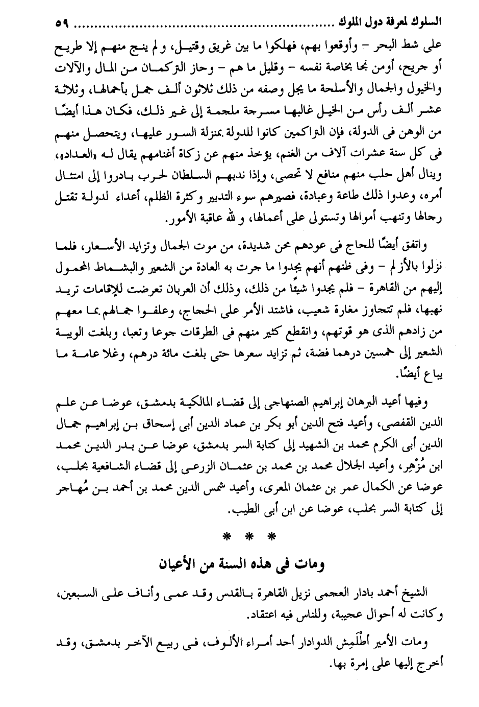على شط الْبَحْر - وأوقعوا بهم فهلكوا مَا بَين غريق وقتيل وَلم ينج مِنْهُم إِلَّا طريح أَو جريح أومن نجا بِخَاصَّة نَفسه - وَقَلِيل مَا هم - وَحَازَ التركمان من المَال والآلات والخيول وَالْجمال والأسلحة مَا يجل وَصفه من ذَلِك ثَلَاثُونَ ألف جمل بأحمالها وَثَلَاثَة عشر ألف رَأس من الْخَيل غالبها مسرجة ملجمة إِلَى غير ذَلِك فَكَانَ هَذَا أَيْضا من الوهن فِي الدولة فَإِن التراكمين كَانُوا للدولة. بِمَنْزِلَة السُّور عَلَيْهَا ويتحصل مِنْهُم فِي كل سنة عشرات آلَاف من الْغنم يُؤْخَذ مِنْهُم عَن زَكَاة أغنامهم يُقَال لَهُ الْعداد وينال أهل حلب مِنْهُم مَنَافِع لَا تحصى وَإِذا ندبهم السُّلْطَان لِحَرْب بَادرُوا إِلَى امْتِثَال أمره وعدوا ذَلِك طَاعَة وَعبادَة فصيرهم سوء التَّدْبِير وَكَثْرَة الظُّلم أَعدَاء لدولة تقتل رجالها وتنهب أموالها وتستولي على أَعمالهَا وَللَّه عَاقِبَة الْأُمُور. وَاتفقَ أَيْضا للْحَاج فِي عودهم محن شَدِيدَة من موت الْجمال وتزايد الأسعار فَلَمَّا نزلُوا بالأزلم - وَفِي ظنهم أَنهم يَجدوا مَا جرت بِهِ الْعَادة من الشّعير والبشماط الْمَحْمُول إِلَيْهِم من الْقَاهِرَة - فَلم يَجدوا شَيْئا من ذَلِك وَذَلِكَ أَن العربان تعرضت للإقامات تُرِيدُ نهبها فَلم تتجاوز مغارة شُعَيْب فَاشْتَدَّ الْأَمر على الْحجَّاج وعلفوا جمَالهمْ. مِمَّا مَعَهم من زادهم الَّذِي هُوَ قوتهم وَانْقطع كثير مِنْهُم فِي الطرقات جوعا وتعباً وَبَلغت الويبة الشّعير إِلَى خمسين درهما فضَّة ثمَّ تزايد سعرها حَتَّى بلغت مائَة دِرْهَم وغلا عَامَّة مَا يُبَاع أَيْضا. وفيهَا أُعِيد الْبُرْهَان إِبْرَاهِيم الصنهاجي إِلَى قَضَاء الْمَالِكِيَّة بِدِمَشْق عوضا عَن علم الدّين القفصي وأعيد فتح الدّين أَبُو بكر بن عماد الدّين أبي إِسْحَاق بن إِبْرَاهِيم جمال الدّين أبي الْكَرم مُحَمَّد بن الشَّهِيد إِلَى كِتَابَة السِّرّ بِدِمَشْق عوضا عَن بدر الدّين مُحَمَّد ابْن مُزْهِر وأعيد الْجلَال مُحَمَّد بن مُحَمَّد بن عُثْمَان الزرعي إِلَى قَضَاء الشَّافِعِيَّة بحلب عوضا عَن الْكَمَال عمر بن عُثْمَان المعري وأعيد شمس الدّين مُحَمَّد بن أَحْمد بن مُهاجر إِلَى كِتَابَة السِّرّ بحلب عوضا عَن ابْن أبي الطّيب. وَمَات فِي هَذِه السّنة من الْأَعْيَان الشَّيْخ أَحْمد بادار العجمي نزيل الْقَاهِرَة بالقدس وَقد عمى وأناف على السّبْعين وَكَانَت لَهُ أَحْوَال عَجِيبَة وَلِلنَّاسِ فِيهِ اعْتِقَاد. وَمَات الْأَمِير أطْلمش الدوادار أحد أُمَرَاء الألوف فِي ربيع الآخر بِدِمَشْق وَقد أخرج إِلَيْهَا على إمرة بهَا.