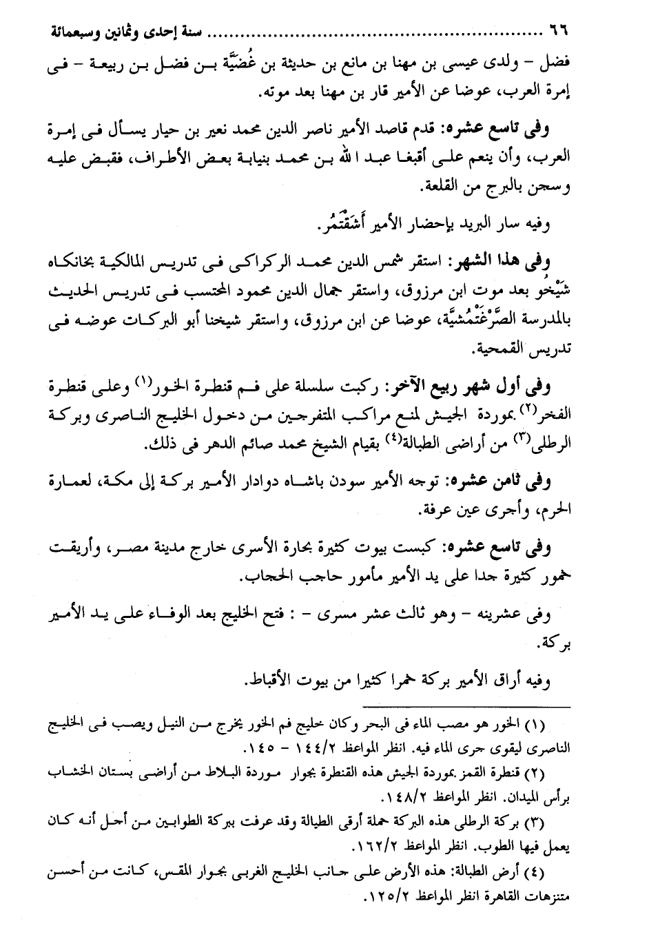فضل - وَلَدي عِيسَى بن مهنا بن مَانع بن حَدِيثَة بن غضية بن فضل بن ربيعَة - فِي إمرة الْعَرَب عوضا عَن الْأَمِير قار بن مهنا بعد مَوته. وَفِي تَاسِع عشره: قدم قَاصد الْأَمِير نَاصِر الدّين مُحَمَّد نعير بن حيار يسْأَل فِي إمرة الْعَرَب وَأَن ينعم على أقبغا عبد الله بن مُحَمَّد بنيابة بعض الْأَطْرَاف فَقبض عَلَيْهِ وسجن بالبرج من القلعة. وَفِيه سَار الْبَرِيد بإحضار الْأَمِير أَشَقتمُر. وَفِي هَذَا الشَّهْر: اسْتَقر شمس الدّين مُحَمَّد الركراكي فِي تدريس الْمَالِكِيَّة بخانكاه شَيْخو بعد موت ابْن مَرْزُوق وَاسْتقر جمال الدّين مَحْمُود الْمُحْتَسب فِي تدريس الحَدِيث بِالْمَدْرَسَةِ الصَّرْغَتْمُشية عوضا عَن ابْن مَرْزُوق وَاسْتقر شَيخنَا أَبُو البركات عوضه فِي تدريس القمحية. وَفِي أول شهر ربيع الآخر: ركبت سلسلة على فَم قنطرة الخور وعَلى قنطرة الْفَخر. بموردة الْجَيْش لمنع مراكب المتفرجين من دُخُول الخليج الناصري وبركة الرطلي من أَرَاضِي الطبالة بِقِيَام الشَّيْخ مُحَمَّد صَائِم الدَّهْر فِي ذَلِك. وَفِي ثامن عشره: توجه الْأَمِير سودن باشاه دوادار الْأَمِير بركَة إِلَى مَكَّة لعمارة الْحرم وأجرى عين عَرَفَة. وَفِي تَاسِع عشره: كبست بيُوت كَثِيرَة بحارة الأسرى خَارج مَدِينَة مصر وأريقت خمور كَثِيرَة جدا على يَد الْأَمِير مَأْمُور حَاجِب الْحجاب. وَفِي عشرينه - وَهُوَ ثَالِث عشر مسرى -: فتح الخليج بعد الْوَفَاء على يَد الْأَمِير بركَة. وَفِيه أراق الْأَمِير بركَة خمرًا كثيرا من بيُوت الأقباط.