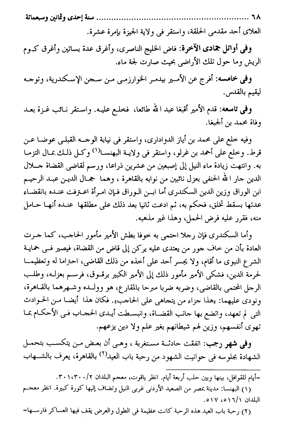 العلاى أحد مقدمي الْحلقَة وَاسْتقر فِي ولَايَة الجيزة بإمرة عشرَة. وَفِي أَوَائِل جُمَادَى الْآخِرَة: فاض الخليج الناصري وَأغْرقَ عدَّة بساتين وَأغْرقَ كوم الريش وَمَا حول تِلْكَ الْأَرَاضِي بِحَيْثُ صَارَت لجة مَاء. وَفِي خامسه: أفرج عَن الْأَمِير بيدمر الْخَوَارِزْمِيّ من سجن الْإسْكَنْدَريَّة وَتوجه ليقيم بالقدس. وَفِي تاسعه: قدم الْأَمِير أقبغا عبد الله طَائِعا فَخلع عَلَيْهِ. وَاسْتقر نَائِب غَزَّة بعد وَفَاة مُحَمَّد بن وَفِيه خلع على مُحَمَّد بن أياز الدوادارى وَاسْتقر فِي نِيَابَة الْوَجْه القبلي عوضا عَن قرط. وخلع على أَحْمد بن غرلو وَاسْتقر فِي ولَايَة البهنسا وكل ذَلِك. بِمَال التزما بِهِ. وانتهت زِيَادَة مَاء النّيل إِلَى إِصْبَعَيْنِ من عشْرين ذِرَاعا ورسم لقَاضِي الْقُضَاة جلال الدّين جَار الله الْحَنَفِيّ بعزل نائبين من نوابه بِالْقَاهِرَةِ وهما جمال الدّين عبد الرَّحِيم بن الْوراق وزين الدّين السكندري أما ابْن الْوراق فَإِن امْرَأَة اعْترفت عِنْده بِانْقِضَاء عدتهَا بسقط تخلق فَحكم بِهِ ثمَّ ادَّعَت ثَانِيًا بعد ذَلِك على مُطلقهَا عِنْده أَنَّهَا حَامِل مِنْهُ فقرر عَلَيْهِ فرض الْحمل وَهَذَا غير مذْهبه. وَأما السكندري فَإِن رجلا احتمى بِهِ خوفًا بَطش الْأَمِير مَأْمُور الْحَاجِب كَمَا جرت الْعَادة بِأَن من خَافَ جور من يعتدي عَلَيْهِ يركن إِلَى قَاض من الْقُضَاة فَيصير فِي حماية الشَّرْع النَّبَوِيّ مَا أَقَامَ وَلَا يَجْسُر أحد على أَخذه من ذَلِك القَاضِي احتراما لَهُ وتعظيما لحُرْمَة الدّين فَشكى الْأَمِير مَأْمُور ذَلِك إِلَى الْأَمِير الْكَبِير برقوق فرسم بعزله وَطلب الرجل المحتمي بِالْقَاضِي وضربه ضربا مبرحا بالمقارع هُوَ وَولده وشهرهما بِالْقَاهِرَةِ وَنُودِيَ عَلَيْهِمَا: هَذَا جَزَاء من يتجاهى على الْحَاجِب. فَكَانَ هَذَا أَيْضا من الْحَوَادِث الَّتِي لم تعهد واتضع بهَا جَانب الْقُضَاة وانبسطت أَيدي الْحجاب فِي الْأَحْكَام. بِمَا تهوى أنفسهم وزين لَهُم شيطانهم بِغَيْر علم وَلَا دين يزعهم. وَفِي شهر رَجَب: اتّفقت حَادِثَة مستغربة وَهِي أَن بعض من يتكسب بتحمل الشَّهَادَة بجلوسه فِي حوانيت الشُّهُود من رحبة بَاب الْعِيد بِالْقَاهِرَةِ يعرف بالشهاب