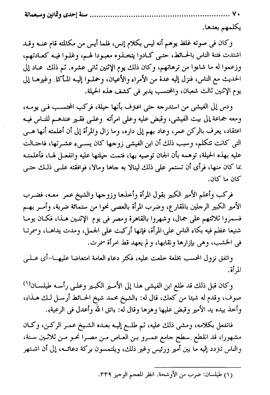 يكلمهم بعْدهَا. وَكَانَ فِي صَوته غلظ يُوهم أَنه لَيْسَ بِكَلَام إنس فَلَمَّا أيس من مكالمته قَامَ عَنهُ وَقد اشتدت فتْنَة النَّاس بِالْحَائِطِ حَتَّى كَادُوا يتخذوه معبودا لَهُم وغلوا فِيهِ كعادتهم وَزَعَمُوا لَهُ مَا شَاءُوا من ترهاتهم وَكَانَ ذَلِك يَوْم الْإِثْنَيْنِ ثَانِي عشره. ثمَّ ذَلِك عَاد إِلَى الحَدِيث مَعَ النَّاس فَنزل إِلَيْهِ عدَّة من الْأُمَرَاء والأعيان وحملوا إِلَيْهِ المأكل وَغَيرهَا إِلَى يَوْم الْإِثْنَيْنِ ثَالِث شعْبَان والمحتسب يدبر فِي كشف هَذِه الْحِيلَة. ودس إِلَى الفيشي من استدرجه حَتَّى اعْترف بِأَنَّهَا حِيلَة فَركب الْمُحْتَسب فِي يَوْمه وَمَعَهُ جمَاعَة إِلَى بَيت الفيشي وَقبض عَلَيْهِ وعَلى امْرَأَته وعَلى فَقير عِنْدهم للنَّاس فِيهِ اعْتِقَاد يعرف بالركن عمر وَعَاد بهم إِلَى دَاره وَمَا زَالَ وَالْمَرْأَة إِلَى أَن أعلمته أَنَّهَا هِيَ الَّتِي كَانَت تَتَكَلَّم وَسبب ذَلِك أَن ابْن الفيشي زَوجهَا كَانَ يسيء عشرتها فاحتالت عَلَيْهِ بِهَذِهِ الْحِيلَة توهمه بِأَن الجان توصيه بهَا فتمت حيلتها عَلَيْهِ وانفعل لَهَا فأعلمته. بِمَا كَانَ مِنْهَا فَرَأى أَن تستمر على ذَلِك لينالا بِهِ جاها ومالا فوافقته على ذَلِك حَتَّى كَانَ مَا كَانَ. فَركب وَأعلم الْأَمِير الْكَبِير بقول الْمَرْأَة وَأَخذهَا وَزوجهَا وَالشَّيْخ عمر مَعَه فَضرب الْأَمِير الْكَبِير الرجلَيْن بالمقارع وَضرب الْمَرْأَة بالعصى نَحوا من سِتّمائَة ضَرْبَة وَأمر بهم فسمروا ثَلَاثَتهمْ على جمال وشهروا بِالْقَاهِرَةِ ومصر فِي يَوْم الْإِثْنَيْنِ هَذَا فَكَانَ يَوْمًا شنيعا عظم فِيهِ بكاء النَّاس على الْمَرْأَة فَإِنَّهَا أركبت على الْجمل ومدت يداها وسمرتا فِي الْخشب وَهِي بإزارها ونقابها وَلم وَاتفقَ نزُول المحسب بخلعة خلعت عَلَيْهِ فَكثر دُعَاء الْعَامَّة امتعاضا عَلَيْهَا - أَي على الْمَرْأَة. وَكَانَ قبل ذَلِك قد طلع ابْن الفيشي هَذَا إِلَى الْأَمِير الْكَبِير وعَلى رَأسه طيلسان وصوف وَقدم لَهُ شَيْئا من كعك قَالَ لَهُ: الشَّيْخ مُحَمَّد شيخ الْحَائِط أرسل لَك هَذَا وَأخذ بِيَدِهِ يَد الْأَمِير وَقبض عَلَيْهَا وهزها وَقَالَ لَهُ: اتَّقِ الله وَأَعْدل فِي الرّعية. فانفعل بِكَلَامِهِ وَمَشى ذَلِك عَلَيْهِ ثمَّ طلع إِلَيْهِ بعده الشَّيْخ عمر الرُّكْن وَكَانَ مَشْهُورا قد انْقَطع بسطح جَامع عَمْرو بن الْعَاصِ من مصرا نَحْو من ثَلَاثِينَ سنة وَالنَّاس تَتَرَدَّد إِلَيْهِ مَا بَين أَمِير وَرَئِيس وَغير ذَلِك ويلتمسون بركَة دُعَائِهِ إِلَى أَن اشْتهر