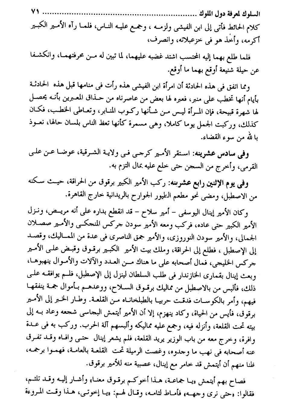 كَلَام الْحَائِط فَأتى إِلَى ابْن الفيشي وَلَزِمَه وَجمع عَلَيْهِ النَّاس فَلَمَّا رَآهُ الْأَمِير الْكَبِير أكْرمه وَأخذ هُوَ فِي خزعبلاته وَانْصَرف فَلَمَّا طلع بهما إِلَيْهِ الْمُحْتَسب اشْتَدَّ غَضَبه عَلَيْهِمَا لما تبين لَهُ من محرفتهما وانكشفا عَن حِيلَة شنيعة أوقع بهما مَا أوقع. وَمِمَّا اتّفق فِي هَذِه الْحَادِثَة أَن امْرَأَة ابْن الفيشي هَذِه رَأَتْ فِي منامها قبل هَذِه الْحَادِثَة بأيام أَنَّهَا تخْطب على مِنْبَر فعبره لَهَا بعض من عاصرناه من حذاق المعبرين بِأَنَّهُ يحصل لَهَا شهرة قبيحة فَإِن الْمَرْأَة لَيْسَ من شَأْنهَا ركُوب المنابر وتعاطي الْخطب فَكَانَ كَذَلِك وَركبت الْجمل يَوْمًا وَفِي سادس عشرينه: اسْتَقر الْأَمِير كرجي فِي ولَايَة الشرقية عوضا عَن عَليّ القرمي وَأخرج من السجْن حَتَّى خلع عَلَيْهِ. بِمَال الْتزم بِهِ. وَفِي يَوْم الْإِثْنَيْنِ رَابِع عشرينه: ركب الْأَمِير الْكَبِير برقوق من الحراقة حَيْثُ سكنه من الإصطبل وَمضى نَحْو مطعم الطُّيُور الْجَوَارِح بالريدانية خَارج الْقَاهِرَة. وَكَانَ الْأَمِير إينال اليوسفي - أَمِير سلَاح - قد انْقَطع بداره على أَنه مَرِيض وَنزل الْأَمِير الْكَبِير حَتَّى عَاده فَركب وَمَعَهُ الْأَمِير سودن جركس المنجكي والأمير صصلان الجمالي والأمير سودن النوروزي والأمير جمق الناصري فِي عمق من المماليك وَقصد إِلَى الإصطبل فطلع إِلَى الحراقة وَملك بَيت الْأَمِير الْكَبِير برقوق وَقبض على الْأَمِير جركس الخليجي فَمَال أَصْحَابه على مَا هُنَاكَ من الْعدَد والآلات وَالْأَمْوَال ينهبوها وَبعث إينال بقماري الخازندار فِي طلب السُّلْطَان لينزل إِلَى الإصطبل فَلم يُوَافقهُ على ذَلِك فألبس من بالإصطبل من مماليك برقوق السِّلَاح وَوَعدهمْ بأموال جمة ينفقها فيهم وَأمر بالكوسات فدقت حَرْبِيّا بالطلخاناه من القلعة. وطار الْخَبَر إِلَى الْأَمِير برقوق فأيس من الْحَيَاة وَكَاد ينهزم إِلَّا أَن الْأَمِير أيتمش البجاسي شجعه وَعَاد بِهِ إِلَى بَيته تَحت القلعة وأنزله فِيهِ وَجمع عَلَيْهِ مماليكه وألبسهم آلَة الْحَرْب. وَركب بِهِ فِي عدَّة وافرة وَخرج مَعَه من بَاب الْوَزير يُرِيد القلعة فَلم يشْعر إينال حَتَّى وافاه وَقد تفرق عَنهُ أَصْحَابه فِي نهب مَا وجدوه وغصت الرميلة تَحت القلعة بالعامة فَهموا برجمه ظنا مِنْهُم أَن أيتمش قد خامر مَعَ إينال عصبية مِنْهُ للأمير برقوق. فصاح بهم أيتمش يَا جمَاعَة هَذَا أخوكم برقوق مَعنا وَأَشَارَ إِلَيْهِ وَقد تلثم فَقَالُوا: حَتَّى نرى وَجهه فأماط لثامه وَقَالَ لَهُم: يَا إخوتي هَذَا وَقت الْمُرُوءَة