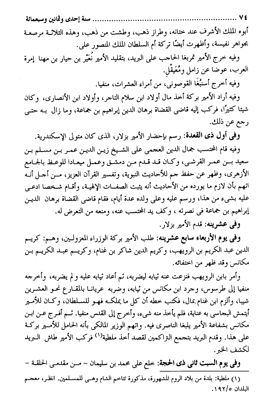 أَبوهُ الْملك الْأَشْرَف عِنْد ختانه وطراز ذهب وطشت من ذهب وَهَذِه الثَّلَاثَة مرصعة بجواهر نفيسة وأظهرت أَيْضا تَرِكَة أم السُّلْطَان الْملك الْمَنْصُور عَليّ. وَفِيه خرج الْأَمِير تمربغا الْحَاجِب على الْبَرِيد بتقليد الْأَمِير نُعَيْر بن حيار بن مهنا إمرة الْعَرَب عوضا عَن زامل ومُعَيقْلِ. وَفِيه أخرج أسنبُغَا القوصوني من أُمَرَاء العشرات منفيا. وَفِيه أَرَادَ الْأَمِير بركَة أَخذ مَال أَوْلَاد ابْن سَلام التَّاجِر وَأَوْلَاد ابْن الْأنْصَارِيّ وَكَانَ شَيْئا كثيرا فَركب إِلَيْهِ قَاضِي الْقُضَاة برهَان الدّين إِبْرَاهِيم بن جمَاعَة وَمَا زَالَ بِهِ حَتَّى رَجَعَ عَن ذَلِك. وَفِي أول ذِي الْقعدَة: رسم بإحضار الْأَمِير بزلار الَّذِي كَانَ مُتَوَلِّي الْإسْكَنْدَريَّة. وَفِيه قَامَ الْمُحْتَسب جمال الدّين العجمي على الشَّيْخ زين الدّين عمر بن مُسلم بن سعيد بن عمر الْقرشِي وَكَانَ قد قدم من دمشق وَعمل ميعادا للوعظ بالجامع الْأَزْهَرِي وَظهر عَن حفظ جم للأحاديث النَّبَوِيَّة وَتَفْسِير الْقُرْآن الْعَزِيز من أجل أَنه اتهمَ بِأَن لَازم مَا يُورِدهُ من الْأَحَادِيث أَنه يثبت الصِّفَات الإلهية وَأقَام شخصا ادّعى عَلَيْهِ بِشَيْء من هَذَا ورسم عَلَيْهِ وعَلى وَلَده عدَّة أَيَّام فَقَامَ قَاضِي الْقُضَاة برهَان الدّين إِبْرَاهِيم بن جمَاعَة فِي نصرته وكف يَد الْمُحْتَسب عَنهُ وَمنعه من التَّعَرُّض لَهُ. وَفِي عشرينه: قدم الْأَمِير بزلار. وَفِي يَوْم الْأَرْبَعَاء سَابِع عشرينه. طلب الْأَمِير بركَة الوزراء المعزولين وهم: كريم الدّين عبد الْكَرِيم بن الرويهب وكريم الدّين شَاكر بن غَنَّام وكريم عبد الْكَرِيم بن مكانس وَقد ظهر من اختفائه. وَأمر بِابْن الرويهب فنزعت عَنهُ ثِيَابه ليضربه ثمَّ أعَاد ثِيَابه عَلَيْهِ وَلم يضْربهُ وَأخرجه منفيا إِلَى طرسوس وجرد ابْن مكانس من ثِيَابه وضربه عُريَانا بالمقارع نَحْو الْعشْرين شيبا وألزم ابْن غَنَّام. بِمَال فَكتب خطه أَن كل مَا يملكهُ فَهُوَ للسُّلْطَان وَكَانَ للأمير أيتمش البجاسي بِهِ عناية فَلم يَأْخُذ مِنْهُ شَيْء وَأخرج إِلَى الْقُدس منفيا. ثمَّ أفرج عَن ابْن مكانس بشفاعة الْأَمِير يلبغا الناصري فِيهِ. واتهم الْوَزير الْمَالِكِي بِأَنَّهُ الْحَامِل للأمير بركَة على هَذَا. وَقدم الْبَرِيد بتجمع التراكمين لقصد أَخذ ملطة فَركب الْأَمِير طاش الْبَرِيد لكشف الْخَبَر. وَفِي يَوْم السبت ثَانِي ذِي الْحجَّة: خلع على مُحَمَّد بن سُلَيْمَان - من مقدمي الْحلقَة -