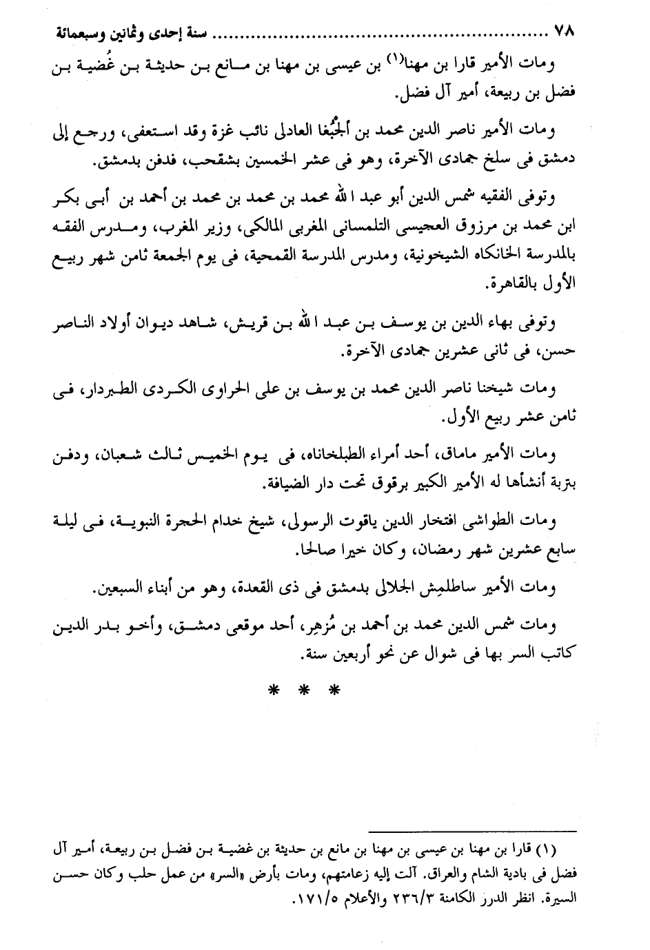 وَمَات الْأَمِير قارا بن مهنا بن عِيسَى بن مهنا بن مَانع بن حَدِيثَة بن غُضية بن فضل بن ربيعَة أَمِير آل فضل. وَمَات الْأَمِير نَاصِر الدّين مُحَمَّد بن ألجْبُغا العادلي نَائِب غَزَّة وَقد استعفى وَرجع إِلَى دمشق فِي سلخ جُمَادَى الْآخِرَة وَهُوَ فِي عشر الْخمسين بشقحب فَدفن بِدِمَشْق. وَتوفى الْفَقِيه شمس الدّين أَبُو عبد الله مُحَمَّد بن مُحَمَّد بن مُحَمَّد بن أَحْمد بن أبي بكر بن مُحَمَّد بن مَرْزُوق العجيسي التلمساني المغربي الْمَالِكِي وَزِير الْمغرب ومدرس الْفِقْه بِالْمَدْرَسَةِ الخانكاه الشيخونية ومدرس الْمدرسَة القمحية فِي يَوْم الْجُمُعَة ثامن شهر ربيع الأول بِالْقَاهِرَةِ. وَتوفى بهاء الدّين بن يُوسُف بن عبد الله بن قُرَيْش شَاهد ديوَان أَوْلَاد النَّاصِر حسن فِي ثَانِي عشْرين جُمَادَى الْآخِرَة. وَمَات شَيخنَا نَاصِر الدّين مُحَمَّد بن يُوسُف بن عَليّ الحراوي الْكرْدِي الطبردار فِي ثامن عشر ربيع الأول. وَمَات الْأَمِير ماماق أحد أُمَرَاء الطبلخاناه فِي يَوْم الْخَمِيس ثَالِث شعْبَان وَدفن بتربة أَنْشَأَهَا لَهُ الْأَمِير الْكَبِير برقوق تَحت دَار الضِّيَافَة. وَمَات الطواشي افتخار الدّين ياقوت الرسولي شيخ خدام الْحُجْرَة النَّبَوِيَّة فِي لَيْلَة سَابِع عشْرين وَمَات الْأَمِير ساطلمِش الجلالي بِدِمَشْق فِي ذِي الْقعدَة وَهُوَ من أَبنَاء السّبْعين. وَمَات شمس الدّين مُحَمَّد بن أَحْمد بن مُزهِر أحد موقعي دمشق وأخو بدر الدّين كَاتب السِّرّ بهَا فِي شَوَّال عَن نَحْو أَرْبَعِينَ سنة.