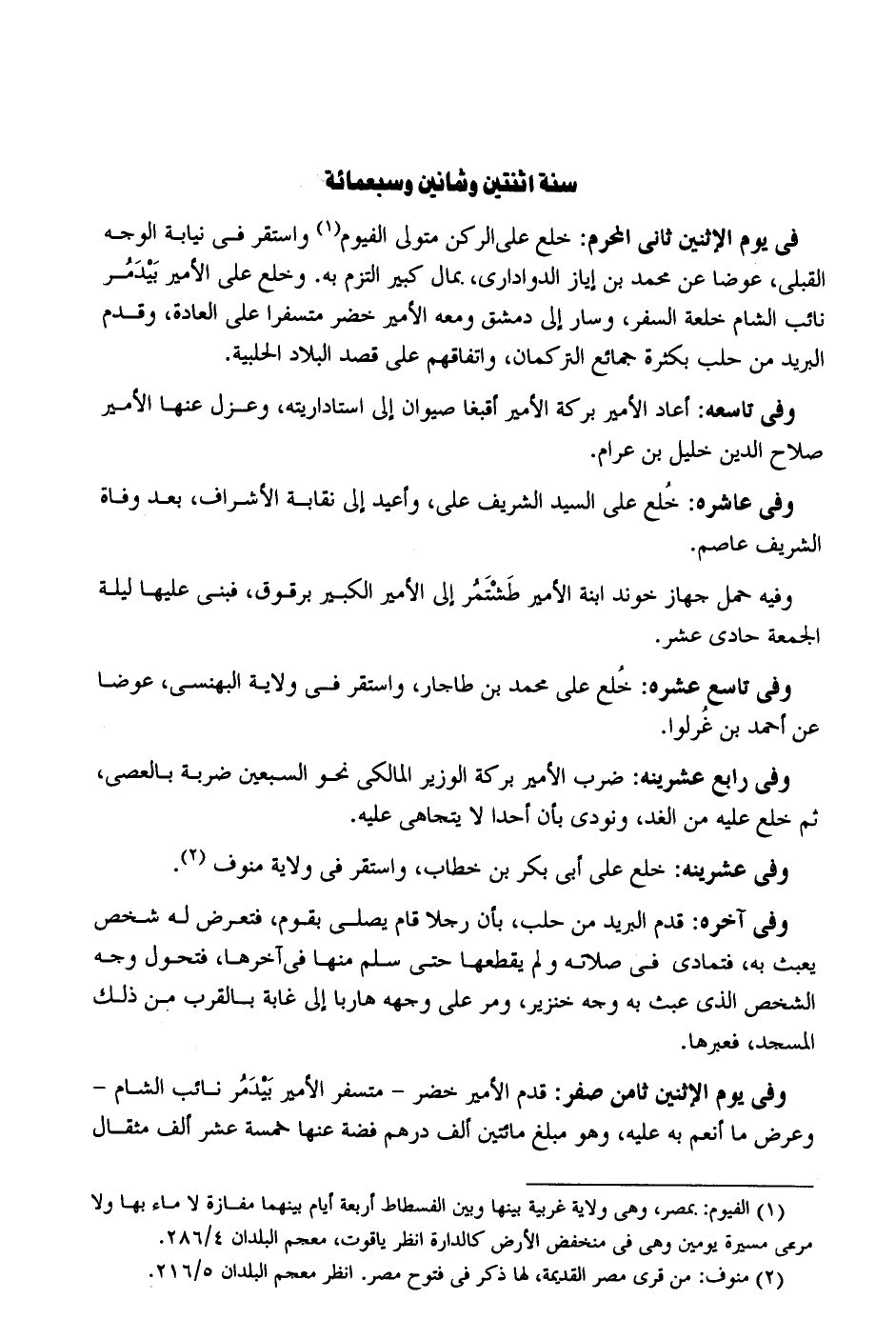 فِي يَوْم الْإِثْنَيْنِ ثَانِي الْمحرم: خلع على الرُّكْن مُتَوَلِّي الفيوم وَاسْتقر فِي نِيَابَة الْوَجْه القبلي عوضا عَن مُحَمَّد بن إياز الدوادارى. بِمَال كَبِير الْتزم بِهِ. وخلع على الْأَمِير بَيْدَمُر نَائِب الشَّام خلعة السّفر وَسَار إِلَى دمشق وَمَعَهُ الْأَمِير خضر متسفرا على الْعَادة وَقدم الْبَرِيد من حلب بِكَثْرَة جمائع التركمان واتفاقهم على قصد الْبِلَاد الحلبية. وَفِي تاسعه: أعَاد الْأَمِير بركَة الْأَمِير أقبغا صيوان إِلَى استاداريته وعزل عَنْهَا الْأَمِير صَلَاح الدّين خَلِيل بن عرام وَفِي عاشره: خلع على السَّيِّد الشريف عَليّ وأعيد إِلَى نقابة الْأَشْرَاف بعد وَفَاة الشريف عَاصِم. وَفِيه حمل جهاز خوند ابْنة الْأَمِير طَشْتَمُر إِلَى الْأَمِير الْكَبِير برقوق فَبنى عَلَيْهَا لَيْلَة الْجُمُعَة حادي عشر وَفِي تَاسِع عشره: خُلع على مُحَمَّد بن طاجار وَاسْتقر فِي ولَايَة البهنسي عوضا عَن أَحْمد بن غُرلوا. وَفِي رَابِع عشرينه: ضرب الْأَمِير بركَة الْوَزير الْمَالِكِي نَحْو السّبْعين ضَرْبَة بالعصى ثمَّ خلع عَلَيْهِ من الْغَد وَنُودِيَ بِأَن أحدا لَا يتجاهى عَلَيْهِ. وَفِي عشرينه: خلع على أبي بكر بن خطاب وَاسْتقر فِي ولَايَة منوف وَفِي آخِره: قدم الْبَرِيد من حلب بِأَن رجلا قَامَ يُصَلِّي بِقوم فتعرض لَهُ شخص يعبث بِهِ فتمادى فِي صلَاته وَلم يقطعهَا حَتَّى سلم مِنْهَا فِي آخرهَا فتحول وَجه الشَّخْص الَّذِي عَبث بِهِ وَجه خِنْزِير وَمر على وَجهه هَارِبا إِلَى غابة بِالْقربِ من ذَلِك الْمَسْجِد فعبرها. وَفِي يَوْم الْإِثْنَيْنِ ثامن صفر: قدم الْأَمِير خضر - متسفر الْأَمِير بيدمر نَائِب الشَّام - وَعرض مَا أنعم بِهِ عَلَيْهِ وَهُوَ مبلغ مِائَتَيْنِ ألف دِرْهَم فضَّة عَنْهَا خَمْسَة عشر ألف مِثْقَال