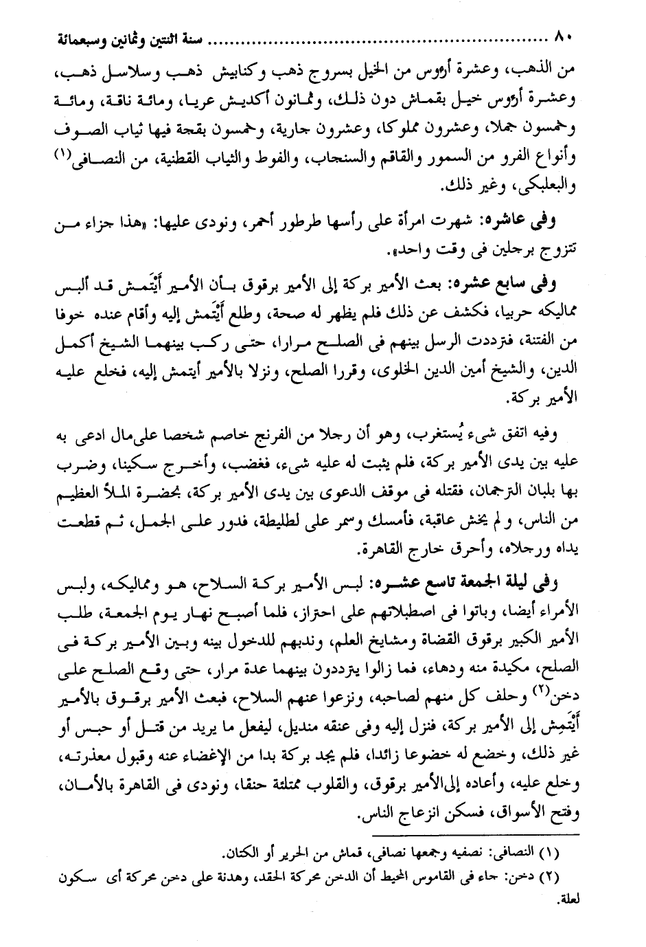 من الذَّهَب وَعشرَة أرءوس من الْخَيل بسروج ذهب وكنابيش ذهب وسلاسل ذهب وَعشرَة أرءوس خيل بقماش دون ذَلِك وَثَمَانُونَ أكديش عريا وَمِائَة نَاقَة وَمِائَة وَخَمْسُونَ جملا وَعِشْرُونَ مَمْلُوكا وَعِشْرُونَ جَارِيَة وَخَمْسُونَ بقجة فِيهَا ثِيَاب الصُّوف وأنواع الفرو من السمور والقاقم والسنجاب والفوط وَالثيَاب القطنية من النصافي والبعلبكي وَغير ذَلِك. وَفِي عاشره: شهرت امْرَأَة على رَأسهَا طرطور أَحْمَر وَنُودِيَ عَلَيْهَا: هَذَا جَزَاء من تتَزَوَّج برجلَيْن فِي وَقت وَاحِد. وَفِي سَابِع عشره: بعث الْأَمِير بركَة إِلَى الْأَمِير برقوق بِأَن الْأَمِير أَيتمش قد ألبس مماليكه حَرْبِيّا فكشف عَن ذَلِك فَلم يظْهر لَهُ صِحَة وطلع أَيْتمش إِلَيْهِ وَأقَام عِنْده خوفًا من الْفِتْنَة فترددت الرُّسُل بَينهم فِي الصُّلْح مرَارًا حَتَّى ركب بَينهمَا الشَّيْخ أكمل الدّين وَالشَّيْخ أَمِين الدّين الخلوى وقررا الصُّلْح وَنزلا بالأمير أيتمش إِلَيْهِ فَخلع عَلَيْهِ الْأَمِير بركَة. وَفِيه اتّفق شَيْء يُستغرب وَهُوَ أَن رجلا من الفرنج خَاصم شخصا على مَال ادّعى بِهِ عَلَيْهِ بَين يَدي الْأَمِير بركَة فَلم يثبت لَهُ عَلَيْهِ شَيْء فَغَضب وَأخرج سكينا وَضرب بهَا بلبان الترجمان فَقتله فِي موقف الدَّعْوَى بَين يَدي الْأَمِير بركَة بِحَضْرَة الْمَلأ الْعَظِيم من النَّاس وَلم يخْش عَاقِبَة فَأمْسك وَسمر على لطليطة فدور على الْجمل ثمَّ قطعت يَدَاهُ وَرجلَاهُ وأحرق خَارج الْقَاهِرَة. وَفِي لَيْلَة الْجُمُعَة تَاسِع عشره: لبس الْأَمِير بركَة السِّلَاح هُوَ ومماليكه وَلبس الْأُمَرَاء أَيْضا وَبَاتُوا فِي اصطبلاتهم على احْتِرَاز فَلَمَّا أصبح نَهَار يَوْم الْجُمُعَة طلب الْأَمِير الْكَبِير برقوق الْقُضَاة ومشايخ الْعلم وندبهم للدخول بَينه وَبَين الْأَمِير بركَة فِي الصُّلْح مكيدة مِنْهُ ودهاء فَمَا زَالُوا يَتَرَدَّدُونَ بَينهمَا عدَّة مرار حَتَّى وَقع الصُّلْح على دخن وَحلف كل مِنْهُم لصَاحبه ونزعوا عَنْهُم السِّلَاح فَبعث الْأَمِير برقوق بالأمير أَيْتَمِش إِلَى الْأَمِير بركَة فَنزل إِلَيْهِ وَفِي عُنُقه منديل ليفعل مَا يُرِيد من قتل أَو حبس أَو غير ذَلِك وخضع لَهُ خضوعا زَائِدا فَلم يجد بركَة بدا من الإغضاء عَنهُ وَقبُول معذرته وخلع عَلَيْهِ وَأَعَادَهُ إِلَى الْأَمِير برقوق والقلوب ممتلئة حنقا وَنُودِيَ فِي الْقَاهِرَة بالأمان وَفتح الْأَسْوَاق فسكن انزعاج النَّاس.
