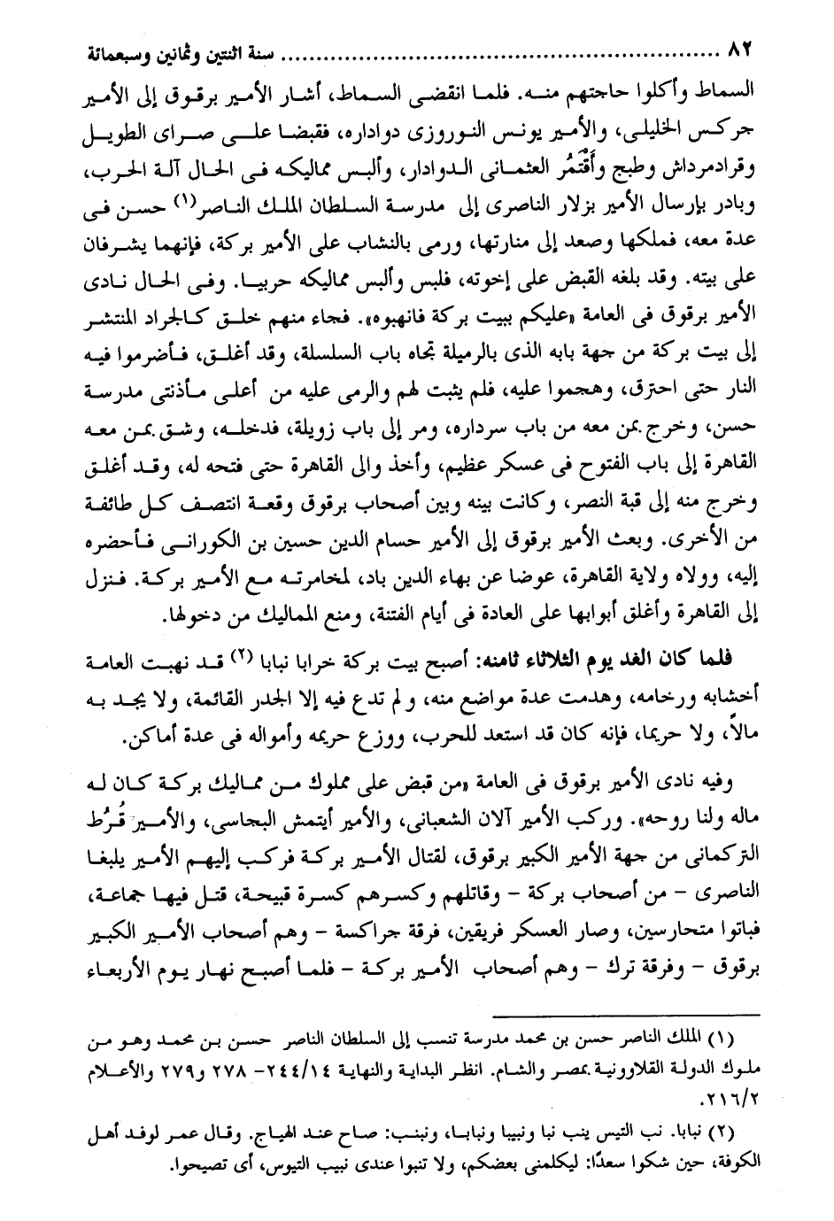 السماط وأكلوا حَاجتهم مِنْهُ. فَلَمَّا انْقَضى السماط أَشَارَ الْأَمِير برقوق إِلَى الْأَمِير جركس الخليلي والأمير يُونُس النوروزي دواداره فقبضا على صراي الطَّوِيل وقرادمرداش وطبج وأَقتمُر العثماني الدوادار وألبس مماليكه فِي الْحَال آلَة الْحَرْب وبادر بإرسال الْأَمِير بزلار الناصري إِلَى مدرسة السُّلْطَان الْملك النَّاصِر حسن فِي عدَّة مَعَه فملكها وَصعد إِلَى منارتها وَرمى بالنشاب على الْأَمِير بركَة فَإِنَّهُمَا يشرفان على بَيته. وَقد بلغه الْقَبْض على إخْوَته فَلبس وألبس مماليكه حَرْبِيّا. وَفِي الْحَال نَادَى الْأَمِير برقوق فِي الْعَامَّة عَلَيْكُم بِبَيْت بركَة فانهبوه. فجَاء مِنْهُم خلق كالجراد الْمُنْتَشِر إِلَى بَيت بركَة من جِهَة بَابه الَّذِي بالرميلة تجاه بَاب السلسلة وَقد أغلق فأضرموا فِيهِ النَّار حَتَّى احْتَرَقَ وهجموا عَلَيْهِ فَلم يثبت لَهُم وَالرَّمْي عَلَيْهِ من أَعلَى مأذنتي مدرسة حسن وَخرج. بِمن مَعَه من بَاب سرداره وَمر إِلَى بَاب زويلة فدخله وشق. بِمن مَعَه الْقَاهِرَة إِلَى بَاب الْفتُوح فِي عَسْكَر عَظِيم وَأخذ وَالِي الْقَاهِرَة حَتَّى فَتحه لَهُ وَقد أغلق وَخرج مِنْهُ إِلَى قبَّة النَّصْر وَكَانَت بَينه وَبَين أَصْحَاب برقوق وقْعَة انتصف كل طَائِفَة من الْأُخْرَى. وَبعث الْأَمِير برقوق إِلَى الْأَمِير حسام الدّين حُسَيْن بن الكوراني فَأحْضرهُ إِلَيْهِ وولاه ولَايَة الْقَاهِرَة عوضا عَن بهاء الدّين باد لمخامرته مَعَ الْأَمِير بركَة. فَنزل إِلَى الْقَاهِرَة وأغلق أَبْوَابهَا على الْعَادة فِي أَيَّام الْفِتْنَة وَمنع المماليك من دُخُولهَا. فَلَمَّا كَانَ الْغَد يَوْم الثُّلَاثَاء ثامنه: أصبح بَيت بركَة خرابا نبابا قد نهبت الْعَامَّة أخشابه ورخامه وهدمت عدَّة مَوَاضِع مِنْهُ وَلم تدع فِيهِ إِلَّا الْجدر الْقَائِمَة وَلَا يجد بِهِ مَالا وَلَا حريما فَإِنَّهُ كَانَ قد استعد للحرب ووزع حريمه وأمواله فِي عدَّة أَمَاكِن. وَفِيه نَادَى الْأَمِير برقوق فِي الْعَامَّة من قبض على مَمْلُوك من مماليك بركَة كَانَ لَهُ مَاله وَلنَا روحه. وَركب الْأَمِير آلان الشَّعْبَانِي والأمير أيتمش البجاسي والأمير قُرُط التركماني من جِهَة الْأَمِير الْكَبِير برقوق لقِتَال الْأَمِير بركَة فَركب إِلَيْهِم الْأَمِير يلبغا الناصري - من أَصْحَاب بركَة - وَقَاتلهمْ وكسرهم كسرة قبيحة قتل فِيهَا جمَاعَة فَبَاتُوا متحارسين وَصَارَ الْعَسْكَر فريقين فرقة جراكسة - وهم أَصْحَاب الْأَمِير الْكَبِير برقوق - وَفرْقَة ترك - وهم أَصْحَاب الْأَمِير بركَة - فَلَمَّا أصبح نَهَار يَوْم الْأَرْبَعَاء