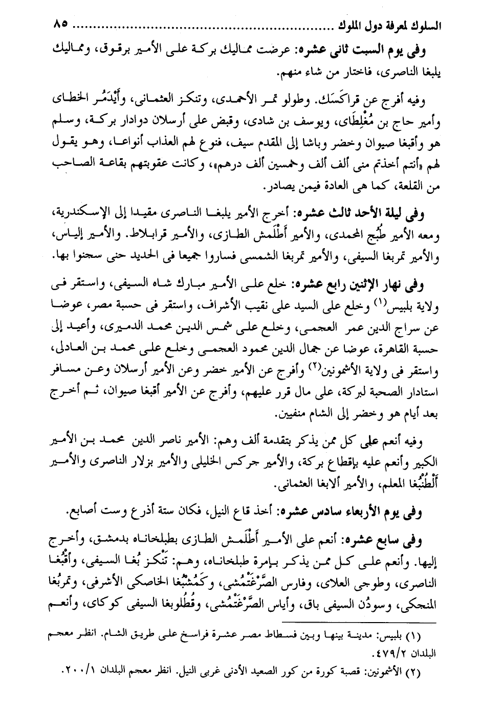 وَفِي يَوْم السبت ثَانِي عشره: عرضت مماليك بركَة على الْأَمِير برقوق ومماليك يلبغا الناصري فَاخْتَارَ من شَاءَ مِنْهُم. وَفِيه أفرج عَن قراكَسَك. وطولو تمر الأحمدي وتنكز العثماني وأَيْدَمُر الخطاي وأمير حَاج بن مُغْلِطَاي ويوسف بن شادي وَقبض على أرسلان دوادار بركَة وَسلم هُوَ وأقبغا صيوان وخضر وباشا إِلَى الْمُقدم سيف فنوع لَهُم الْعَذَاب أنواعا وَهُوَ يَقُول لَهُم أَنْتُم أَخَذْتُم مني ألف ألف وَخمسين ألف دِرْهَم وَكَانَت عقوبتهم بقاعة الصاحب من القلعة كَمَا هِيَ الْعَادة فِيمَن يصادر. وَفِي لَيْلَة الْأَحَد ثَالِث عشره: أخرج الْأَمِير يلبغا الناصري مُقَيّدا إِلَى الْإسْكَنْدَريَّة وَمَعَهُ الْأَمِير طُبُج المحمدي والأمير أَطْلَمش الطازي والأمير قرابلاط. والأمير إلْيَاس والأمير تمربغا السيفي والأمير تمربغا الشمسي فَسَارُوا جَمِيعًا فِي الْحَدِيد حَتَّى سجنوا بهَا. وَفِي نَهَار الْإِثْنَيْنِ رَابِع عشره: خلع على الْأَمِير مبارك شاه السيفي وَاسْتقر فِي ولَايَة بلبيس وخلع على السَّيِّد على نقيب الْأَشْرَاف وَاسْتقر فِي حسبَة مصر عوضا عَن سراج الدّين عمر العجمي وخلع على شمس الدّين مُحَمَّد الدَّمِيرِيّ وأعيد إِلَى حسبَة الْقَاهِرَة عوضا عَن جمال الدّين مَحْمُود العجمي وخلع على مُحَمَّد بن العادلي وَاسْتقر فِي ولَايَة الأشمونين وَأَفْرج عَن الْأَمِير خضر وَعَن الْأَمِير أرسلان وَعَن مُسَافر استادار الصُّحْبَة لبركة على مَال قرر عَلَيْهِم وَأَفْرج عَن الْأَمِير أقبغا صيوان ثمَّ أخرج بعد أَيَّام هُوَ وخضر إِلَى الشَّام منفيين. وَفِيه أنعم على كل مِمَّن يذكر بتقدمة ألف وهم: الْأَمِير نَاصِر الدّين مُحَمَّد بن الْأَمِير الْكَبِير وأنعم عَلَيْهِ بإقطاع بركَة والأمير جركس الخليلي والأمير بزلار الناصري والأمير أَلْطنبُغا الْمعلم والأمير ألابغا العثماني. وَفِي يَوْم الْأَرْبَعَاء سادس عشره: أَخذ قاع النّيل فَكَانَ سِتَّة أَذْرع وست أَصَابِع. وَفِي سَابِع عشره: أنعم على الْأَمِير أَطْلَمش الطازي بطبلخاناه بِدِمَشْق وَأخرج إِلَيْهَا. وأنعم على كل مِمَّن يذكر بإمرة طبلخاناه وهم: تَنْكز بُغا السيفي وأقبُغا الناصري وطوجي العلاي وَفَارِس الصَّرْغَتْمُشى وكَمُشبغا الخاصكي الأشرفي وتمربُغا المنجكي وسودُن السيفي بَاقٍ وأياس الصَّرْغَتْمُشي وقُطُلوبغا السيفي كوكاي وأنعم
