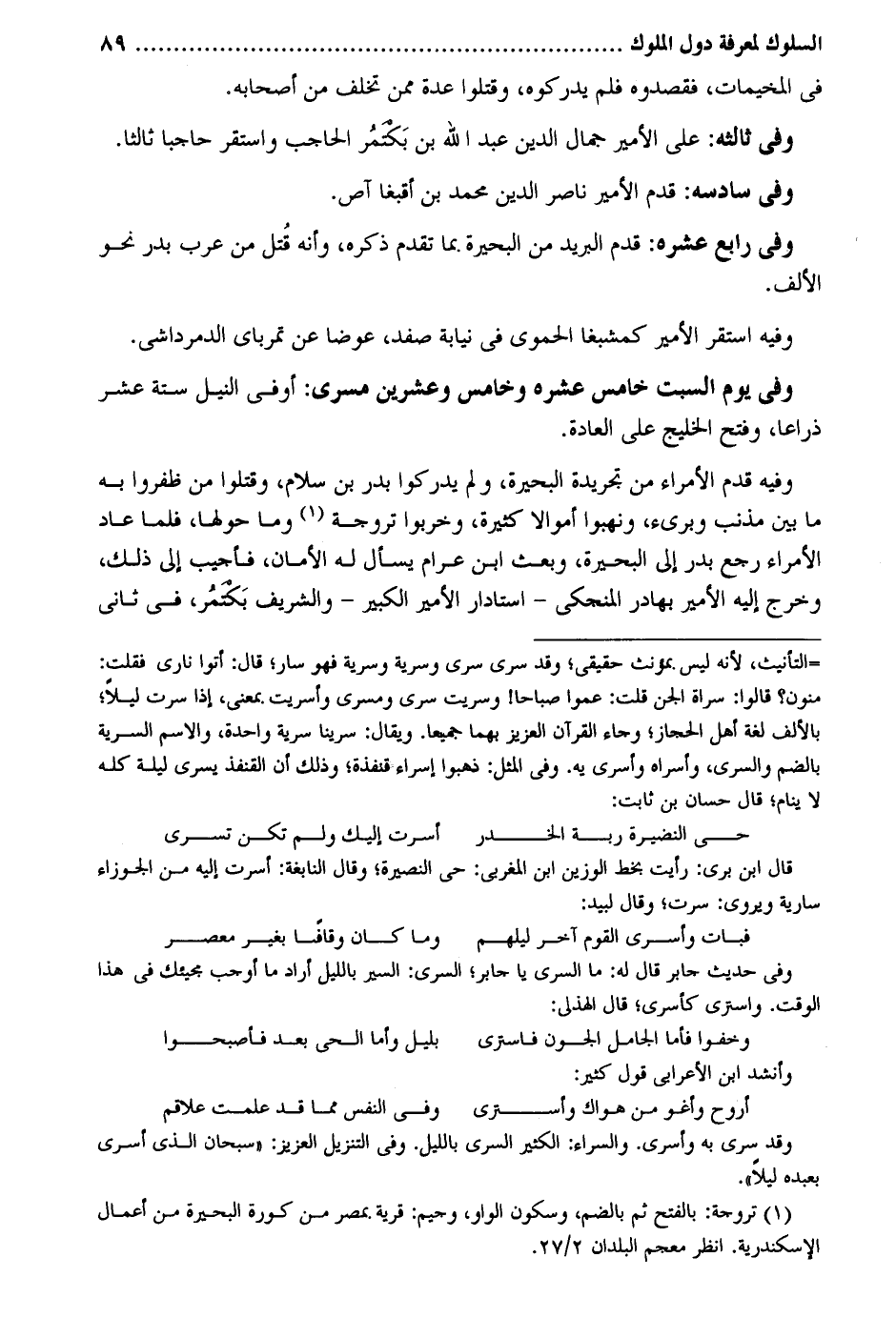 فِي المخيمات فقصدوه فَلم يدركوه وَقتلُوا عدَّة مِمَّن تخلف من أَصْحَابه. وَفِي ثالثه: على الْأَمِير جمال الدّين عبد الله بن بَكتمُر الْحَاجِب وَاسْتقر حاجبا ثَالِثا وَفِي سادسه: قدم الْأَمِير نَاصِر الدّين مُحَمَّد بن آقبغا آص. وَفِي رَابِع عشره: قدم الْبَرِيد من الْبحيرَة بِمَا تقدم ذكره وَأَنه قُتل من عرب بدر نَحْو الْألف. وَفِيه اسْتَقر الْأَمِير كمشبغا الْحَمَوِيّ فِي نِيَابَة صفد عوضا عَن تمرباي الدمرداشي. وَفِي يَوْم السبت خَامِس عشره وخامس وَعشْرين مسرى: أوفى النّيل سِتَّة عشر ذِرَاعا وَفتح وَفِيه قدم الْأُمَرَاء من تجريدة الْبحيرَة وَلم يدركوا بدر بن سَلام وَقتلُوا من ظفروا بِهِ مَا بَين مذنب وبريء ونهبوا أَمْوَالًا كَثِيرَة وخربوا تروجة وَمَا حولهَا فَلَمَّا عَاد الْأُمَرَاء رَجَعَ بدر إِلَى الْبحيرَة وَبعث ابْن عرام يسْأَل لَهُ الْأمان فَأُجِيب إِلَى ذَلِك وَخرج إِلَيْهِ الْأَمِير بهادر المنجكي - استادار الْأَمِير الْكَبِير - والشريف بَكتمُر فِي ثَانِي