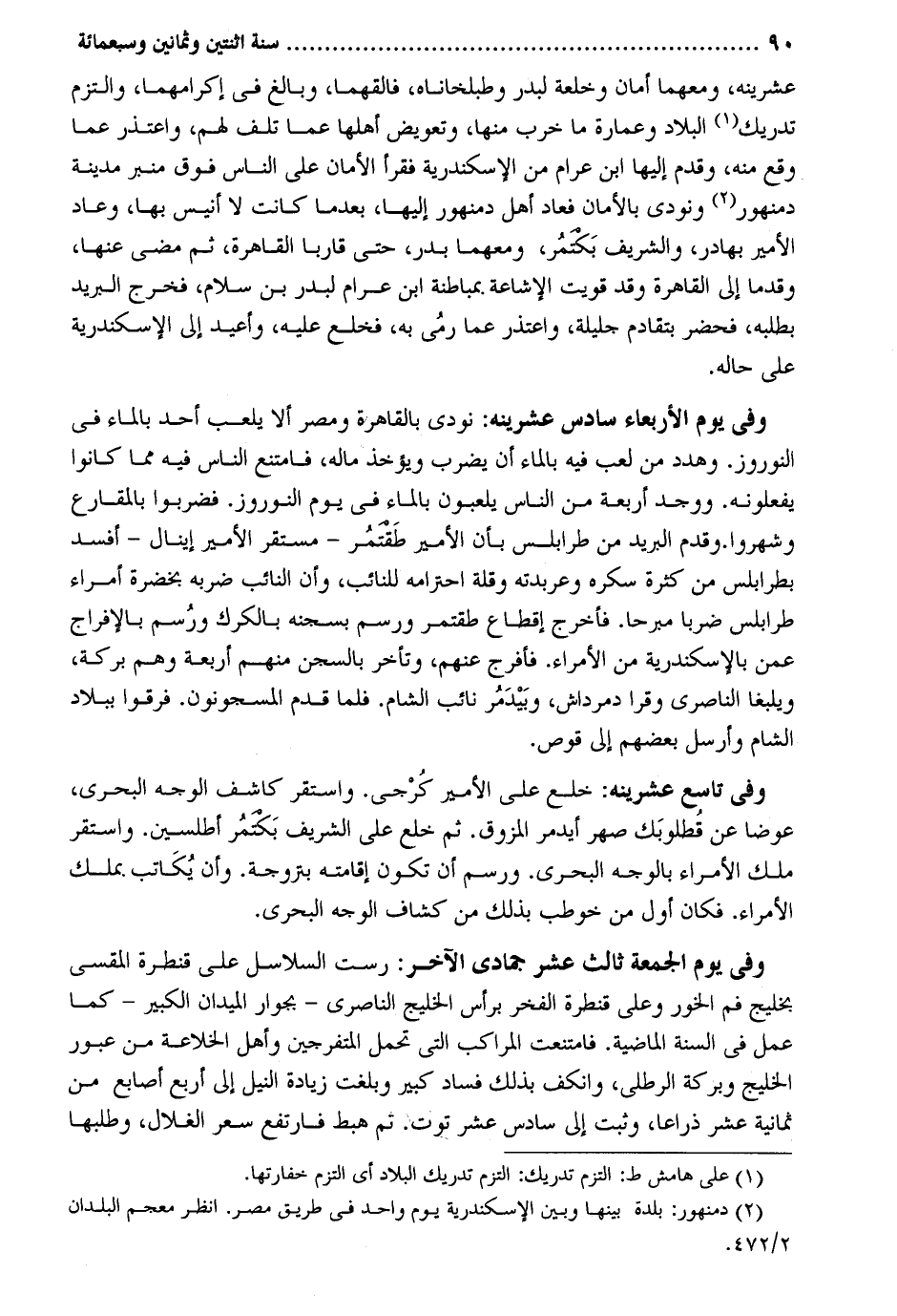 عشرينه ومعهما أَمَان وخلعة لبدر وطبلخاناه فالقهما وَبَالغ فِي إكرامهما وَالْتزم تدريك الْبِلَاد وَعمارَة مَا خرب مِنْهَا وتعويض أَهلهَا عَمَّا تلف لَهُم وَاعْتذر عَمَّا وَقع مِنْهُ وَقدم إِلَيْهَا ابْن عرام من الْإسْكَنْدَريَّة فَقَرَأَ الْأمان على النَّاس فَوق مِنْبَر مَدِينَة دمنهور وَنُودِيَ بالأمان فَعَاد أهل دمنهور إِلَيْهَا بَعْدَمَا كَانَت لَا أنيس بهَا وَعَاد الْأَمِير بهادر والشريف بَكتمُر ومعهما بدر حَتَّى قاربا الْقَاهِرَة ثمَّ مضى عَنْهَا وقدما إِلَى الْقَاهِرَة وَقد قويت الإشاعة. بمباطنة ابْن عرام لبدر بن سَلام فَخرج الْبَرِيد بِطَلَبِهِ فَحَضَرَ بتقادم جليلة وَاعْتذر عَمَّا رمُى بِهِ فَخلع عَلَيْهِ وأعيد إِلَى الْإسْكَنْدَريَّة على حَاله. وَفِي يَوْم الْأَرْبَعَاء سادس عشرينه: نُودي بِالْقَاهِرَةِ ومصر أَلا يلْعَب أحد بِالْمَاءِ فِي النوروز. وهدد من لعب فِيهِ بِالْمَاءِ أَن يضْرب وَيُؤْخَذ مَاله فَامْتنعَ النَّاس فِيهِ مِمَّا كَانُوا يَفْعَلُونَهُ. وَوجد أَرْبَعَة من النَّاس يَلْعَبُونَ بِالْمَاءِ فِي يَوْم النوروز. فَضربُوا بالمقارع وشهروا. وَقدم الْبَرِيد من طرابلس بِأَن الْأَمِير طَقتمُر - مُسْتَقر الْأَمِير إينال - أفسد بطرابلس من كَثْرَة سكره وعربدته وَقلة احترامه للنائب وَأَن النَّائِب ضربه بِحَضْرَة أُمَرَاء طرابلس ضربا مبرحا. فَأخْرج إقطاع طقتمر ورسم بسجنه بالكرك ورُسم بالإفراج عَمَّن بالإسكندرية من الْأُمَرَاء. فأفرج عَنْهُم وَتَأَخر بالسجن مِنْهُم أَرْبَعَة وهم بركَة ويلبغا الناصري وقرا دمرداش وبَيْدَمُر نَائِب الشَّام. فَلَمَّا قدم المسجونون. فرقوا بِبِلَاد الشَّام وَأرْسل بَعضهم إِلَى قوص. وَفِي تَاسِع عشرينه: خلع على الْأَمِير كرجي. وَاسْتقر كاشف الْوَجْه البحري عوضا عَن قُطلوبَك صهر أيدمر المزوق. ثمَّ خلع على الشريف بَكتمُر أطلسين. وَاسْتقر ملك الْأُمَرَاء بِالْوَجْهِ البحري. ورسم أَن تكون إِقَامَته بتروجة. وَأَن يُكَاتب. بِملك الْأُمَرَاء. فَكَانَ أول من خُوطِبَ بذلك من كشاف الْوَجْه البحري. وَفِي يَوْم الْجُمُعَة ثَالِث عشر جُمَادَى الآخر: رست السلَاسِل على قنطرة المقسي بخليج فَم الخور وعَلى قنطرة الْفَخر بِرَأْس الخليج الناصري - بجوار الميدان الْكَبِير - كَمَا عمل فِي السّنة الْمَاضِيَة. فامتنعت المراكب الَّتِي تحمل المتفرجين وَأهل الخلاعة من عبور الخليج وبركة الرطلي وانكف بذلك فَسَاد كَبِير وَبَلغت زِيَادَة النّيل إِلَى أَربع أَصَابِع من ثَمَانِيَة عشر ذِرَاعا وَثَبت إِلَى سادس عشر توت. ثمَّ هَبَط فارتفع سعر الغلال وطلبها