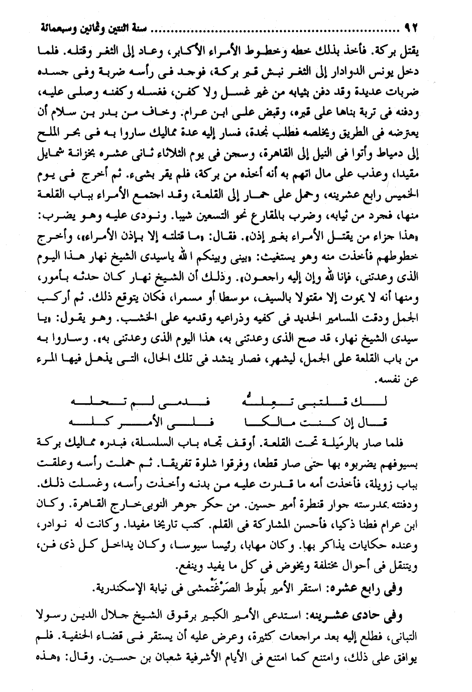 يقتل بركَة. فَأخذ بذلك خطه وخطوط الْأُمَرَاء الأكابر وَعَاد إِلَى الثغر وَقَتله. فَلَمَّا دخل يُونُس الدوادار إِلَى الثغر نبش قبر بركَة فَوجدَ فِي رَأسه ضَرْبَة وَفِي جسده ضربات عديدة وَقد دفن بثيابه من غير غسل وَلَا كفن فَغسله وكفنه وَصلى عَلَيْهِ وَدَفنه فِي تربة بناها على قَبره. وَقبض على ابْن عرام. وَخَافَ من بدر بن سَلام أَن يَعْتَرِضهُ فِي الطَّرِيق وَيُخَلِّصهُ فَطلب نجدة فَسَار إِلَيْهِ عدَّة مماليك سَارُوا بِهِ فِي بَحر الْملح إِلَى دمياط وَأتوا فِي النّيل إِلَى القاهر وسجن فِي يَوْم الثُّلَاثَاء ثَانِي عشره بخزانة شمايل مُقَيّدا وعذب على مَال اتهمَ أَنه أَخذه من بركَة فَلم يقر بِشَيْء. ثمَّ أخرج فِي يَوْم الْخَمِيس رَابِع عشرينه وَحمل على حمَار إِلَى القلعة وَقد اجْتمع الْأُمَرَاء بِبَاب القلعة مِنْهَا فَجرد من ثِيَابه وَضرب بالمقارع نَحْو التسعين شيبا. وَنُودِيَ عَلَيْهِ وَهُوَ يضْرب: هَذَا جَزَاء من يقتل الْأُمَرَاء بِغَيْر إِذن. فَقَالَ: مَا قتلته إِلَّا بِإِذن الْأُمَرَاء وَأخرج خطوطهم فَأخذت مِنْهُ وَهُوَ بستغيث: بيني وَبَيْنكُم اللهّ ياسيدي الشَّيْخ نَهَار هَذَا الْيَوْم الَّذِي وَعَدتنِي فَإنَّا لله وَإِن إِلَيْهِ رَاجِعُون. وَذَلِكَ أَن الشَّيْخ نَهَار كَانَ حَدثهُ بِأُمُور وَمِنْهَا أَنه لَا يَمُوت إِلَّا مقتولا بِالسَّيْفِ موسطا أَو مسمرا فَكَانَ يتَوَقَّع ذَلِك. ثمَّ أركب الْجمل ودقت المسامير الْحَدِيد فِي كفيه وذراعيه وقدميه على الْخشب. وَهُوَ يَقُول: يَا سَيِّدي الشَّيْخ نَهَار قد صَحَّ الَّذِي وَعَدتنِي بِهِ هَذَا الْيَوْم الَّذِي وَعَدتنِي بِهِ. وَسَارُوا بِهِ من بَاب القلعة على الْجمل ليشهر فَصَارَ ينشد فِي تِلْكَ الْحَال الَّتِي يذهل فِيهَا الْمَرْء عَن نَفسه. لَك قلتبى تعِله فدمى لم تحله قَالَ إِن كنت مَالِكًا فلي الْأَمر كُله فَلَمَّا صَار بالرمَيلة تَحت القلعة. أوقف تجاه بَاب السلسلة فبدره مماليك بركَة بسيوفهم يضربوه بهَا حَتَّى صَار قطعا وَفرقُوا شلوة تفريقا. ثمَّ حملت رَأسه وعلقت بِبَاب زويلة فَأخذت أمه مَا قدرت عَلَيْهِ من بدنه وَأخذت رَأسه وغسلت ذَلِك. ودفنته. بمدرسته جوَار قنطرة أَمِير حُسَيْن. من حكر جَوْهَر النوبي خَارج الْقَاهِرَة. وَكَانَ ابْن عرام فطنا ذكيا فَأحْسن الْمُشَاركَة فِي الْقَلَم. كتب تَارِيخا مُفِيدا. وَكَانَت لَهُ نَوَادِر وَعِنْده حكايات يذاكر بهَا. وَكَانَ مهابا رَئِيسا سيوسا وَكَانَ يداخل كل ذِي فن ويتنقل فِي أَحْوَال مُخْتَلفَة ويخوض فِي كل مَا يُفِيد وينفع. وَفِي رَابِع عشره: اسْتَقر الْأَمِير بلّوط الصَرغَتْمشى فِي نِيَابَة الْإسْكَنْدَريَّة. وَفِي حادي عشرينه: استدعى الْأَمِير الْكَبِير برقوق الشَّيْخ جلال الدّين رَسُولا التباني فطلع إِلَيْهِ بعد مراجعات كَثِيرَة وَعرض عَلَيْهِ أَن يسْتَقرّ فِي قَضَاء الْحَنَفِيَّة. فَلم يُوَافق على ذَلِك وَامْتنع كَمَا امْتنع فِي الْأَيَّام الأشرفية شعْبَان بن حُسَيْن. وَقَالَ: هَذِه