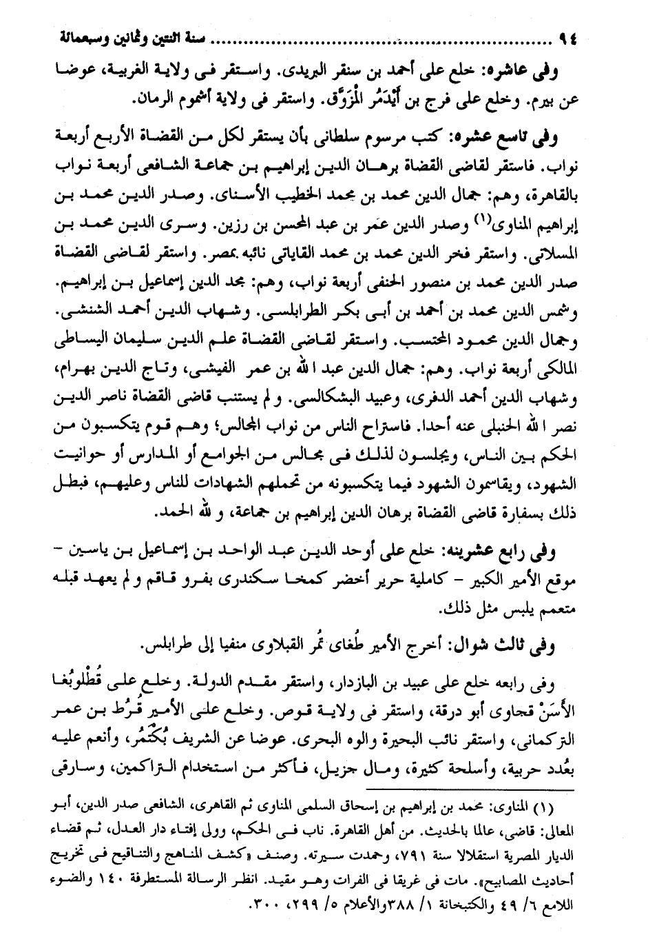 وَفِي عاشره: خلع على أَحْمد بن سنقر البريدي. وَاسْتقر فِي ولَايَة الغربية عوضا عَن بيرم. وخلع على فرج بن أيدَمُر المرزوق وَاسْتقر فِي ولَايَة أشموم الرُّمَّان. وَفِي تَاسِع عشره: كتب مرسوم سلطاني ثَان يسْتَقرّ لكل من الْقُضَاة الْأَرْبَع أَرْبَعَة نواب. فاستقر لقَاضِي الْقُضَاة برهَان الدّين إِبْرَاهِيم بن جمَاعَة الشَّافِعِي أَرْبَعَة نواب بِالْقَاهِرَةِ وهم: جمال الدّين مُحَمَّد بن مُحَمَّد الْخَطِيب الأسناي. وَصدر الدّين مُحَمَّد بن إِبْرَاهِيم الْمَنَاوِيّ وَصدر الدّين عمَر بن عبد المحسن بن رزين. وسرى الدّين مُحَمَّد بن المسلاتي. وَاسْتقر فَخر الدّين مُحَمَّد بن مُحَمَّد القاياتي نَائِبه بِمصْر. وَاسْتقر لقَاضِي الْقُضَاة صدر الدّين مُحَمَّد بن مَنْصُور الْحَنَفِيّ أَرْبَعَة نواب وهم: مجد الدّين إِسْمَاعِيل بن إِبْرَاهِيم. وشمس الدّين مُحَمَّد بن أَحْمد بن أبي بكر الطرابلسي. وشهاب الدّين أَحْمد الشنشي. وجمال الدّين مَحْمُود الْمُحْتَسب. وَاسْتقر لقَاضِي الْقُضَاة علم الدّين سُلَيْمَان اليساطي الْمَالِكِي أَرْبَعَة نواب. وهم: جمال الدّين عبد الله بن عمر الفيشي وتاج الدّين بهْرَام وشهاب الدّين أَحْمد الدفري وَعبيد البشكالسي. وَلم يستنب قَاضِي الْقُضَاة نَاصِر الدّين نصر الله الْحَنْبَلِيّ عَنهُ أحدا. فاستراح النَّاس من نواب الْمجَالِس وهم قوم يتكسبون من الحكم بَين النَّاس ويجلسون لذَلِك فِي مجَالِس من الْجَوَامِع أَو الْمدَارِس أَو حوانيت الشُّهُود ويقاسمون الشُّهُود فِيمَا يتكسبونه من تحملهم الشَّهَادَات للنَّاس وَعَلَيْهِم فَبَطل ذَلِك بسفارة قَاضِي الْقُضَاة برهَان الدّين إِبْرَاهِيم بن جمَاعَة وَللَّه الْحَمد. وَفِي رَابِع عشرينه: خلع على أوحد الدّين عبد الْوَاحِد بن إِسْمَاعِيل بن ياسين - موقع الْأَمِير الْكَبِير - كاملية حَرِير أَخْضَر كمخا سكندري بِفَرْوٍ قاقم وَلم يعْهَد قبله متعمم يلبس مثل ذَلِك. وَفِي ثَالِث شَوَّال: أخرج الْأَمِير طُغاي تمر القبلاوي منفيا إِلَى طرابلس. وَفِي رابعه خلع على عبيد بن البازدار وَاسْتقر مقدم الدولة. وخلع على قُطلوبُغا الأسَنْ قجاوي أَبُو درقة وَاسْتقر فِي ولَايَة قوص. وخلع على الْأَمِير قُرُط بن عمر التركماني وَاسْتقر نَائِب الْبحيرَة والوه البحري. عوضا عَن الشريف بُكتمُر وأنعم عَلَيْهِ بعُدد حربية وأسلحة كَثِيرَة، وَمَال جزيل فَأكْثر من اسْتِخْدَام التراكمين وسارقي