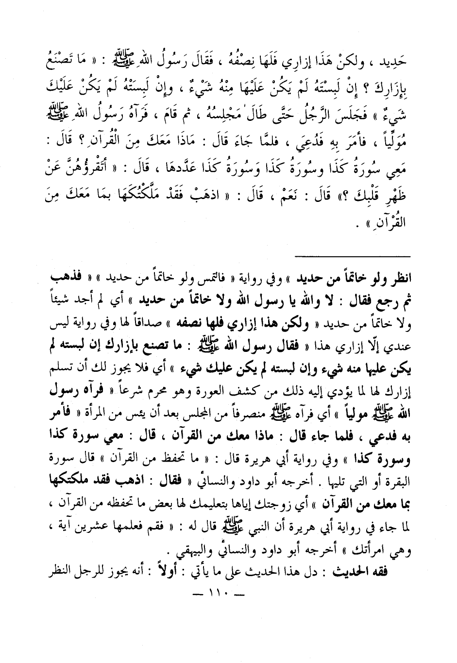 انظر ولو خاتماً من حديد" وفي رواية " فالتمس ولو خاتماً من حديد " " فذهب ثم رجع فقال: لا والله يا رسول الله ولا خاتماً من حديد " أي لم أجد شيئاً ولا خاتماً من حديد " ولكن هذا إزاري فلها نصفه " صداقاً لها وفي رواية ليس عندي إلاّ إزاري هذا " فقال رسول الله - صلى الله عليه وسلم -: ما تصنع بإزارك إن لبسته لم يكن عليها منه شيء وإن لبسته لم يكن عليك شيء " أي فلا يجوز لك أن تسلم إزارك لها لما يؤدي إليه ذلك من كشف العورة وهو محرم شرعاً " فرآه رسول الله - صلى الله عليه وسلم - مولياً " أي فرآه - صلى الله عليه وسلم - منصرفاً من المجلس بعد أن يئس من المرأة " فأمر به فدعي، فلما جاء قال: ماذا معك من القرآن، قال: معي سورة كذا وسورة كذا " وفي رواية أبي هريرة قال: " ما تحفظ من القرآن " قال سورة البقرة أو التي تليها. أخرجه أبو داود والنسائي " فقال: اذهب فقد ملكتكها بما معك من القرآن " أي زوجتك إياها بتعليمك لها بعض ما تحفظه من القرآن، لما جاء في رواية أبي هريرة أن النبي - صلى الله عليه وسلم - قال له: " فقم فعلمها عشرين آية، وهي امرأتك " أخرجه أبو داود والنسائي والبيهقي.