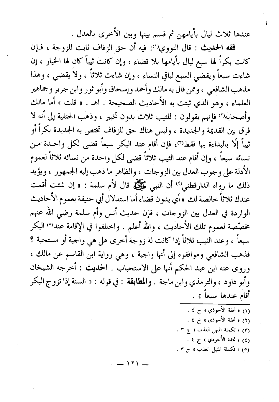 فقه الحديث: قال النووي (¬1): فيه أن حق الزفاف ثابت للزوجة، فإن كانت بكراً لها سبع ليال بأيامها بلا قضاء، وإن كانت ثيباً كان لها الخيار، إن شاءت سبعاً ويقضي السبع لباقي النساء، وإن شاءت ثلاثاً، ولا يقضي، وهذا مذهب الشافعي، وممن قال به مالك وأحمد وإسحاق وأبو ثور وابن جرير وجماهير العلماء، وهو الذي ثبتت به الأحاديث الصحيحة. اهـ. " قلت " أما مالك وأصحابه (¬2) فإنهم يقولون: للثيب ثلاث بدون تخيير، وذهب الحنفية إلى أنه لا فرق بين القديمة والجديدة، وليس هناك حق للزفاف تختص به الجديدة بكراً أو ثيباً إلاّ بالبداءة بها فقط (¬3)، فإن أقام عند البكر سبعاً قضى لكل واحدة من نسائه سبعاً، وإن أقام عند الثيب ثلاثاً قضى لكل واحدة من نسائه ثلاثاً لعموم الأدلة على وجوب العدل بين الزوجات، والظاهر ما ذهب إليه الجمهور، ويؤيد ذلك ما رواه الدارقطني (¬4) أن النبي - صلى الله عليه وسلم - قال لأم سلمة: " إن شئت أقمت عندك ثلاثاً خالصة لك " أي بدون قضاء أما استدلال أبي حنيفة بعموم الأحاديث الواردة في العدل بين الزوجات، فإن حديث أنس وأم سلمة رضي الله عنهم مخصّصة لعموم تلك الأحاديث، والله أعلم. واختلفوا في الإقامة عند (¬5) البكر سبعاً، وعند الثيب ثلاثاً إذا كانت له زوجة أخرى هل هي واجبة أو مستحبة؟ فذهب الشافعي وموافقوه إلى أنها واجبة، وهي رواية ابن القاسم عن مالك، وروى عنه ابن عبد الحكم أنها على الاستحباب. الحديث: أخرجه الشيخان وأبو داود، والترمذي وابن ماجة. والمطابقة: في قوله: " السنة إذا تزوج البكر أقام عندها سبعاً ".