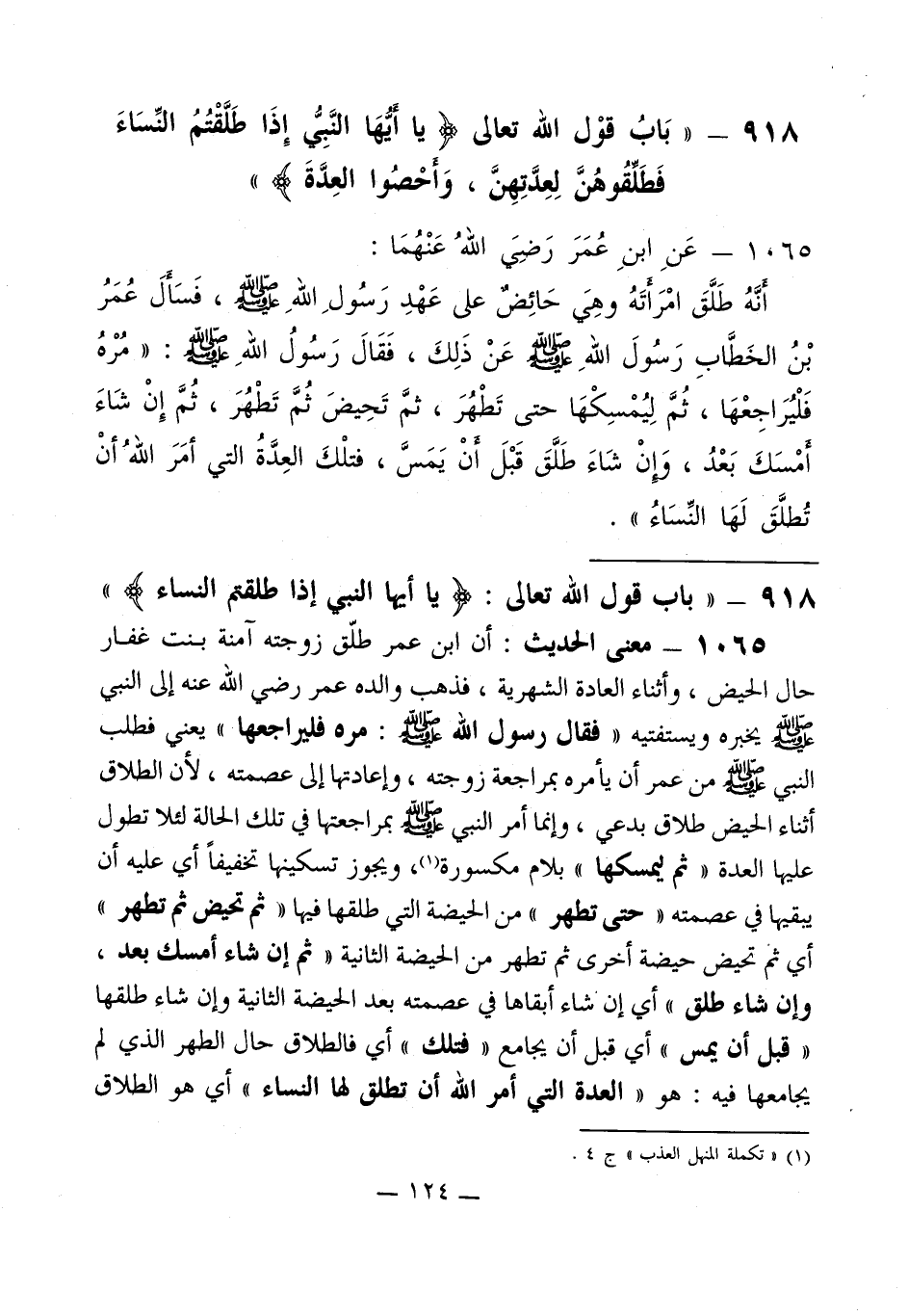 918 - " بَابُ قوْل الله تعالى (يَا أَيُّهَا النَّبِيُّ إِذَا طَلَّقْتُمُ النِّسَاءَ فَطَلِّقُوهُنَّ لِعِدَّتِهِنَّ وَأَحْصُوا الْعِدَّةَ) "