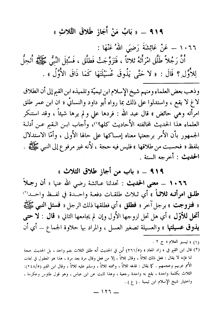 وذهب بعض العلماء ومنهم شيخ الإِسلام ابن تيميّة وتلميذه ابن القيم إلى أن الطلاق لاغ لا يقع، واستدلوا على ذلك بما رواه أبو داود والنسائي " أن ابن عمر طلق امرأته وهي حائض " قال عبد الله: فردها علي ولم يرها شيئاً، وقد استنكر العلماء هذا الحديث لمخالفته الأحاديث كلها (¬1)، وأجاب ابن القيم عن أدلة الجمهور بأن الأمر برجعتها معناه إمساكها على حالها الأولى، وأمّا الاستدلال بلفظ " فحسبت من طلاقها " فليس فيه حجة، لأنه غير مرفوع إلى النبي - صلى الله عليه وسلم - الحديث: أخرجه الستة.
