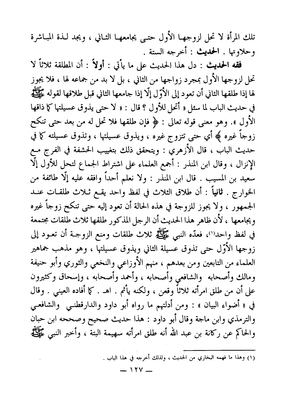فقه الحديث: دل هذا الحديث على ما يأتي: أولاً: أن المطلقة ثلاثاً لا تحل لزوجها الأول بمجرد زواجها من الثاني، بل لا بد من جماعه لها، فلا يجوز لها إذا طلقها الثاني أن تعود إلى الأوّل إلاّ إذا جامعها الثاني قبل طلاقها لقوله - صلى الله عليه وسلم - في حديث الباب لما سئل " أتحل للأول؟ قال: " لا حتى يذوق عسيلتها كما ذاقها الأول ". وهو معنى قوله تعالى: (فَإِنْ طَلَّقَهَا فَلَا تَحِلُّ لَهُ مِنْ بَعْدُ حَتَّى تَنْكِحَ زَوْجًا غَيْرَهُ) أي حتى تتزوج غيره، ويذوق عسيلتها، وتذوق عسيلته كما في حديث الباب، قال الأزهري: ويتحقق ذلك بتغييب الحشفة في الفرج مع الإِنزال، وقال ابن المنذر: أجمع العلماء على اشتراط الجماع لتحل للأول إلّا سعيد بن المسيب. قال ابن المنذر: ولا نعلم أحداً وافقه عليه إلاّ طائفة من الخوارج. ثانياًً: أن طلاق الثلاث في لفظ واحد يقع ثلاث طلقات عند الجمهور، ولا يجوز للزوجة في هذه الحالة أن تعود إليه حتى تنكح زوجاً غيره ويجامعها، لأن ظاهر هذا الحديث أن الرجل المذكور طلقها ثلاث طلقات مجتمعة في لفظ واحد (¬1)، فعدّه النبي - صلى الله عليه وسلم - ثلاث طلقات ومنع الزوجة أن تعود إلى زوجها الأوّل حتى تذوق عسيلة الثاني ويذوق عسيلتها، وهو مذهب جماهير العلماء من التابعين ومن بعدهم، منهم الأوزاعي والنخعي والثوري وأبو حنيفة ومالك وأصحابه والشافعي وأصحابه، وأحمد وأصحابه، وإسحاق وكثيرون على أن من طلق امرأته ثلاثاً وقعن، ولكنه يأثم. اهـ. كما أفاده العيني. وقال في " أضواء البيان ": ومن أدلتهم ما رواه أبو داود والدارقطني والشافعي والترمذي وابن ماجة وقال أبو داود: هذا حديث صحيح وصححه ابن حبان والحاكم عن ركانة بن عبد الله أنه طلق امرأته سهيمة البتة، وأخبر النبي - صلى الله عليه وسلم -