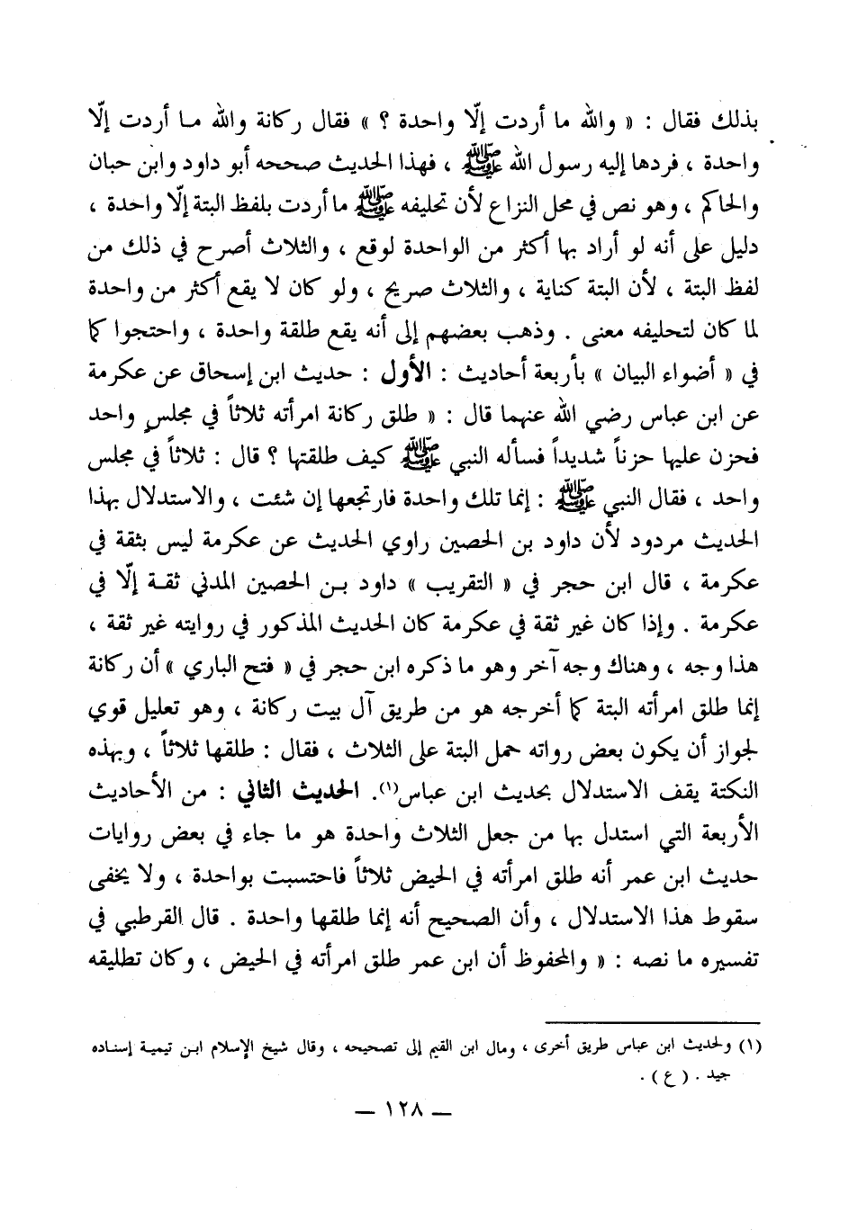 بذلك فقال: " والله ما أردت إلاّ واحدة؟ " فقال ركانة والله ما أردت إلّا واحدة، فردها إليه رسول الله - صلى الله عليه وسلم -، فهذا الحديث صححه أبو داود وابن حبان والحاكم، وهو نص في محل النزاع لأن تحليفه - صلى الله عليه وسلم - ما أردت بلفظ البتة إلاّ واحدة، دليل على أنه لو أراد بها أكثر من الواحدة لوقع، والثلاث أصرح في ذلك من لفظ البتة، لأن البتة كناية، والثلاث صريح، ولو كان لا يقع أكثر من واحدة لما كان لتحليفه معنى. وذهب بعضهم إلى أنه يقع طلقة واحدة، واحتجوا كما في " أضواء البيان " بأربعة أحاديث: الأول: حديث ابن إسحاق عن عكرمة عن ابن عباس رضي الله عنهما قال: " طلق ركانة امرأته ثلاثاً في مجلسٍ واحد فحزن عليها حزناً شديداً فسأله النبي - صلى الله عليه وسلم - كيف طلقتها؟ قال: ثلاثاً في مجلس واحد، فقال النبي - صلى الله عليه وسلم -: إنما تلك واحدة فارتجعها إن شئت، والاستدلال بهذا الحديث مردود لأن داود بن الحصين راوى الحديث عن عكرمة ليس بثقة في عكرمة، قال ابن حجر في " التقريب " داود بن الحصين المدني ثقة إلاّ في عكرمة. وإذا كان غير ثقة في عكرمة كان الحديث المذكور في روايته غير ثقة، هذا وجه، وهناك وجه آخر وهو ما ذكره ابن حجر في " فتح الباري " أن ركانة إنما طلق امرأته البتة كما أخرجه هو من طريق آل بيت ركانة، وهو تعليل قوي لجواز أن يكون بعض رواته حمل البتة على الثلاث، فقال: طلقها ثلاثاً، وبهذه النكتة يقف الاستدلال بحديث ابن عباس (¬1). الحديث الثاني: من الأحاديث الأربعة التي استدل بها من جعل الثلاث واحدة هو ما جاء في بعض روايات حديث ابن عمر أنه طلق امرأته في الحيض ثلاثاً فاحتسبت بواحدة، ولا يخفى سقوط هذا الاستدلال، وأن الصحيح أنه إنما طلقها واحدة. قال القرطبي في تفسيره ما نصه: "والمحفوظ أن ابن عمر طلق امرأته في الحيض، وكان تطليقه