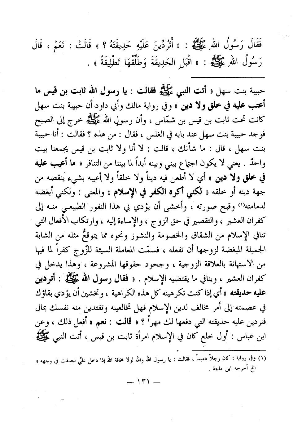 حبيبة بنت في سهل " أتت النبي - صلى الله عليه وسلم - فقالت: يا رسول الله ثابت بن قيس ما أعتب عليه في خلق ولا دين " وفي رواية مالك وأبي داود أن حبيبة بنت سهل كانت تحت ثابت بن قيس بن شمّاس، وأن رسول الله - صلى الله عليه وسلم - خرج إلى الصبح فوجد حبيبة بنت سهل عند بابه في الغلس، فقال: من هذه؟ فقالت: أنا حبيبة بنت سهل، قال: ما شأنك، قالت: لا أنا ولا ثابت بن قيس يجمعنا بيت واحدٌ. يعني لا يكون اجتماع بيني وبينه أبداً لما بيننا من التنافر "ما أعيب عليه في خلق ولا دين " أي لا أطعن فيه ديناً ولا خلقاً ولا أعيبه بشيء ينقصه من جهة دينه أو خلقه " لكني أكره الكفر في الإِسلام " والمعنى: ولكني أبغضه لدمامته (¬1) وقبح صورته، وأخشى أن يؤدي بي هذا النفور الطبيعي منه إلى كفران العشير، والتقصير في حق الزوج، والإساءة إليه، وارتكاب الأفعال التي تنافي الإِسلام من الشقاق والخصومة والنشوز ونحوه مما يتوقعُّ مثله من الشابة الجميلة المبغضة لزوجها أن تفعله، فسمّت المعاملة السيئة للزّوج كفراً لما فيها من الاستهانة بالعلاقة الزوجية، وجحود حقوقها المشروعة، وهذا يدخل في كفران العشير، وينافي ما يقتضيه الإِسلام. " فقال رسول الله - صلى الله عليه وسلم -: أتردين عليه حديقته " أي إذا كنت تكرهينه كل هذه الكراهية، وتخشين أن يؤدي بقاؤك في عصمته إلى أمر مخالف لدين الإِسلام فهل تخالعينه وتفتدين منه نفسك بمال فتردين عليه حديقته التي دفعها لك مهراً؟ " قالت: نعم " أفعل ذلك، وعن ابن عباس: أول خلع كان في الإِسلام امرأة ثابت بن قيس، أتت النبي - صلى الله عليه وسلم -