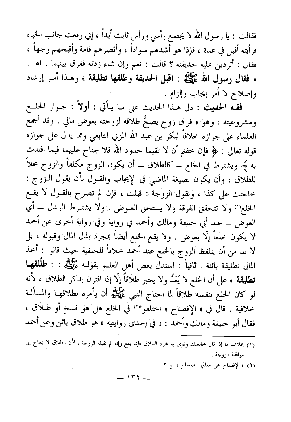 فقه الحديث: دل هذا الحديث على ما يأتي: أولاً: جواز الخلع ومشروعيته، وهو " فراق زوج يصحُّ طلاقه لزوجته بعوض مالي. وقد أجمع العلماء على جوازه خلافاً لبكر بن عبد الله المزني التابعي ومما يدل على جوازه قوله تعالى: (فَإِنْ خِفْتُمْ أَلَّا يُقِيمَا حُدُودَ اللَّهِ فَلَا جُنَاحَ عَلَيْهِمَا فِيمَا افْتَدَتْ) ويشترط في الخلع -كالطلاق- أن يكون الزوج مكلفاً والزوج محلاً للطلاق، وأن يكون بصيغة الماضي في الإِيجاب والقبول بأن يقول الزوج: خالعتك على كذا، وتقول الزوجة: قبلت، فإن لم تصرح بالقبول لا يقع الخلع (¬1) ولا تتحقق الفرقة ولا يستحق العوض. ولا يشترط البدل -أي العوض- عند أبي حنيفة ومالك وأحمد في رواية وفي رواية أخرى عن أحمد لا يكون خلعاً إلاّ بعوض. ولا يقع الخلع أيضاً بمجرد بذل المال وقبوله، بل لا بد من أن يتلفظ الزوج بالخلع عند أحمد خلافاً للحنفية حيث قالوا: أخذ المال تطليقة بائنة. ثانياًً: استدل بعض أهل العلم بقوله - صلى الله عليه وسلم -: " طلِّقها تطليقة " على أن الخلع لا يُعَدُّ ولا يعتبر طلاقاً إلاّ إذا اقترن بذكر الطلاق، لأنه لو كان الخلع بنفسه طلاقاً لما احتاج النبي - صلى الله عليه وسلم - أن يأمره بطلاقها والمسألة خلافية. قال في " الإِفصاح " اختلفوا (¬2) في الخلع هل هو فسخ أو طلاق، فقال أبو حنيفة ومالك وأحمد: " في إحدى روايتيه " هو طلاق بائن وعن أحمد