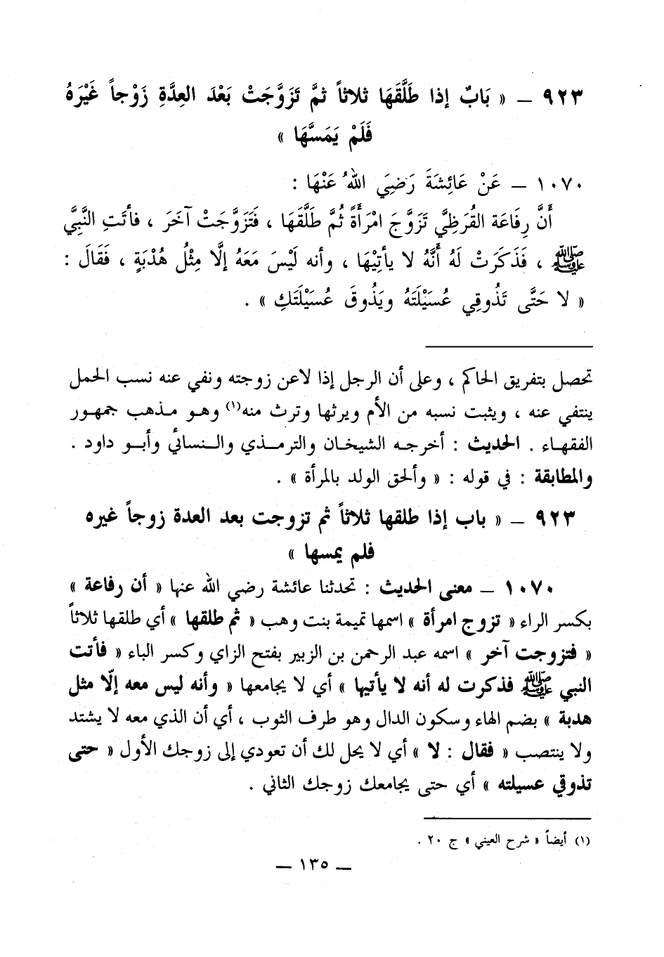 923 - " بَابٌ إذا طَلَّقَهَا ثلاثاً ثمَّ تزَوَّجَتْ بَعْدَ العِدَّةِ زَوْجاً غَيْرَهُ فَلَمْ يَمَسَّهَا "