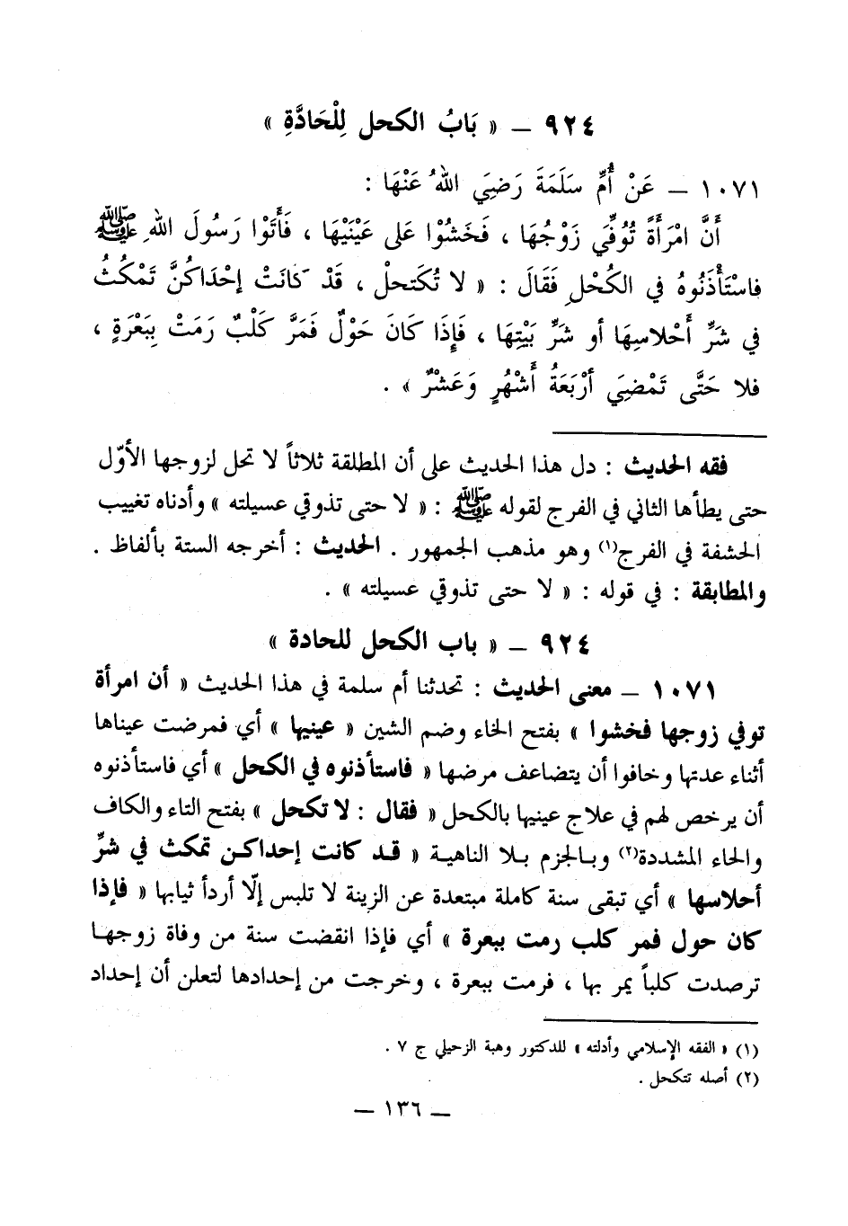 1071 - معنى الحديث: تحدثنا أم سلمة في هذا الحديث " أن امرأة توفي زوجها فخشوا " بفتح الخاء وضم الشين " عينيها " أي فمرضت عيناها أثناء عدتها وخافوا أن يتضاعف مرضها " فأستأذنوه في الكحل " أي فاستأذنوه أن يرخص لهم في علاج عينيها بالكحل " فقال: لا تكحل " بفتح التاء والكاف والحاء المشددة (¬2) وبالجزم بلا الناهية " قد كانت إحداكن تمكث في شرِّ أحلاسها " أي تبقى سنة كاملة مبتعدة عن الزينة لا تلبس إلاّ أردأ ثيابها " فإذا كان حول فمر كلب رمت ببعرة " أي فإذا انقضت سنة من وفاة زوجها ترصدت كلباً يمر بها، فرمت ببعرة، وخرجت من إحدادها لتعلن أن إحداد