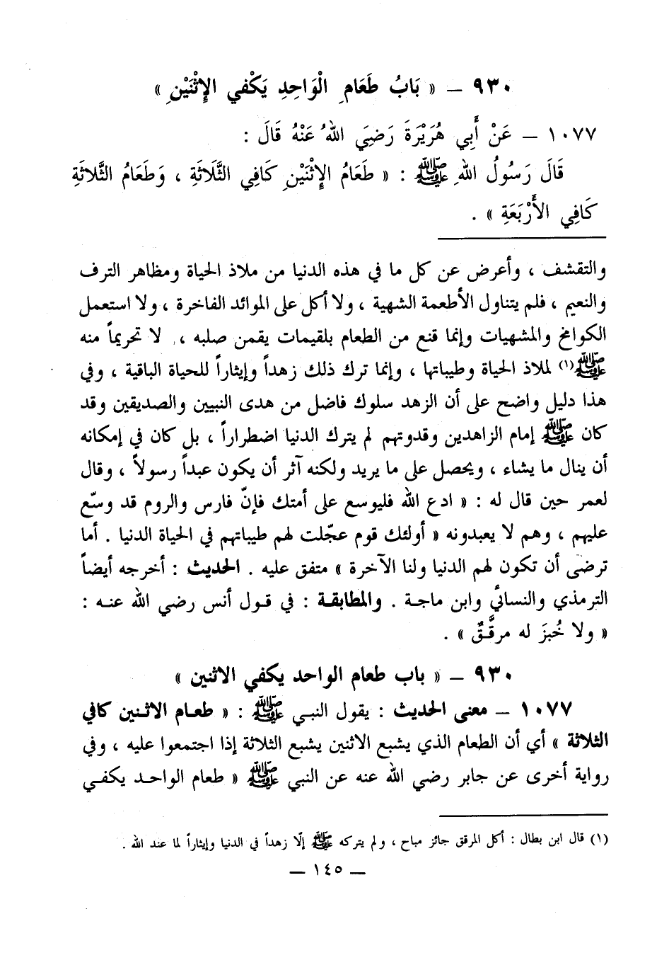 930 - " بَابُ طَعَامِ الْوَاحِدِ يَكْفي الإِْثنَيْنِ "