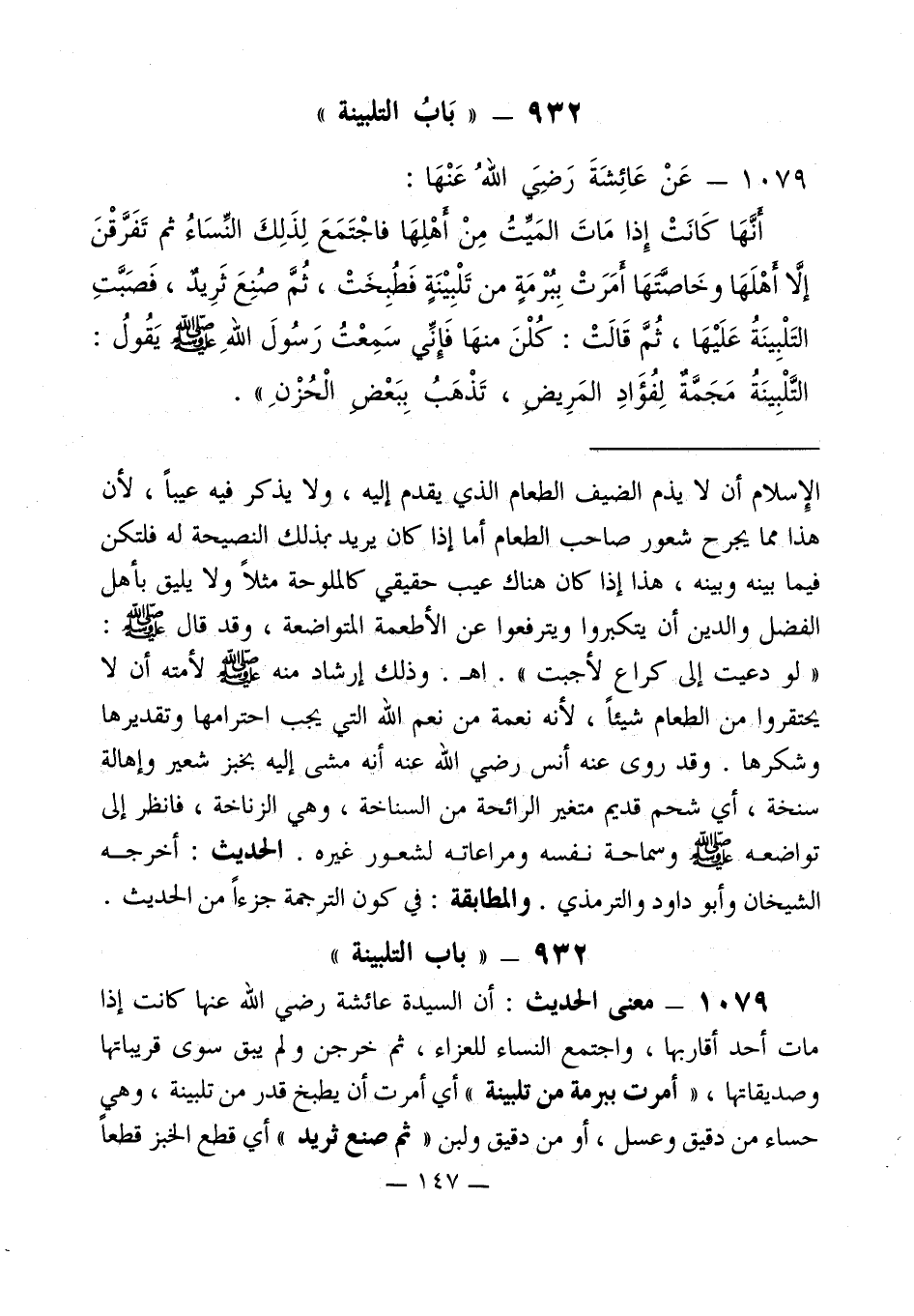 1079 - معنى الحديث: أن السيدة عائشة رضي الله عنها كانت إذا مات أحد أقاربها، واجتمع النساء للعزاء، ثم خرجن ولم يبق سوى قريباتها وصديقاتها، " أمرت ببرمة من تلبينة " أي أمرت أن يطبخ قدر من تلبينة، وهي حساء من دقيق وعسل، أو من دقيق ولبن " ثم صنع ثريد " أي قطع الخبز قطعاً