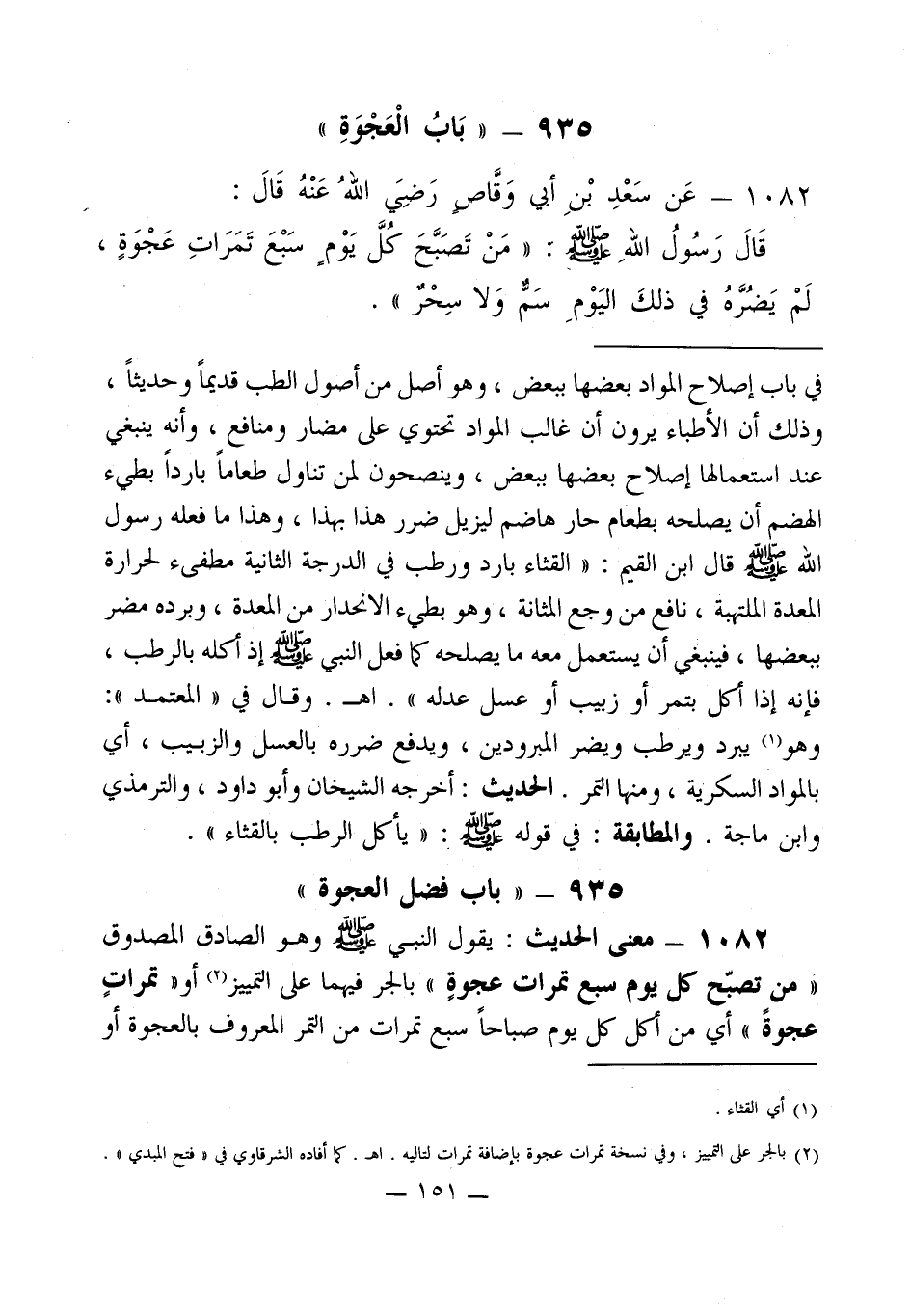 1082 - معنى الحديث: يقول النبي - صلى الله عليه وسلم - وهو الصادق المصدوق " من تصبّح كل يوم سبع تمرات عجوةٍ " بالجر فيهما على التمييز (¬2) أو " تمراتٍ عجوةً " أي من أكل كل يوم صباحاً سبع تمرات من التمر المعروف بالعجوة أو