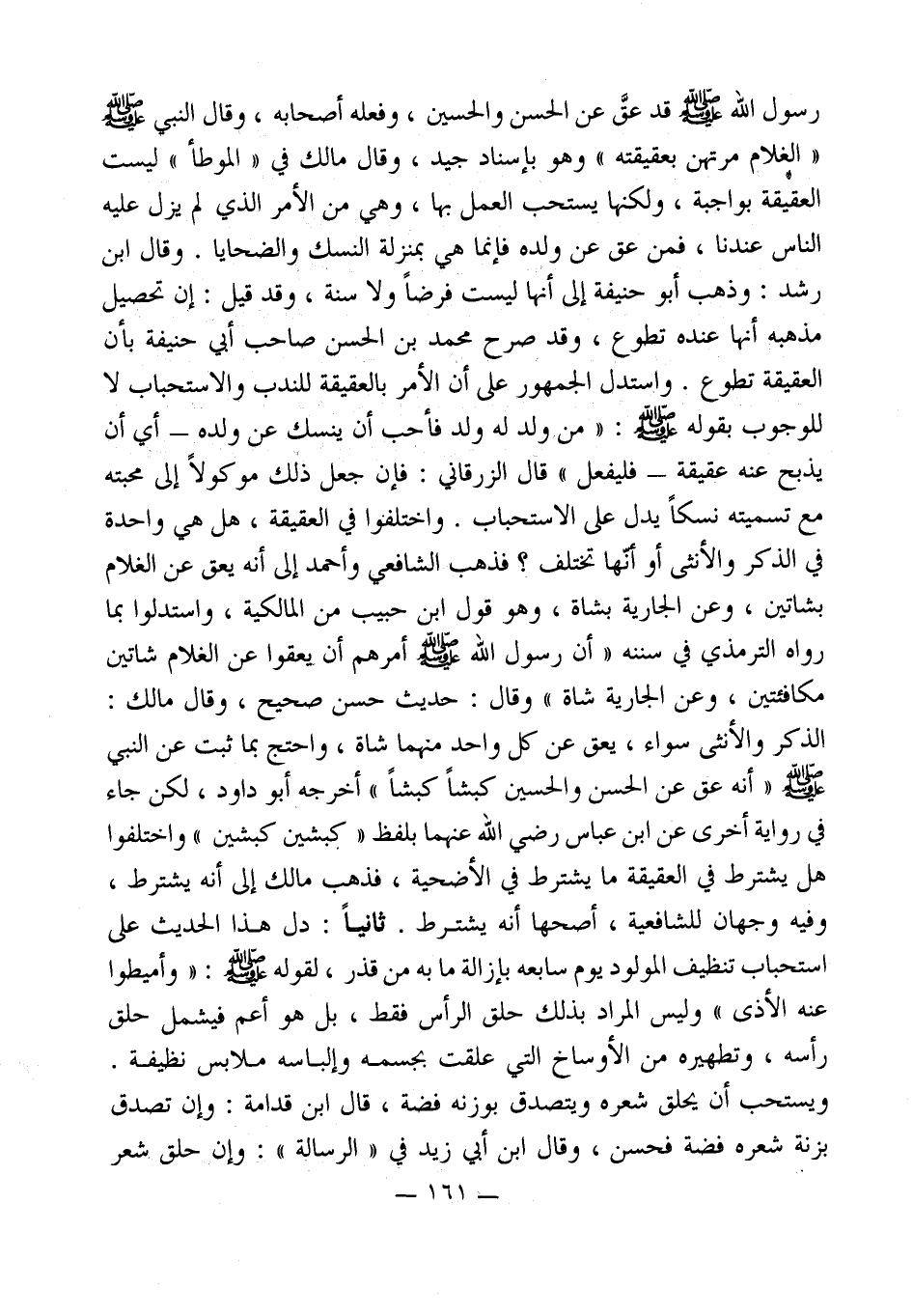 رسول الله - صلى الله عليه وسلم - قد عقَّ عن الحسن والحسين، وفعله أصحابه، وقال النبي - صلى الله عليه وسلم - " الغلام مرتهن بعقيقته " وهو بإسناد جيد، وقال مالك في " الموطأ " ليست العقيقة بواجبة، ولكنها يستحب العمل بها، وهي من الأمر الذي لم يزل عليه الناس عندنا، فمن عق عن ولده فإنما هي بمنزلة النسك والضحايا. وقال ابن رشد: وذهب أبو حنيفة إلى أنها ليست فرضاً ولا سنة، وقد قيل: إن تحصيل مذهبه أنها عنده تطوع، وقد صرح محمد بن الحسن صاحب أبي حنيفة بأن العقيقة تطوع. واستدل الجمهور على أن الأمر بالعقيقة للندب والاستحباب لا للوجوب بقوله - صلى الله عليه وسلم -: " من ولد له ولد فأحب أن ينسك عن ولده -أي أن يذبح عنه عقيقة- فليفعل " قال الزرقاني: فإن جعل ذلك موكولاً إلى محبته مع تسميته نسكاً يدل على الاستحباب. واختلقوا في العقيقة، هل هي واحدة في الذكر والأنثى أو أنّها تختلف؟ فذهب الشافعي وأحمد إلى أنه يعق عن الغلام بشاتين، وعن الجارية بشاة، وهو قول ابن حبيب من المالكية، واستدلوا بما رواه الترمذي في سننه " أن رسول الله - صلى الله عليه وسلم - أمرهم أن يعقوا عن الغلام شاتين مكافئتين، وعن الجارية شاة " وقال: حديث حسن صحيح، وقال مالك: الذكر والأنثى سواء، يعق عن كل واحد منهما شاة، واحتج بما ثبت عن النبي - صلى الله عليه وسلم - " أنه عق عن الحسن والحسين كبشاً كبشاً " أخرجه أبو داود، لكن جاء في رواية أخرى عن ابن عباس رضي الله عنهما بلفظ " كبشين كبشين " واختلفوا هل يشترط في العقيقة ما يشترط في الأضحية، فذهب مالك إلى أنه يشترط، وفيه وجهان للشافعية، أصحها أنه يشترط. ثانياً: دل هذا الحديث على استحباب تنظيف المولود يوم سابعه بإزالة ما به من قذر، لقوله - صلى الله عليه وسلم -: " وأميطوا عنه الأذى " وليس المراد بذلك حلق الرأس فقط، بل هو أعم فيشمل حلق رأسه، وتطهيره من الأوساخ التي علقت بجسمه وإلباسه ملابس نظيفة. ويستحب أن يحلق شعره ويتصدق بوزنه فضة، قال ابن قدامة: وإن تصدق بزنة شعره فضة فحسن، وقال ابن أبي زيد في " الرسالة ": وإن حلق شعر