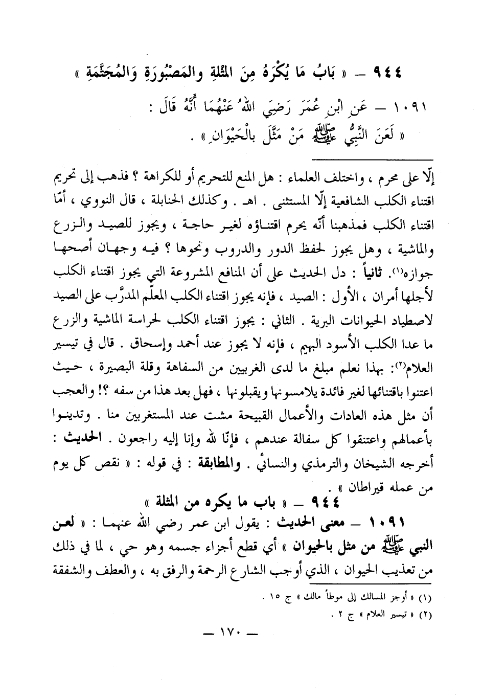 1091 - معنى الحديث: يقول ابن عمر رضي الله عنهما: " لعن النبي - صلى الله عليه وسلم - من مثل بالحيوان " أي قطع أجزاء جسمه وهو حي، لما في ذلك من تعذيب الحيوان، الذي أوجب الشارع الرحمة والرفق به، والعطف والشفقة