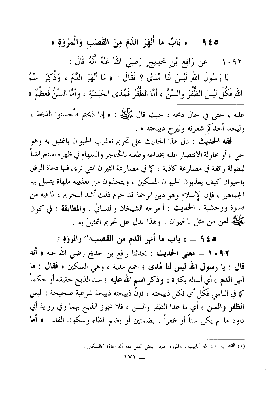 945 - " بَابُ ما أنهَرَ الدَّمَ مِنَ القَصَبِ وَالْمَرْوَةِ "
