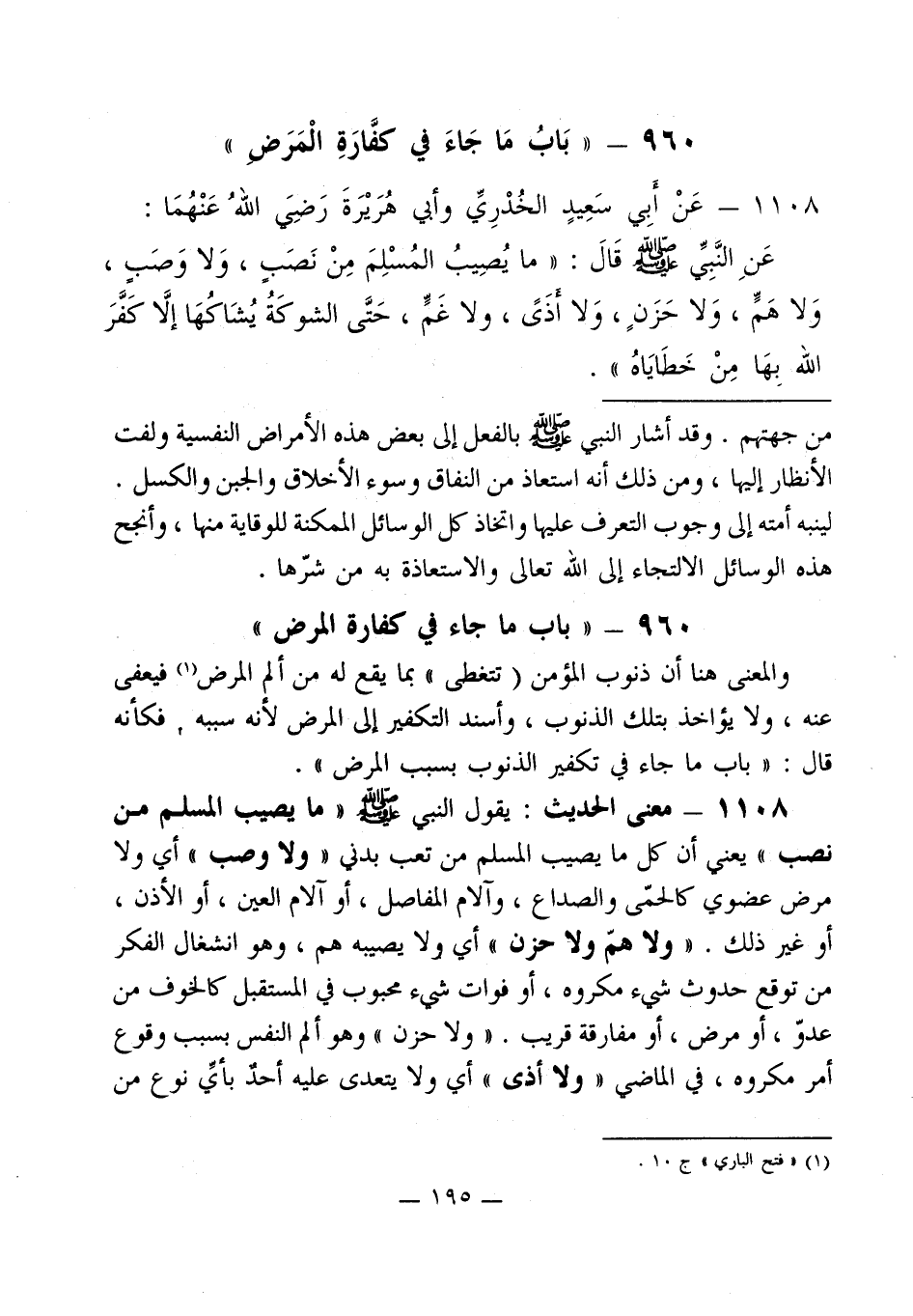 1108 - عَنْ أَبِي سَعِيدٍ الخُدْرِيِّ وأبي هُرَيْرَةَ رَضِيَ اللهُ عَنْهُمَا: عَنِ النَّبِيِّ - صلى الله عليه وسلم - قَالَ: " ما يُصِيبُ المُسْلِمَ مِنْ نَصَبٍ، وَلا وَصَبٍ، وَلا هَمٍّ، وَلا حَزَنٍ، وَلا أذىً، ولا غَمٍّ، حَتَّى الشوكَةُ يُشَاكُهَا إلَّا كَفَّرَ الله بِهَا مِنْ خَطايَاهُ ".