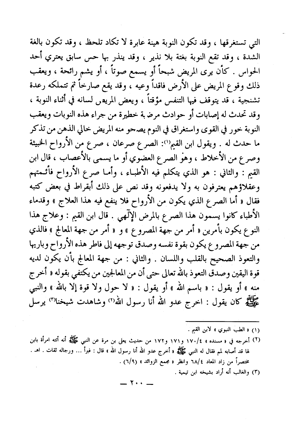 التي تستغرقها، وقد تكون النوبة هينة عابرة لا تكاد تلحظ، وقد تكون بالغة الشدة، وقد تقع النوبة بغتة بلا نذير، وقد ينذر بها حس سابق يعتري أحد الحواس. كأن يرى المريض شبحاً أو يسمع صوتاً، أو يشم رائحة، ويعقب ذلك وقوع المريض على الأرض فاقداً وعيه، وقد يقع صارخاً ثم تتملكه رعدة تشنجية، قد يتوقف فيها التنفس مؤقتاً، ويعض المريض لسانه في أثناء النوبة، وقد تحدث له إصابات أو حوادث مرضية خطيرة من جراء هذه النوبات ويعقب النوبة خور في القوى واستغراق في النوم يصحو منه المريض خالي الذهن من تذكر ما حدث له. ويقول ابن القيم (¬1): الصرع صرعان، صرع من الأرواح الخبيثة وصرع من الأخلاط، وهو الصرع العضوي أو ما يسمى بالأعصاب، قال ابن القيم: والثاني: هو الذي يتكلم فيه الأطباء، وأما صرع الأرواح فأئمتهم وعقلاؤهم يعترفون به ولا يدفعونه وقد نص على ذلك أبقراط في بعض كتبه فقال " أما الصرع الذي يكون من الأرواح فلا ينفع فيه هذا العلاج " وقدماء الأطباء كانوا يسمون هذا الصرع بالمرض الإلهي. قال ابن القيم: وعلاج هذا النوع يكون بأمرين " أمر من جهة المصروع " و" أمر من جهة المعالج " فالذي من جهة المصروع يكون بقوة نفسه وصدق توجهه إلى فاطر هذه الأرواح وباريها والتعوذ الصحيح بالقلب واللسان. والثاني: من جهة المعالج بأن يكون لديه قوة اليقين وصدق التعوذ بالله تعالى حتى أن من المعالجين من يكتفي بقوله " أخرج منه " أو يقول: " باسم الله " أو يقول: " لا حول ولا قوة إلا بالله " والنبي - صلى الله عليه وسلم - كان يقول: اخرج عدو الله أنا رسول الله (¬2) وشاهدت شيخنا (¬3) يرسل