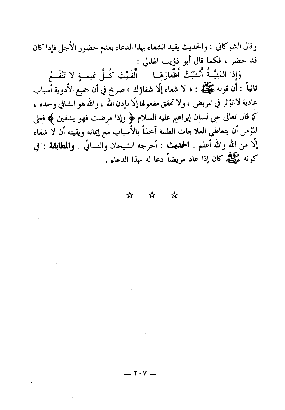 ثانياً: أن قوله - صلى الله عليه وسلم -: " لا شفاء إلاّ شفاؤك " صريح في أن جميع الأدوية أسباب عادية لا تؤثر في المريض، ولا تحقق مفعولها إلاّ بإذن الله، والله هو الشافي وحده، كما قال تعالى على لسان إبراهيم عليه السلام (وَإِذَا مَرِضْتُ فَهُوَ يَشْفِينِ) فعلى المؤمن أن يتعاطى العلاجات الطبية آخذاً بالأسباب مع إيمانه ويقينه أن لا شفاء إلّا من الله والله أعلم. الحديث: أخرجه الشيخان والنسائي. والمطابقة: في كونه - صلى الله عليه وسلم - كان إذا عاد مريضاً دعا له بهذا الدعاء.