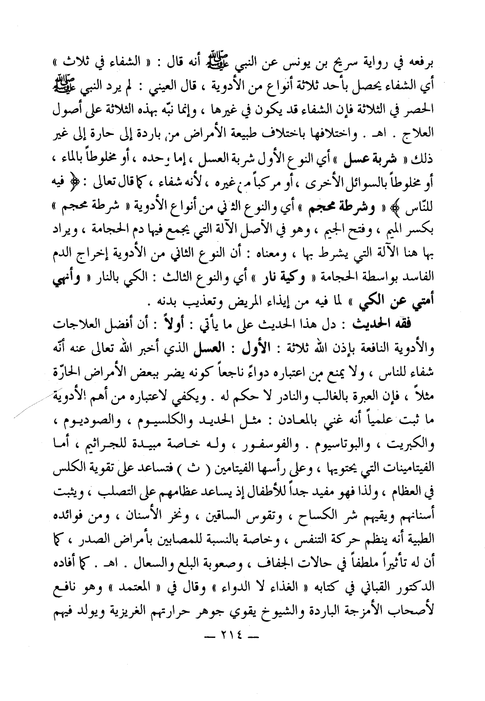 فقه الحديث: دل هذا الحديث على ما يأتي: أولاً: أن أفضل العلاجات والأدوية النافعة بإذن الله ثلاثة: الأول: العسل الذي أخبر الله تعالى عنه أنّه شفاء للناس، ولا يمنع بن اعتباره دواءً ناجحاً كونه يضر ببعض الأمراض الحارّة مثلاً، فإن العبرة بالغالب والنادر لا حكم له. ويكفي لاعتباره من أهم الأدوية ما ثبت علمياً أنه غني بالمعادن: مثل الحديد والكلسيوم، والصوديوم، والكبريت، والبوتاسيوم. والفوسفور، وله خاصية مبيدة للجراثيم، أما الفيتامينات التي يحتويها، وعلى رأسها الفيتامين (ث) فتساعد على تقوية الكلس في العظام، ولذا فهو مفيد جداً للأطفال إذ يساعد عظامهم على التصلب، ويثبت أسنانهم ويقيهم شر الكساح، وتقوس الساقين، ونخر الأسنان، ومن فوائده الطبية أنه ينظم حركة التنفس، وخاصة بالنسبة للمصابين بأمراض الصدر، كما أن له تأثيراً ملطفاً في حالات الجفاف، وصعوبة البلع والسعال. اهـ. كما أفاده الدكتور القباني في كتابه " الغذاء لا الدواء " وقال في " المعتمد " وهو نافع لأصحاب الأمزجة الباردة والشيوخ يقوي جوهر حرارتهم الغريزية ويولد فيهم