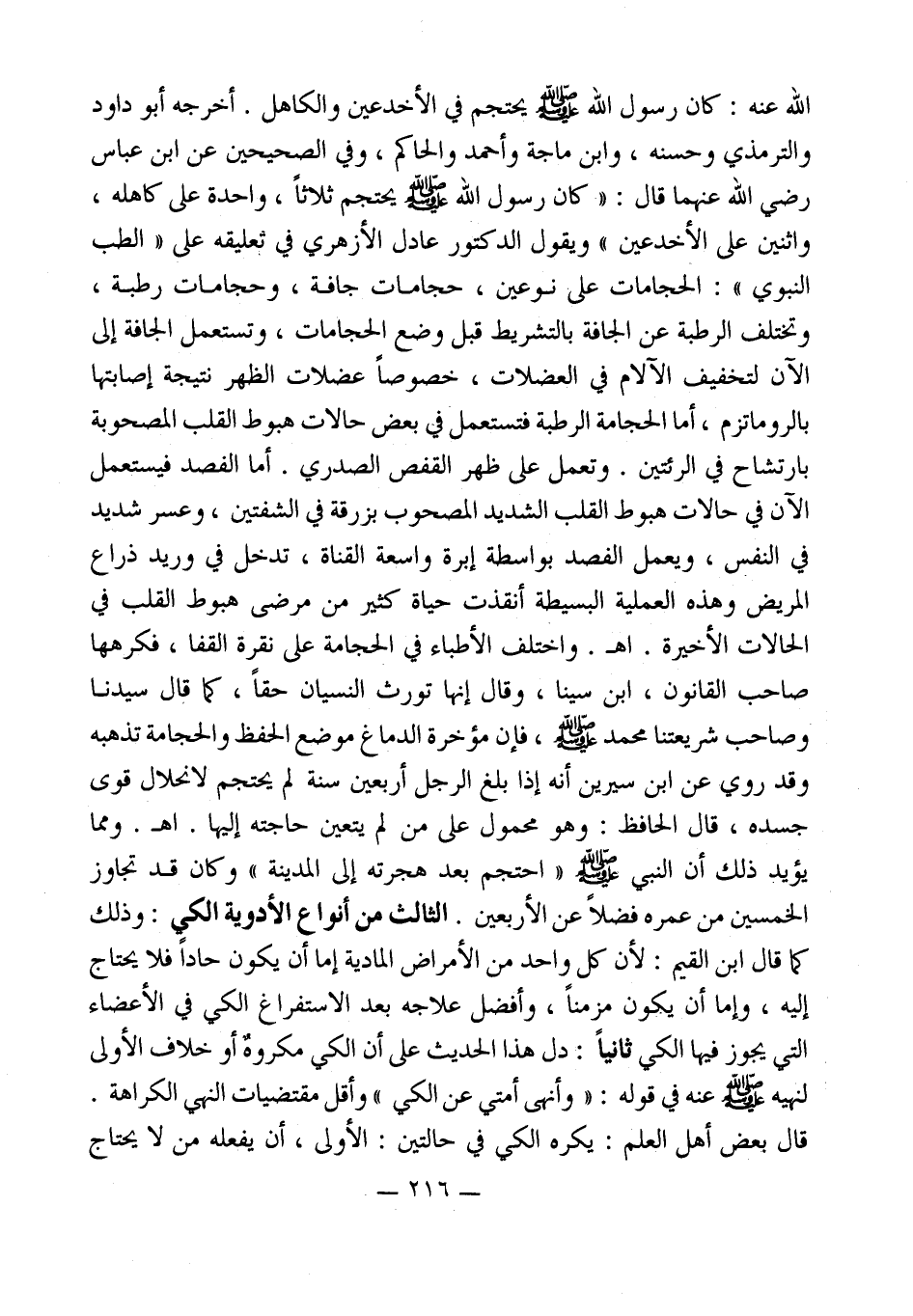 الله عنه: كان رسول الله - صلى الله عليه وسلم - يحتجم في الأخدعين والكاهل. أخرجه أبو داود والترمذي وحسنه، وابن ماجة وأحمد والحاكم، وفي الصحيحين عن ابن عباس رضي الله عنهما قال: " كان رسول الله - صلى الله عليه وسلم - يحتجم ثلاثاً، واحدة على كاهله، واثنين على الأخدعين " ويقول الدكتور عادل الأزهرى في تعليقه على " الطب النبوي ": الحجامات على نوعين، حجامات جافة، وحجامات رطبة، وتختلف الرطبة عن الجافة بالتشريط قبل وضع الحجامات، وتستعمل الجافة إلى الآن لتخفيف الآلام في العضلات، خصوصاً عضلات الظهر نتيجة إصابتها بالروماتزم، أما الحجامة الرطبة فتستعمل في بعض حالات هبوط القلب المصحوبة بارتشاح في الرئتين. وتعمل على ظهر القفص الصدري. أما الفصد فيستعمل الآن في حالات هبوط القلب الشديد المصحوب بزرقة في الشفتين، وعسر شديد في النفس، ويعمل الفصد بواسطة إبرة واسعة القناة، تدخل في وريد ذراع المريض وهذه العملية البسيطة أنقذت حياة كثير من مرضى هبوط القلب في الحالات الأخيرة. اهـ. واختلف الأطباء في الحجامة على نقرة القفا، فكرهها صاحب القانون، ابن سينا، وقال إنها تورث النسيان حقاً، كما قال سيدنا وصاحب شريعتنا محمد - صلى الله عليه وسلم -، فإن مؤخرة الدماغ موضع الحفظ والحجامة تذهبه وقد روى عن ابن سيرين أنه إذا بلغ الرجل أربعين سنة لم يحتجم لانحلال قوى جسده، قال الحافظ: وهو محمول على من لم يتعين حاجته إليها. اهـ. ومما يؤيد ذلك أن النبي - صلى الله عليه وسلم - " احتجم بعد هجرته إلى المدينة " وكان قد تجاوز الخمسين من عمره فضلاً عن الأربعين. الثالث من أنواع الأدوية الكي: وذلك كما قال ابن القيم: لأن كل واحد من الأمراض المادية إما أن يكون حاداً فلا يحتاج إليه، وإما أن يكون مزمناً، وأفضل علاجه بعد الاستفراغ الكي في الأعضاء التي يجوز فيها الكي ثانياًً: دل هذا الحديث على أن الكي مكروهٌ أو خلاف الأولى لنهيه - صلى الله عليه وسلم - عنه في قوله: " وأنهى أمتي عن الكي " وأقل مقتضيات النهي الكراهة.