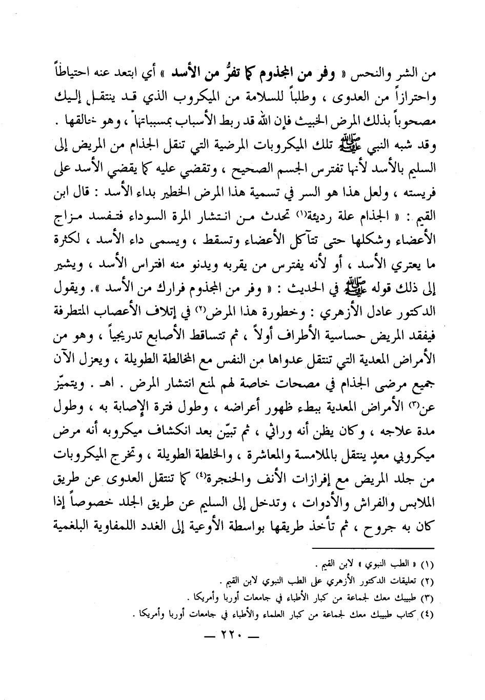 من الشر والنحس " وفر من المجذوم كما تفرُّ من الأسد " أي ابتعد عنه احتياطاً واحترازاً من العدوى، وطلباً للسلامة من الميكروب الذي قد ينتقل، إليك مصحوباً بذلك المرض الخبيث فإن الله قد ربط الأسباب بمسبباتها، وهو خالقها. وقد شبه النبي - صلى الله عليه وسلم - تلك الميكروبات المرضية التي تنقل الجذام من المريض إلى السليم بالأسد لأنها تفترس الجسم الصحيح، وتقضي عليه كما يقضي الأسد على فريسته، ولعل هذا هو السر في تسمية هذا المرض الخطير بداء الأسد: قال ابن القيم: " الجذام علة رديئة (¬1) تحدث من انتشار المرة السوداء فتفسد مزاج الأعضاء وشكلها حتى تتآكل الأعضاء وتسقط، ويسمى داء الأسد، لكثرة ما يعتري الأسد، أو لأنه يفترس من يقربه ويدنو منه افتراس الأسد، ويشير إلى ذلك قوله - صلى الله عليه وسلم - في الحديث: " وفر من المجذوم فرارك من الأسد ". ويقول الدكتور عادل الأزهري: وخطورة هذا المرض (¬2) في إتلاف الأعصاب المتطرفة فيفقد المريض حساسية الأطراف أولاً، ثم تتساقط الأصابع تدريجياً، وهو من الأمراض المعدية التي تنتقل عدواها من النفس مع المخالطة الطويلة، ويعزل الآن جميع مرضى الجذام في مصحات خاصة لهم لمنع انتشار المرض. اهـ. ويتميّز عن (¬3) الأمراض المعدية ببطء ظهور أعراضه، وطول فترة الإصابة به، وطول مدة علاجه، وكان يظن أنه ورائي، ثم تبيّن بعد انكشاف ميكروبه أنه مرض ميكروبي معدٍ ينتقل بالملامسة والمعاشرة، والخلطة الطويلة، وتخرج الميكروبات من جلد المريض مع إفرازات الأنف والحنجرة (¬4) كما تنتقل العدوى عن طريق الملابس والفراش والأدوات، وتدخل إلى السليم عن طريق الجلد خصوصاً إذا كان به جروح، ثم تأخذ طريقها بواسطة الأوعية إلى الغدد اللمفاوية البلغمية