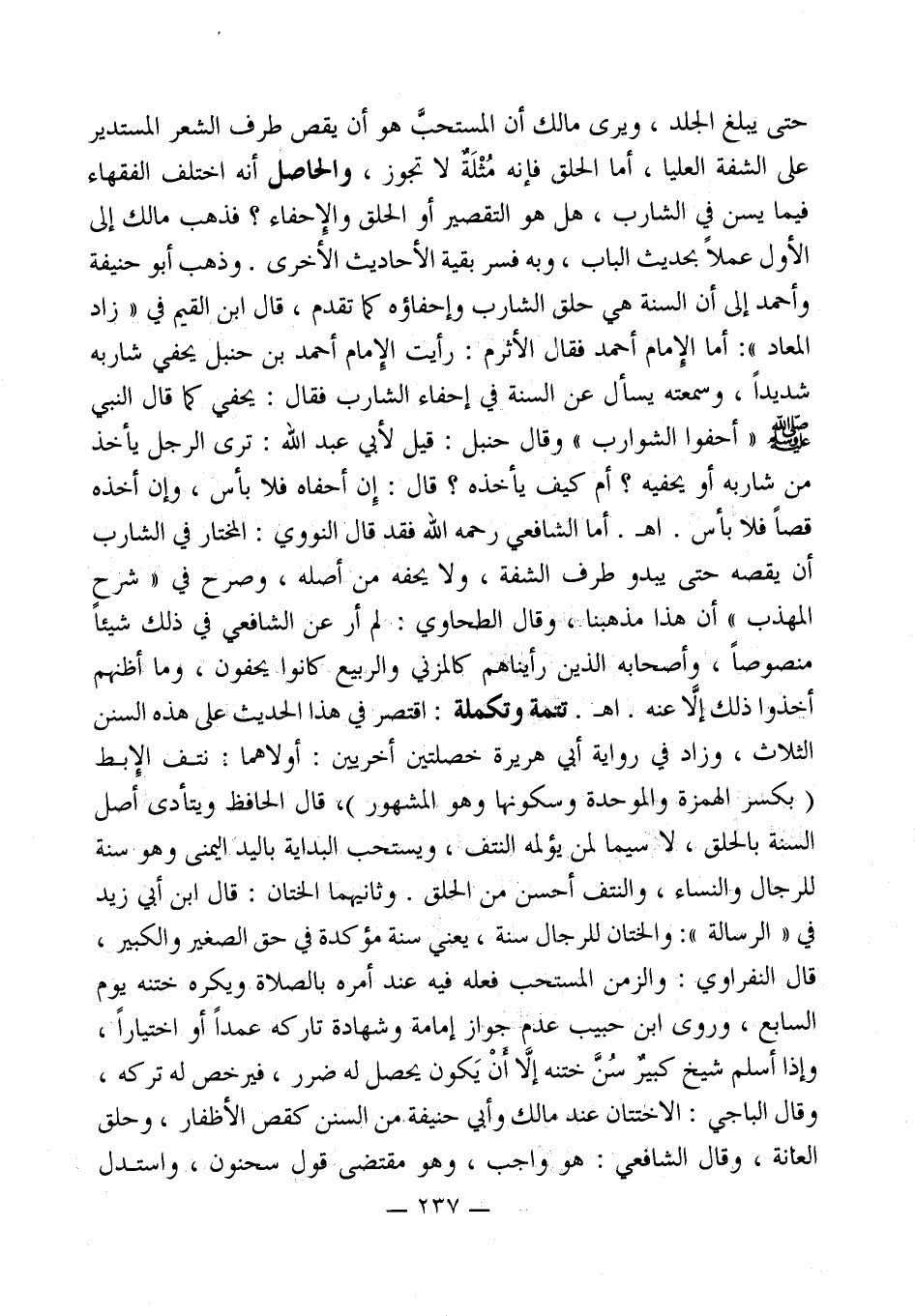 حتى يبلغ الجلد، ويرى ما إك أن المستحبَّ هو أن يقص طرف الشعر المستدير على الشفة العليا، أما الحلق، فإنه مُثْلَةٌ لا تجوز، والحاصل أنه اختلف الفقهاء فيما يسن في الشارب، هل هو التقصير أو الحلق والإحفاء؟ فذهب مالك إلى الأول عملاً بحديث الباب، وبه فسر بقية الأحاديث الأخرى. وذهب أبو حنيفة وأحمد إلى أن السنة هي حلق، الشارب وإحفاؤه كما تقدم، قال ابن القيم في " زاد المعاد ": أما الإمام أحمد فقال الأثرم: رأيت الإِمام أحمد بن حنبل يحفي شاربه شديداً، وسمعته يسأل عن السنة في إحفاء الشارب فقال: يحفي كما قال النبي - صلى الله عليه وسلم - " أحفوا الشوارب "، قال حنبل: قيل لأبي عبد الله: ترى الرجل يأخذ من شاربه أو يحفيه؟ أم كيف يأخذه؟ قال: إِن أحفاه فلا بأس، وإن أخذه قصاً فلا بأس. اهـ. أما الشافعي رحمه الله فقد قال النووي: المختار في الشارب أن يقصه حتى يبدو طرف الشفة، ولا يحفه من أصله، وصرح في " شرح المهذب " أن هذا مذهبنا، وقال الطحاوي: لم أر عن الشافعي في ذلك شيئاً منصوصاً، وأصحابه الذين رأيناهم كالمزني والربيع كانوا يحفون، وما أظنهم أخذوا ذلك إلَّا عنه. اهـ. تتمة وتكملة: اقتصر في هذا الحديث على هذه السنن الثلاث، وزاد في رواية أبي هريرة خصلتين أخريين: أولاهما: نتف الإبط (بكسر الهمزة والموحدة وسكونها وهو المشهور)، قال الحافظ ويتأدى أَصل السنة بالحلق، لا سيما لمن يؤلمه النتف، ويستحب البداية باليد اليمنى وهو سنة للرجال والنساء، والنتف أحسن من الحلق. وثانيهما الختان: قال ابن أبي زيد في " الرسالة ": والختان للرجال سنة، يعني سنة مؤكدة في حق الصغير والكبير، قال النفراوي: والزمن المستحب فعله فيه عند أمره بالصلاة ويكره ختنه يوم السابع، وروى ابن حبيب، عدم جواز إمامة وشهادة تاركه عمداً أو اختياراً، وإذا أسلم شيخ كبيرٌ سُنَّ ختنه إلَّا أنْ يَكون يحصل له ضرر، فيرخص له تركه، وقال الباجي: الاختتان عند مالك وأبي حنيفة من السنن كقص الأظفار، وحلق العانة، وقال الشافعي: هو واجب، وهو مقتضى قول سحنون، واستدل