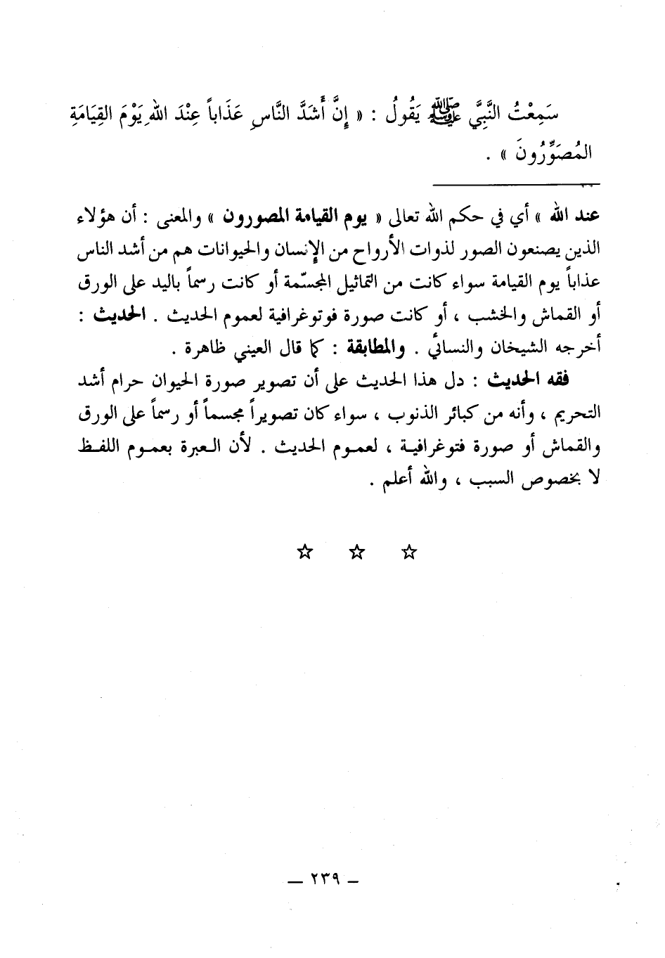 فقه الحديث: دل هذا الحديث على أن تصوير صورة الحيوان حرام أشد التحريم، وأنه من كبائر الذنواب، سواء كان تصويراً مجسماً أو رسماً على الورق والقماش أو صورة فتوغرافية، لعموم الحديث. لأن العبرة بعموم اللفظ لا بخصوص السبب، والله أعلم.